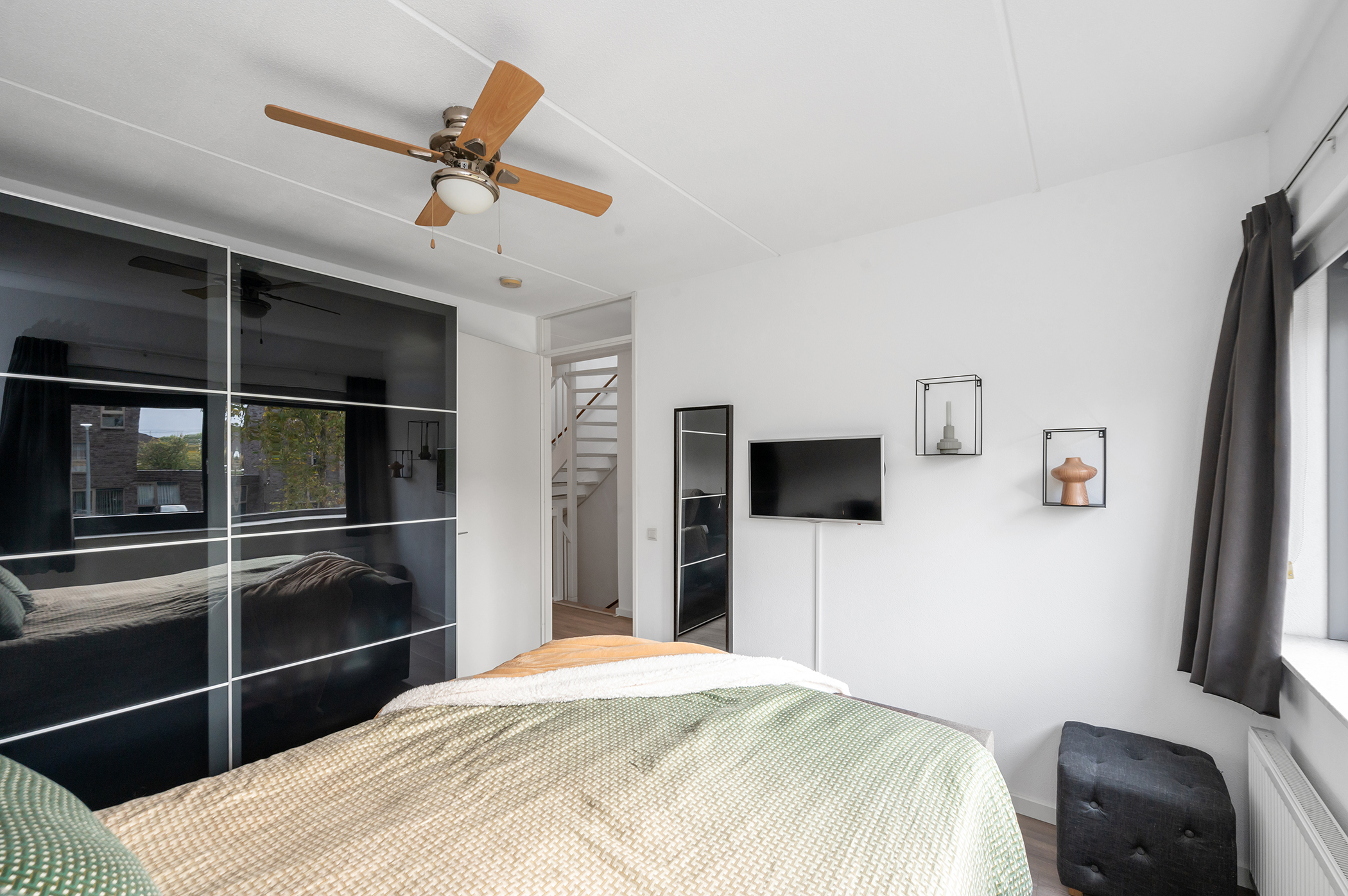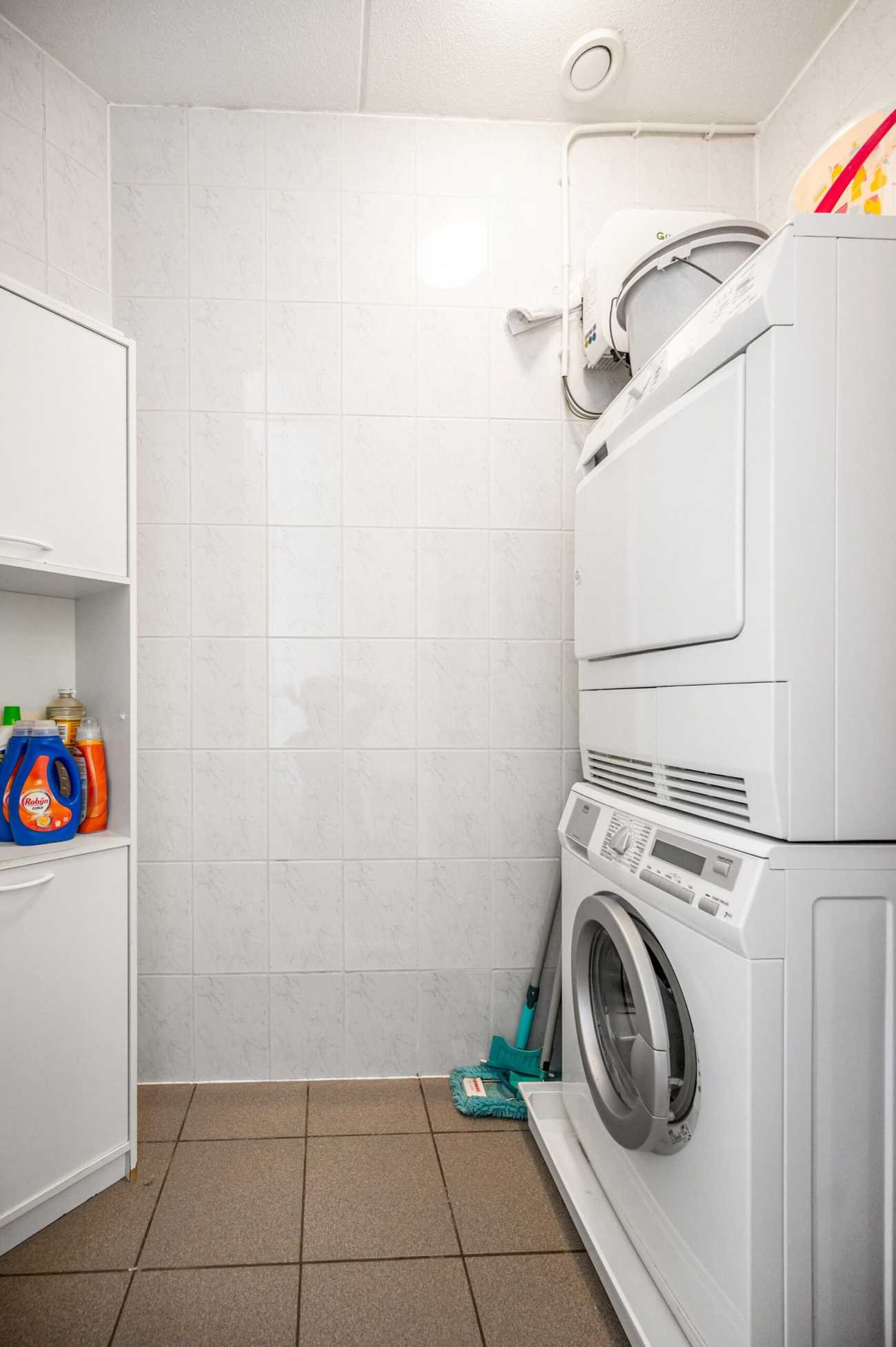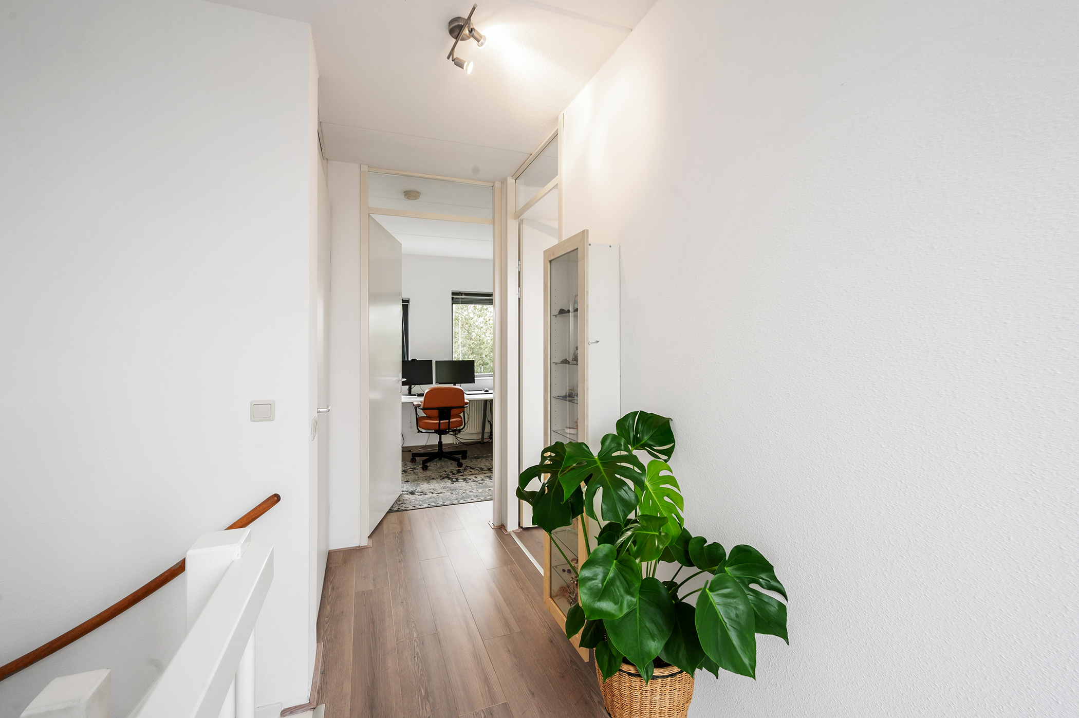 Spacious landing with wonderful natural light through the window. From the landing, you have access to three bedrooms, the bathroom, a separate toilet, and a separate laundry room. The bedrooms are of various sizes, two of which are located at the rear of the house. The neat bathroom is fully tiled and equipped with a shower, vanity, and a spacious double bathtub. The separate toilet is very convenient, creating extra space in the bathroom. The entire floor has laminate flooring.