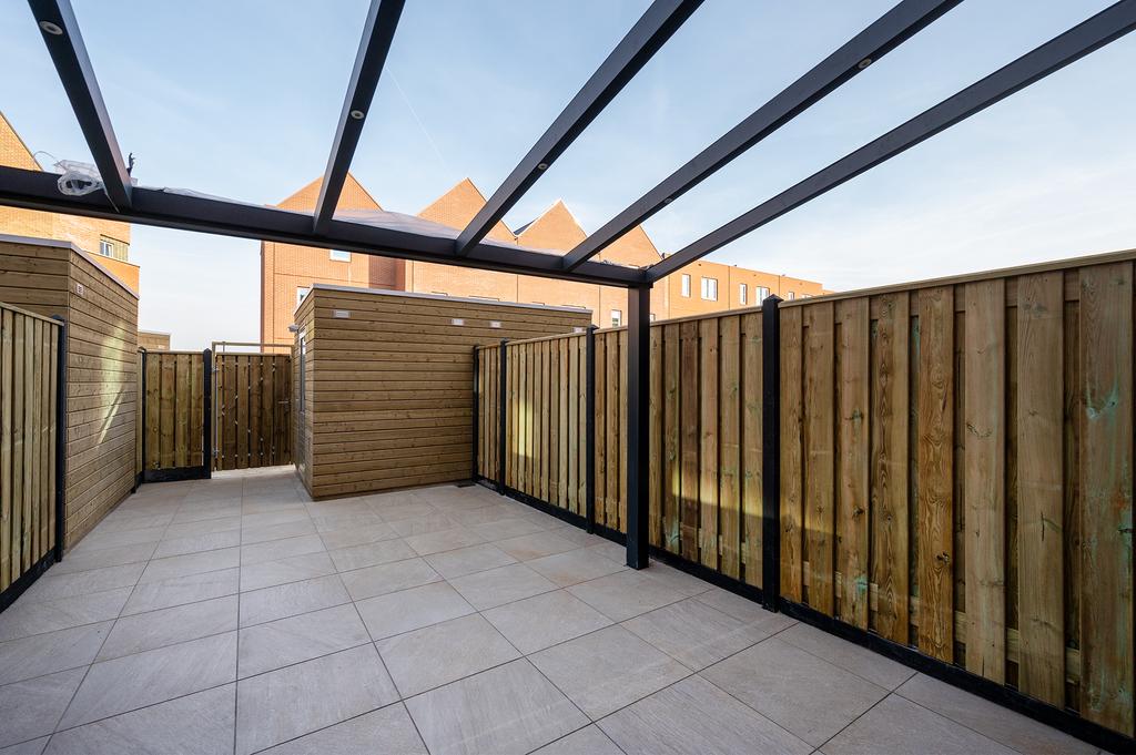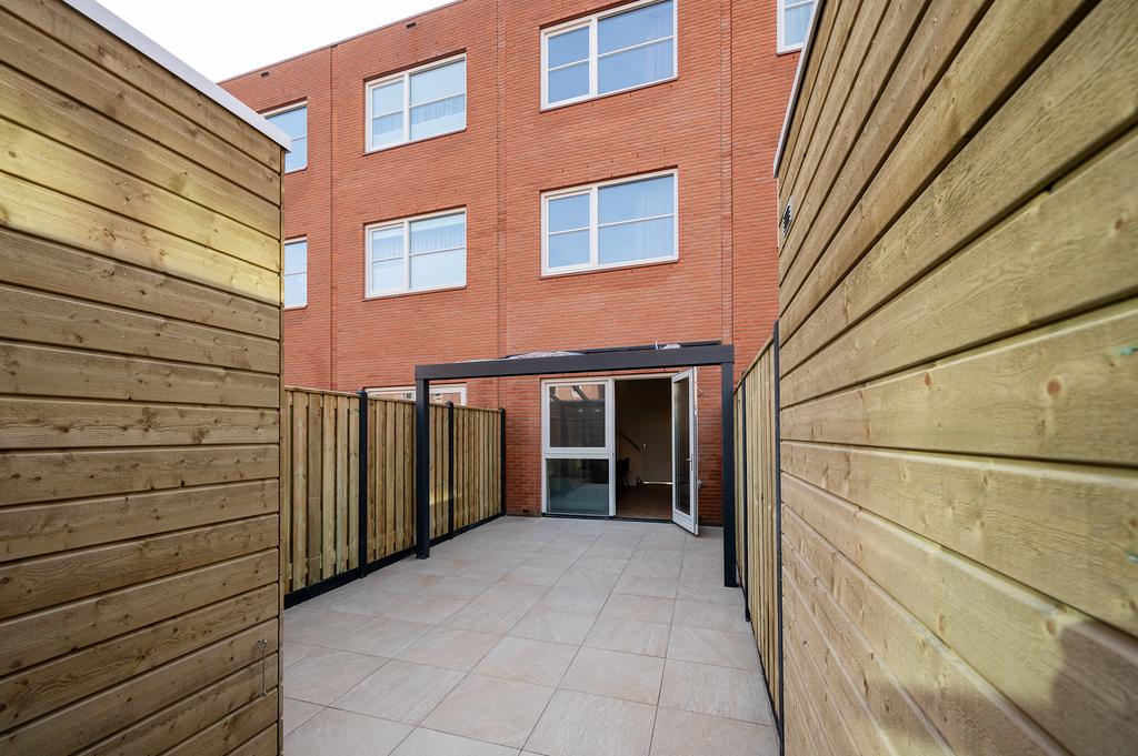 De tuin sluit aan op de woonkamer en is voorzien van keramische tegels en een veranda. De gehele begane grond is voorzien van een visgraat laminaat vloer en vloerverwarming.