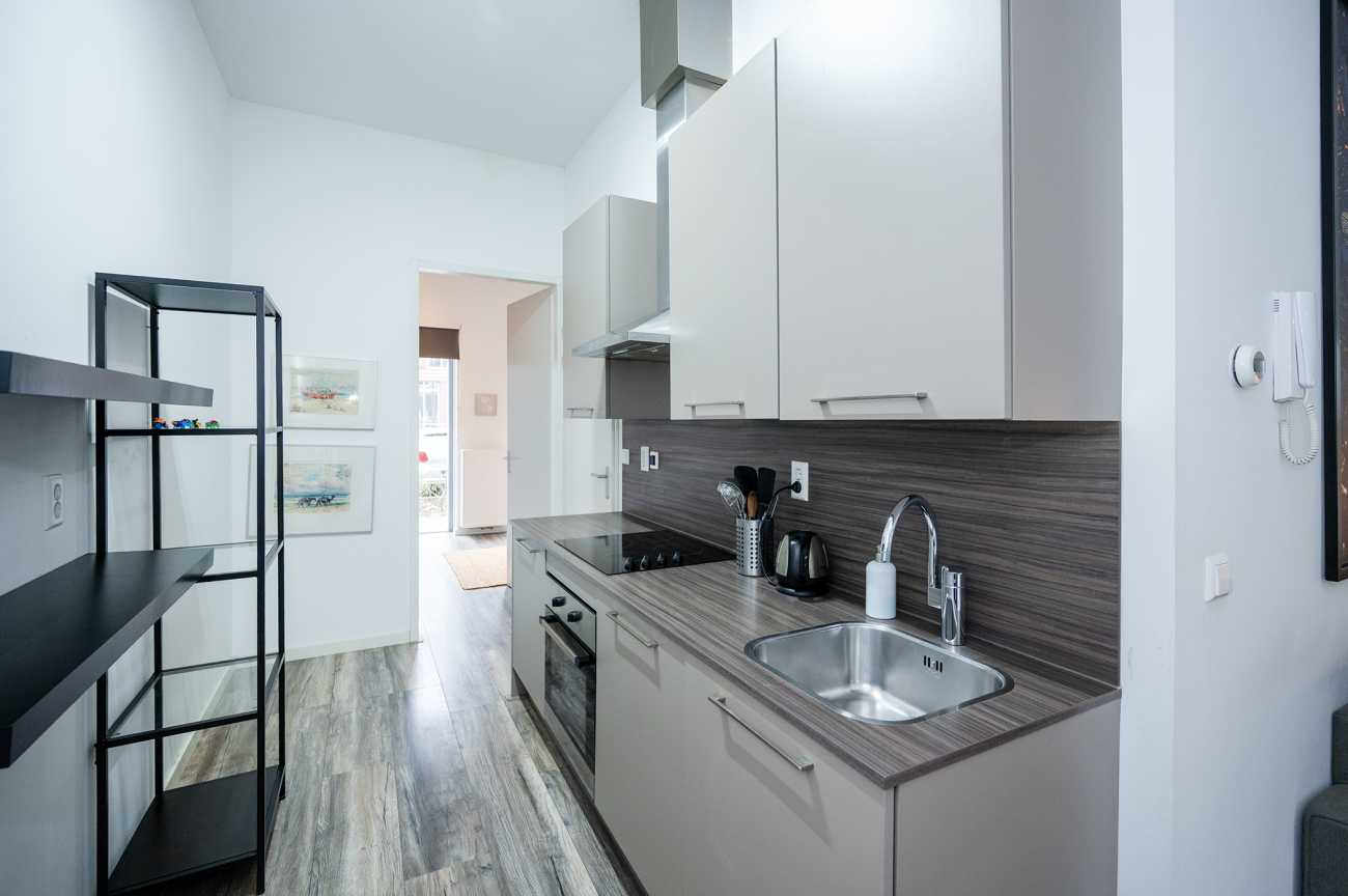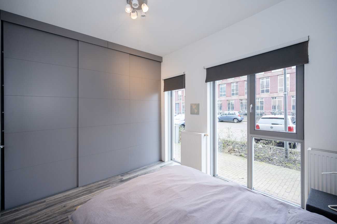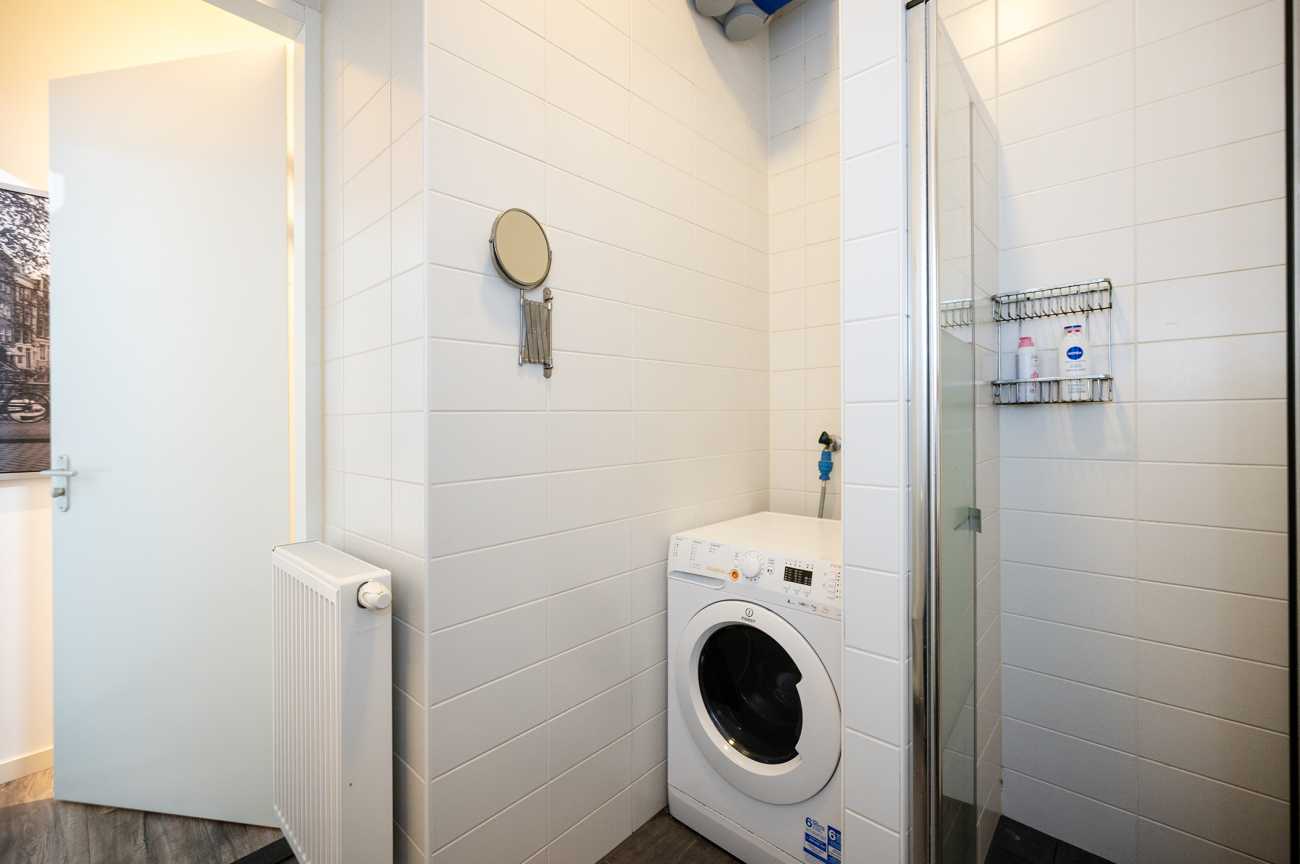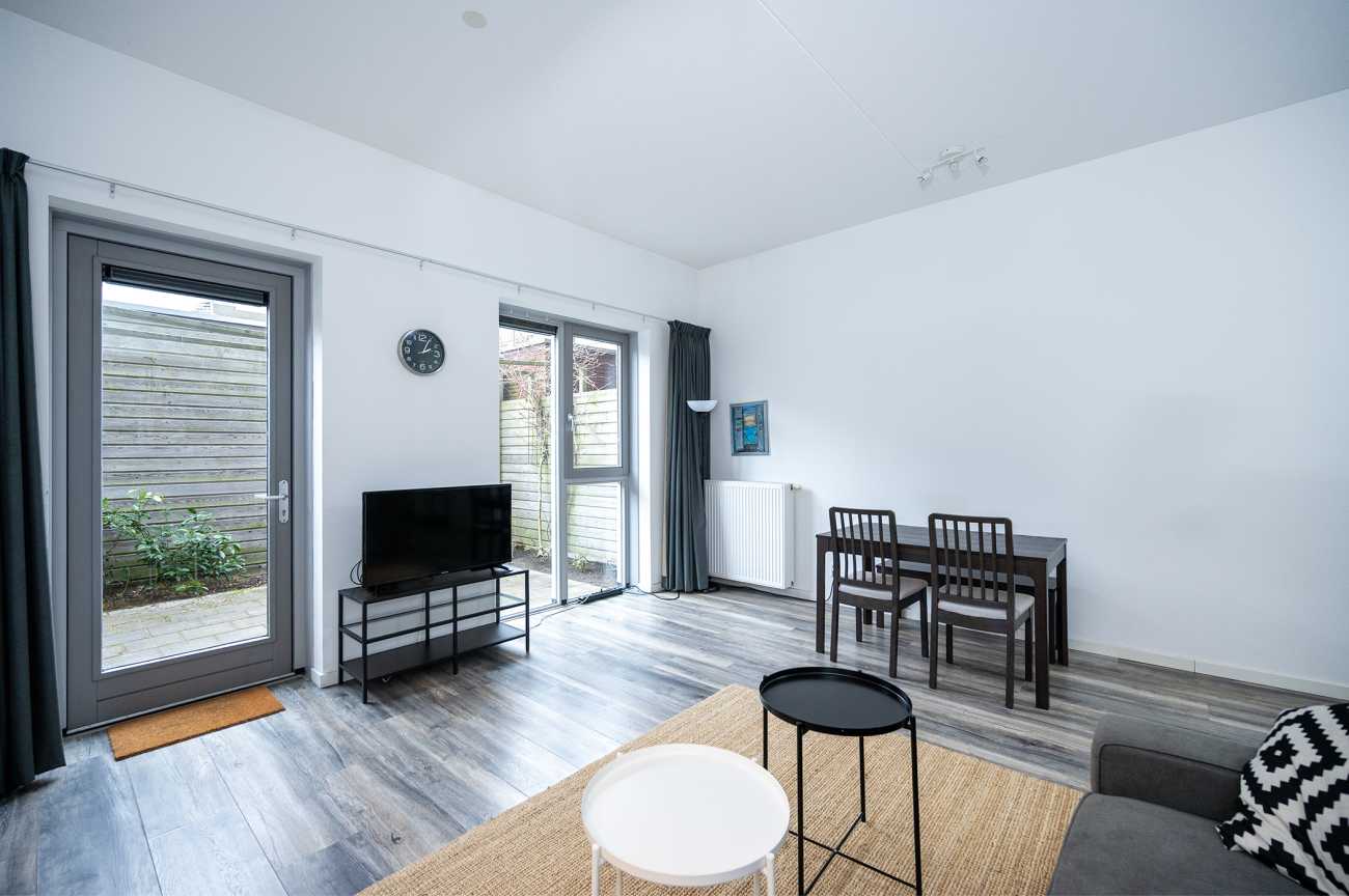 Through the entrance, you enter the hall with access to the meter cupboard, bathroom, bedroom, and open-plan kitchen with living room. The cozy living room faces the garden, and the high ceilings give the apartment a spacious feel. A patio door leads to the back garden with a storage shed. Here you can relax and enjoy the outdoors. The open-plan kitchen is centrally located in the house and features various built-in appliances, including a dishwasher, fridge-freezer, hob, extractor fan, and ample storage space. The fully tiled bathroom has a walk-in shower, sink, wall-hung toilet, radiator, and washing machine connection. The spacious bedroom is located at the front of the house, spanning the entire width of the house. This room features a custom-made, wall-to-wall wardrobe. Its height provides ample storage space, making it ideal for storing everything. The entire apartment has neat laminate flooring.