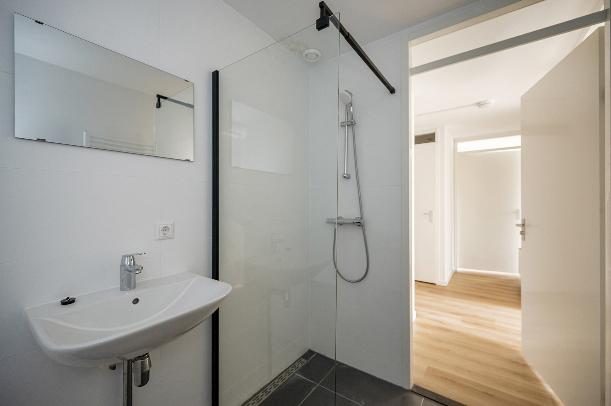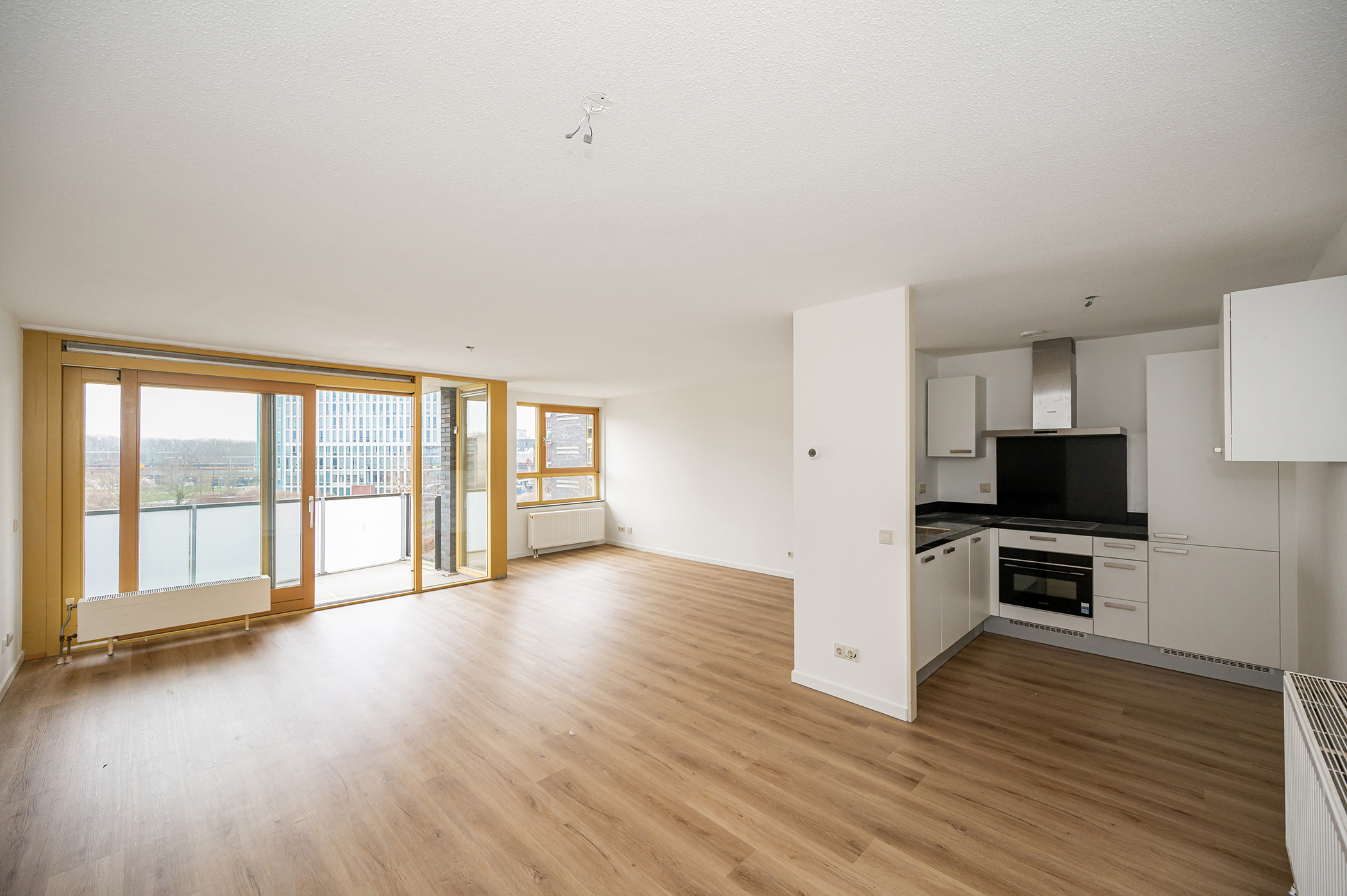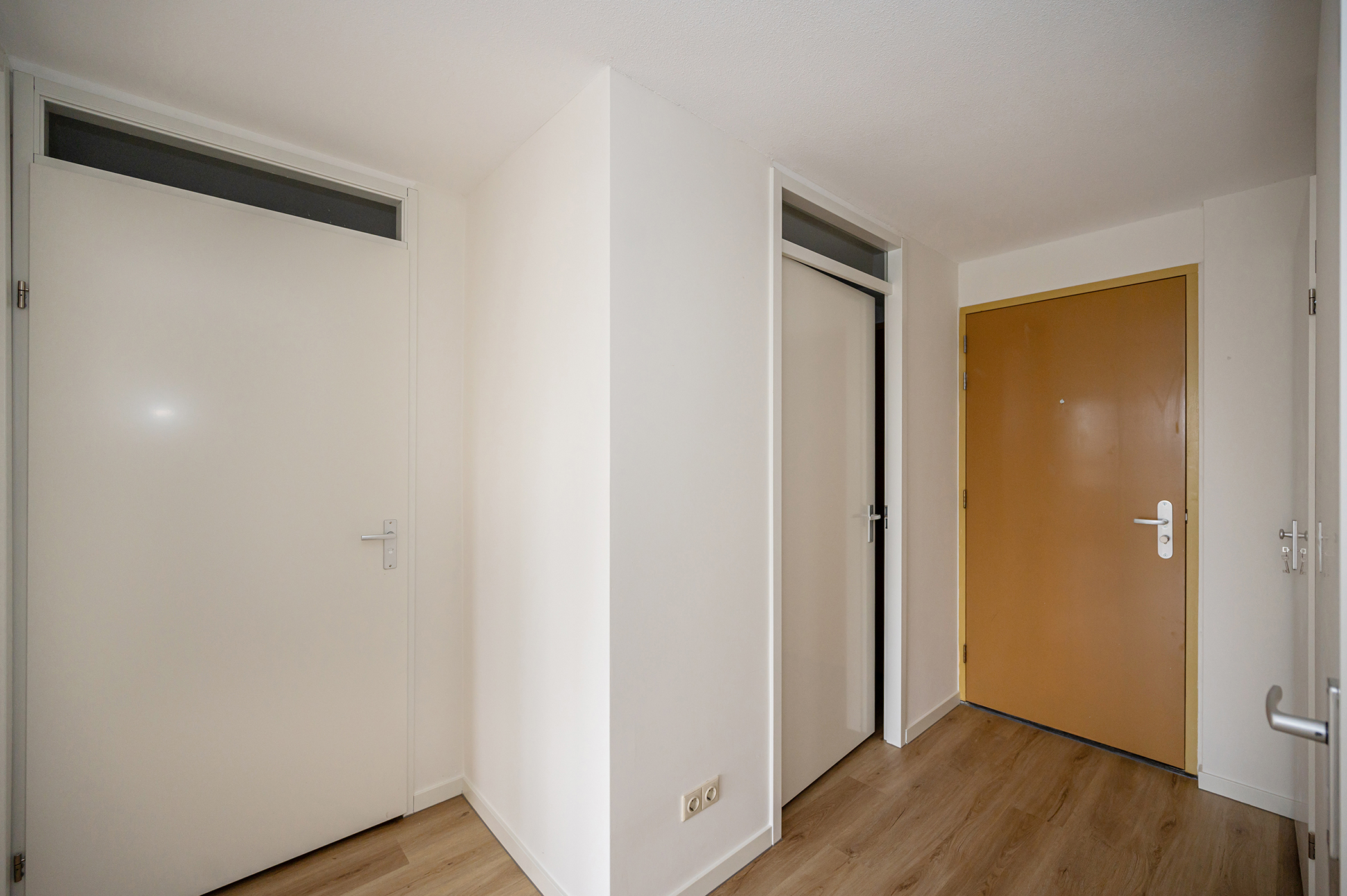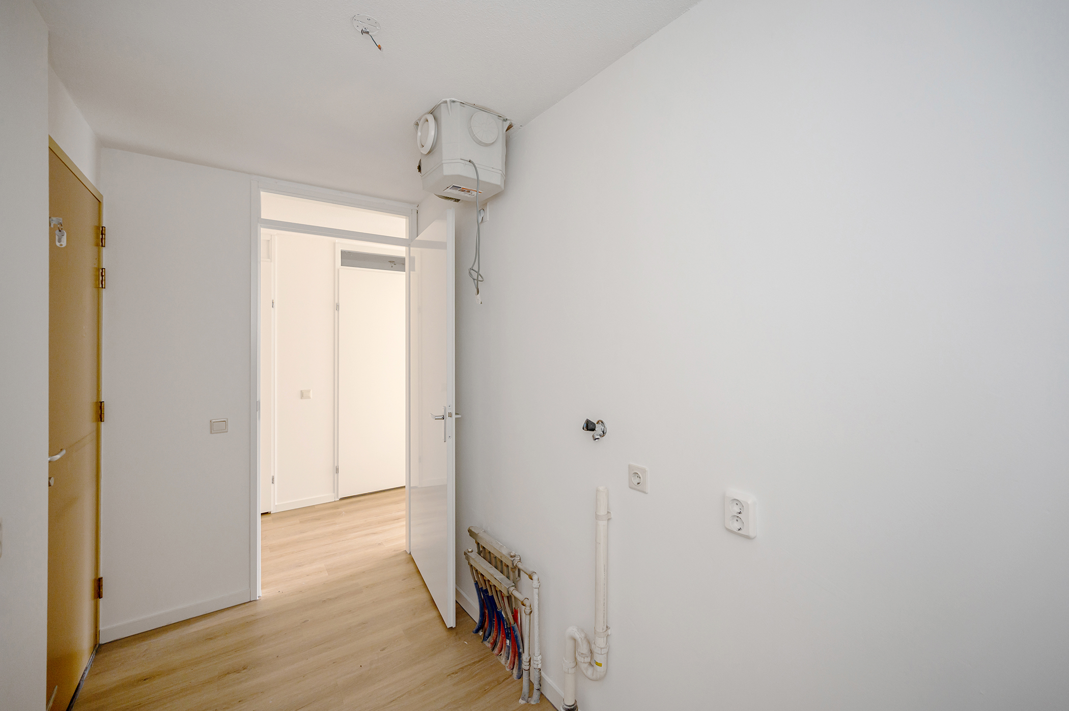 Binnenkomst in de hal met toegang tot een inpandige berging met mechanische ventilatie en een separaat toilet met fonteintje. Vanuit de hal bereikt u de twee ruime slaapkamers, variërend in grootte. De lichte woonkamer, met grote raampartijen, biedt toegang tot het ruime balkon met uitzicht op de stad. De keuken is uitgerust met een vaatwasser, oven en een kookplaat. De woning is voorzien van een laminaatvloer. De badkamer is volledig betegeld en voorzien van een ligbad, aparte douche, een wastafel en een spiegel.