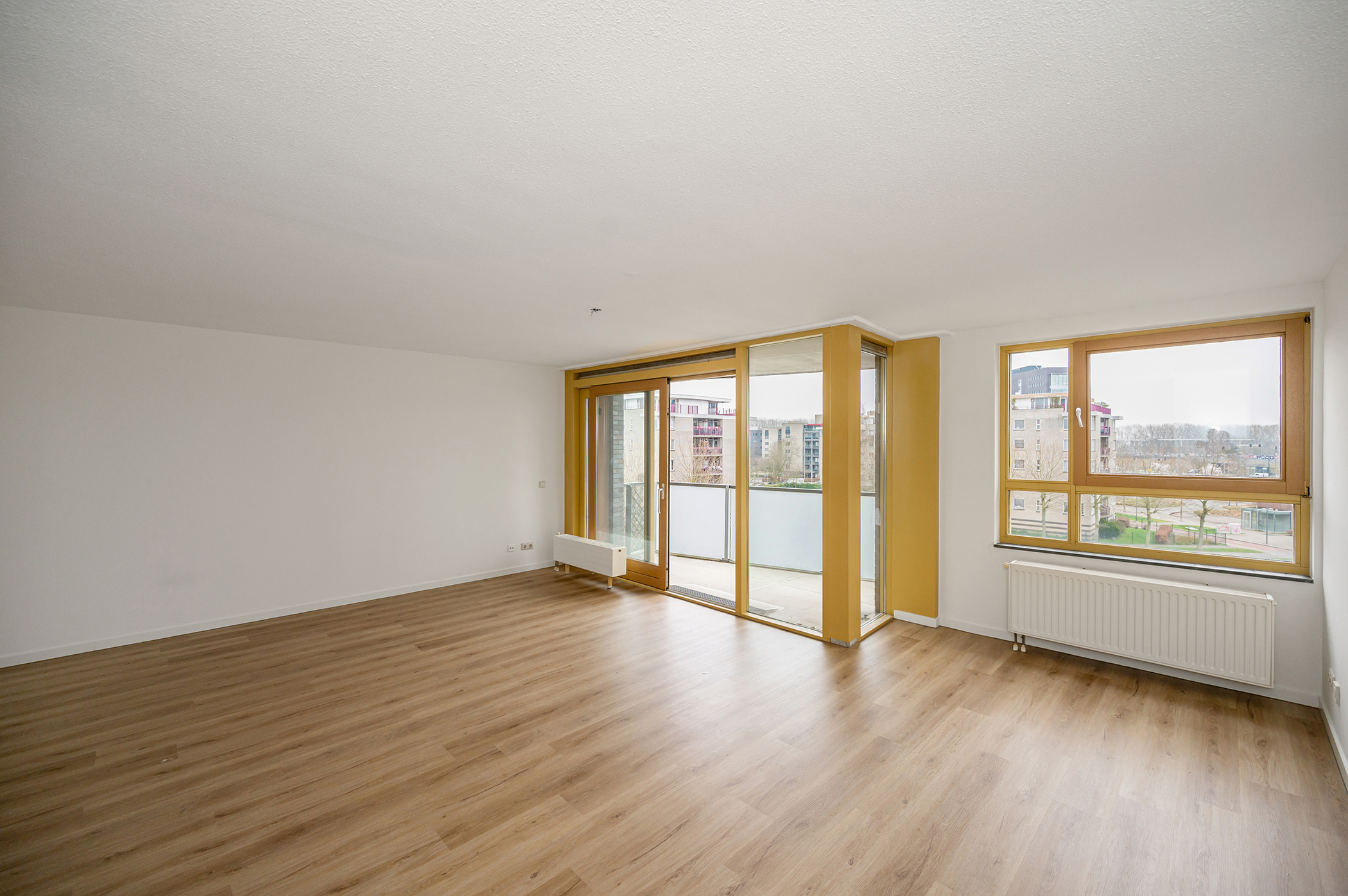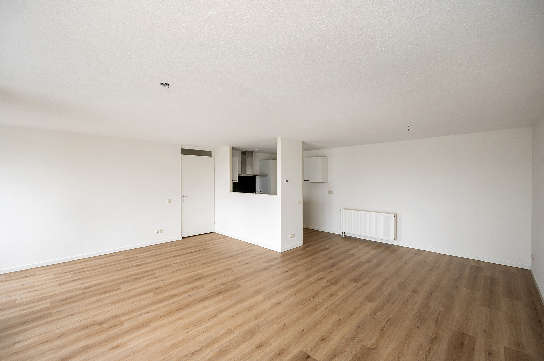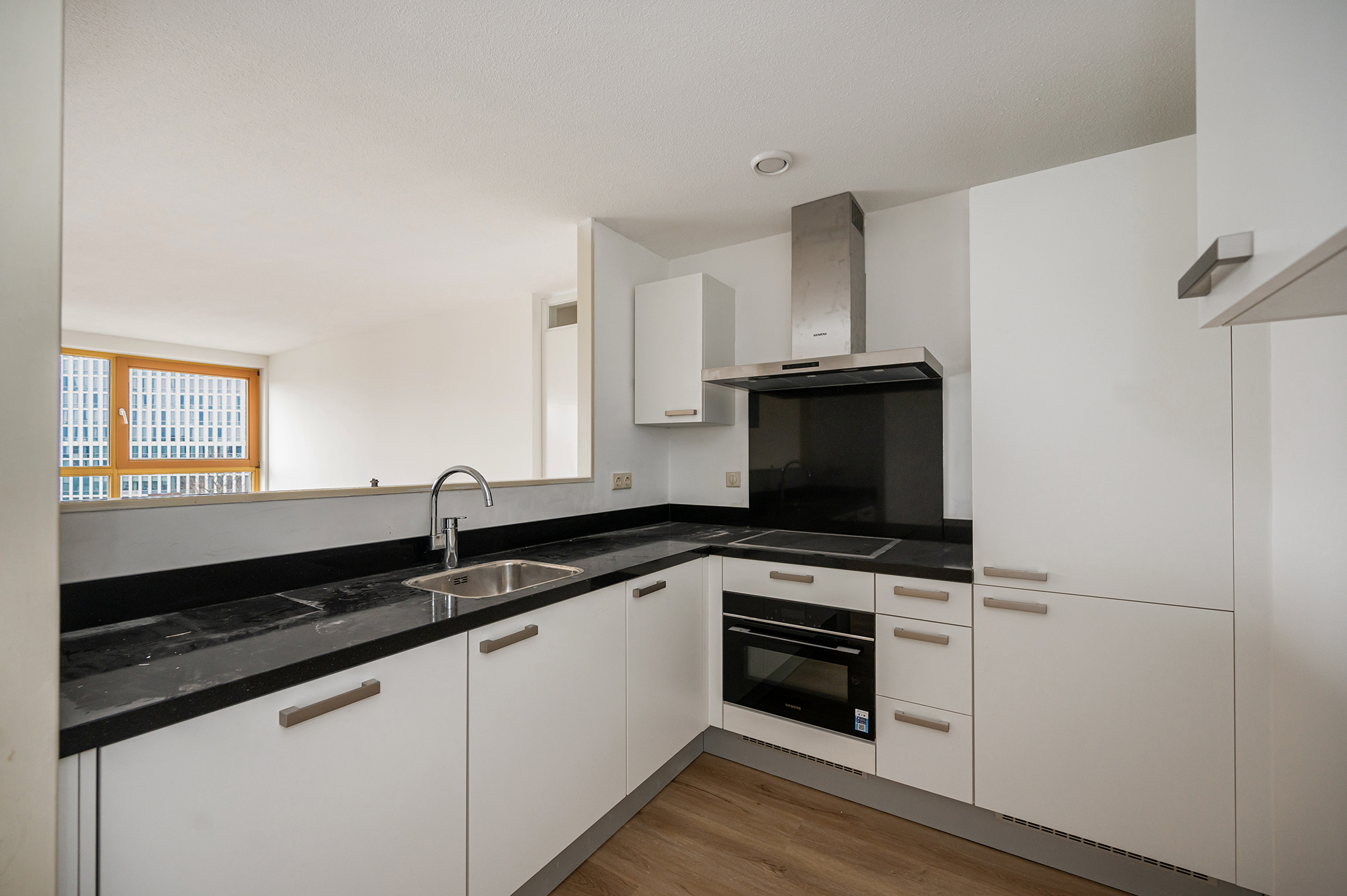 Binnenkomst in de hal met toegang tot een inpandige berging met mechanische ventilatie en een separaat toilet met fonteintje. Vanuit de hal bereikt u de twee ruime slaapkamers, variërend in grootte. De lichte woonkamer, met grote raampartijen, biedt toegang tot het ruime balkon met uitzicht op de stad. De keuken is uitgerust met een vaatwasser, oven en een kookplaat. De woning is voorzien van een laminaatvloer. De badkamer is volledig betegeld en voorzien van een ligbad, aparte douche, een wastafel en een spiegel.