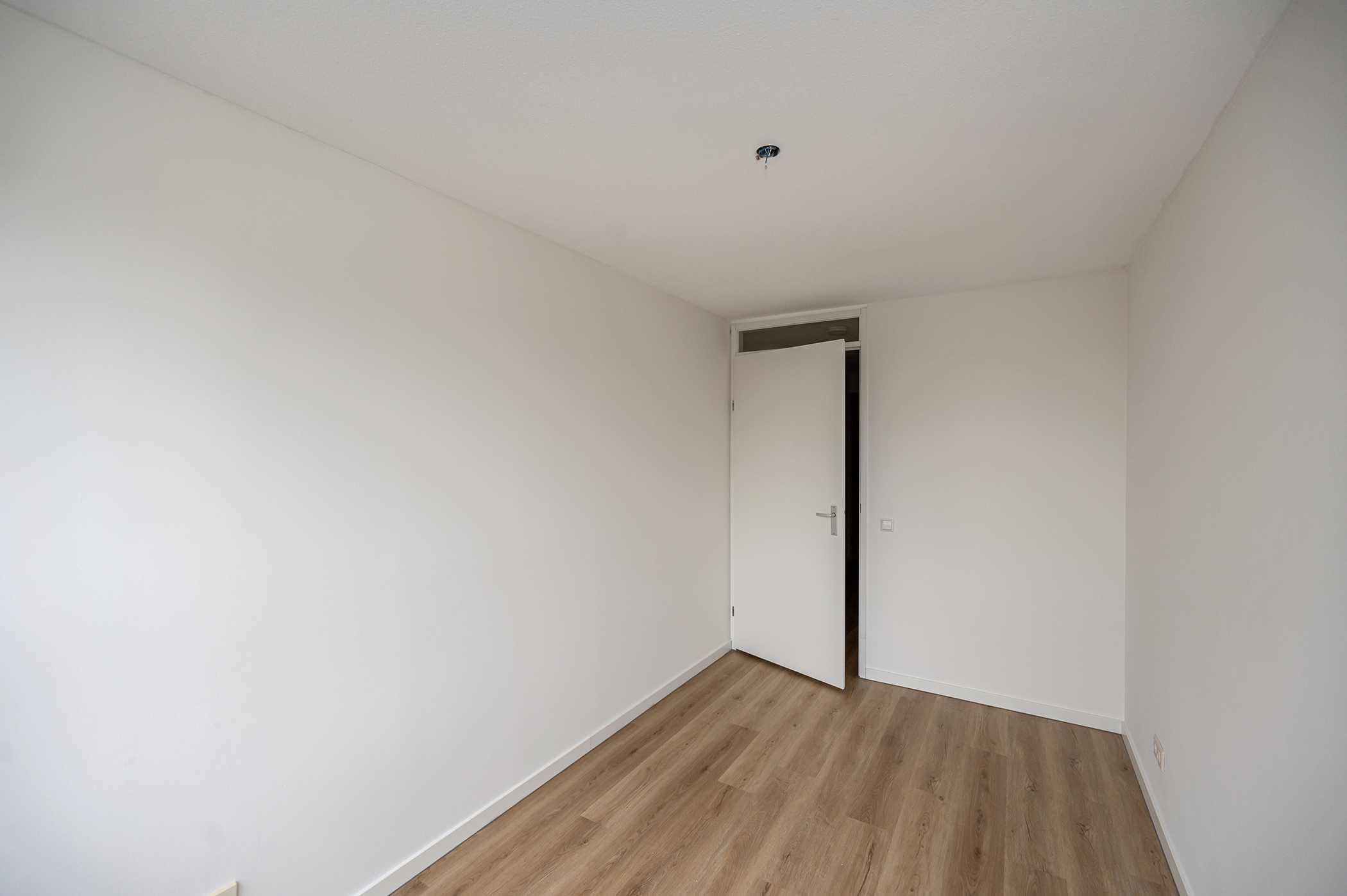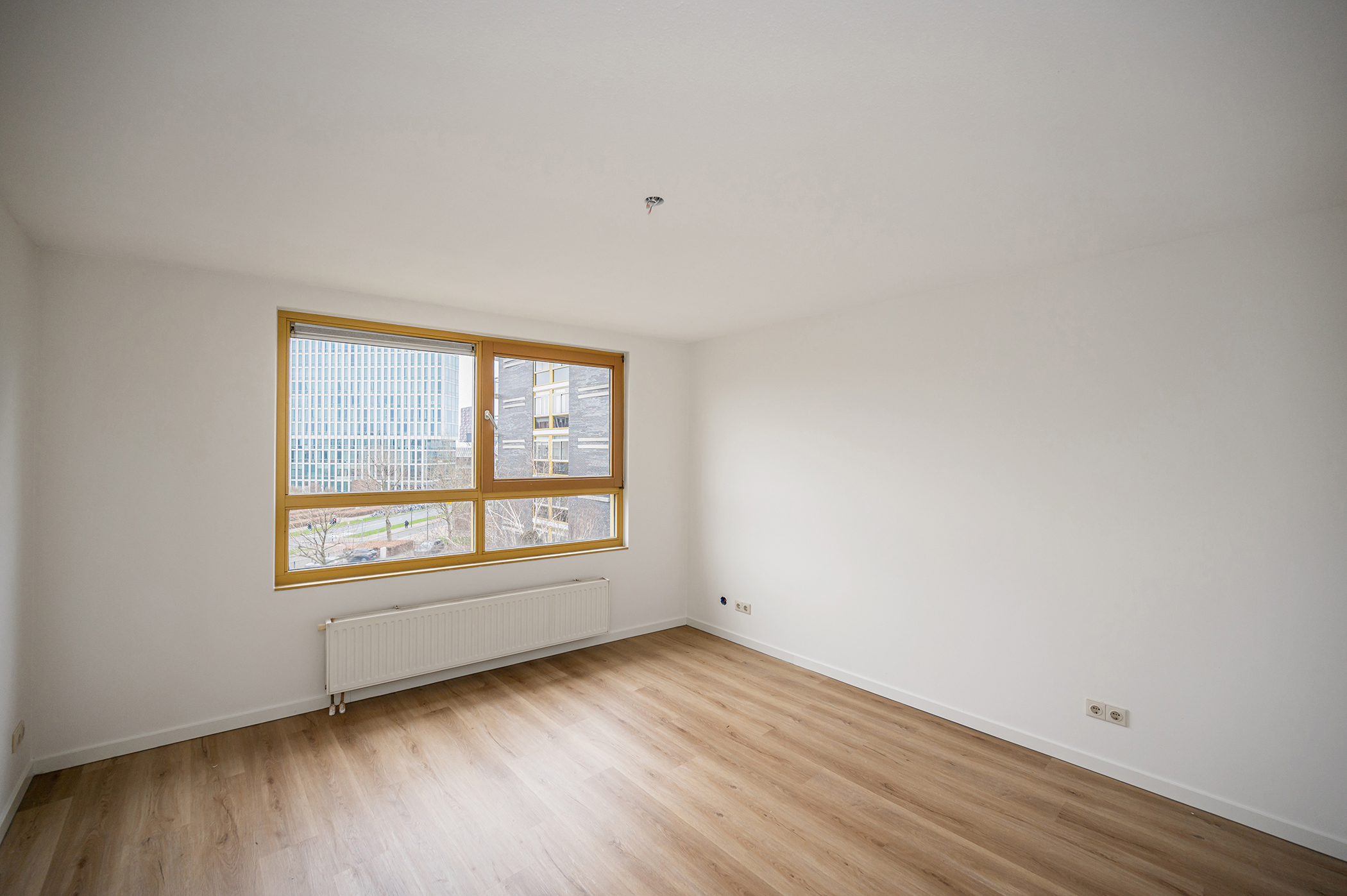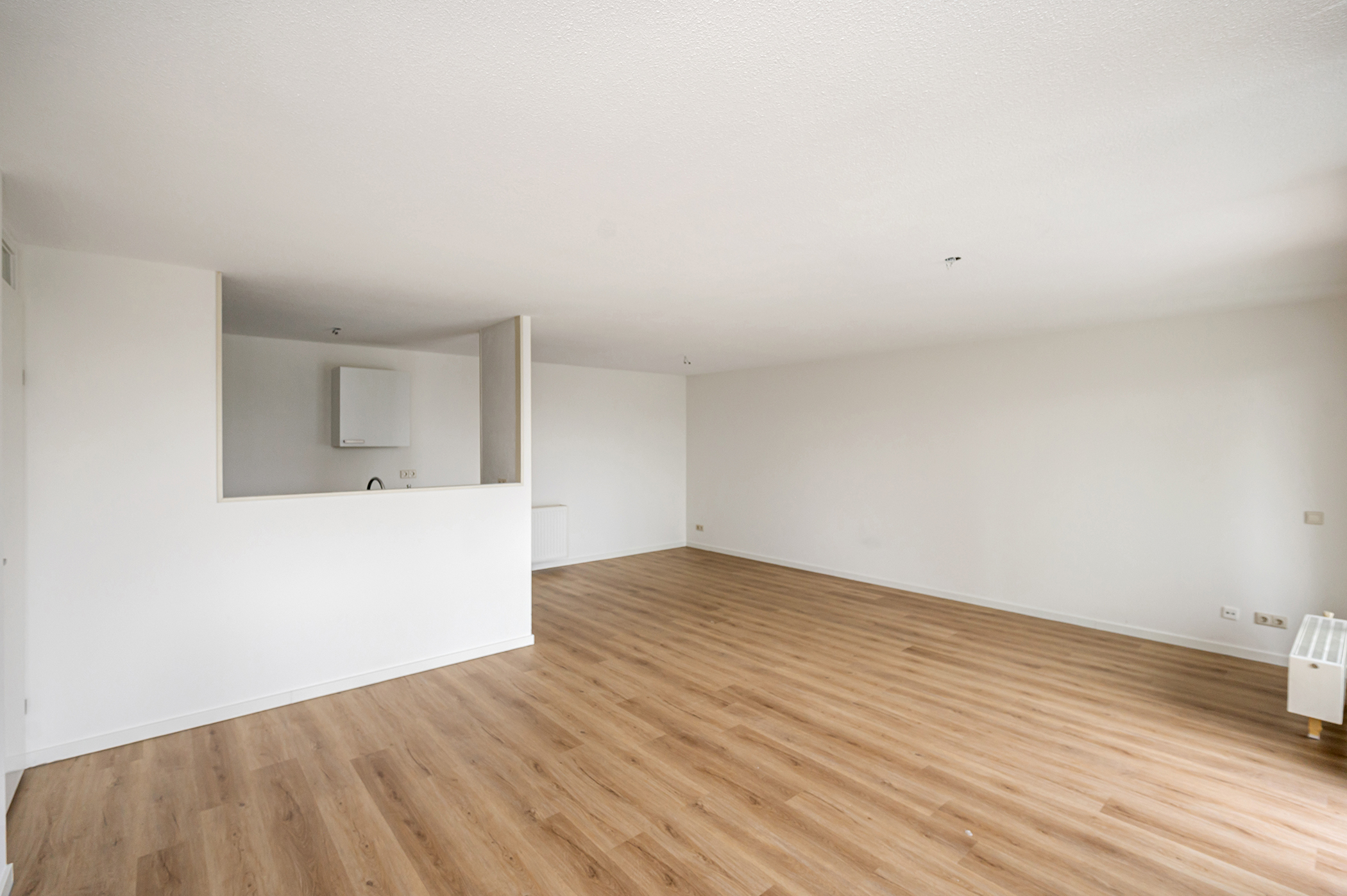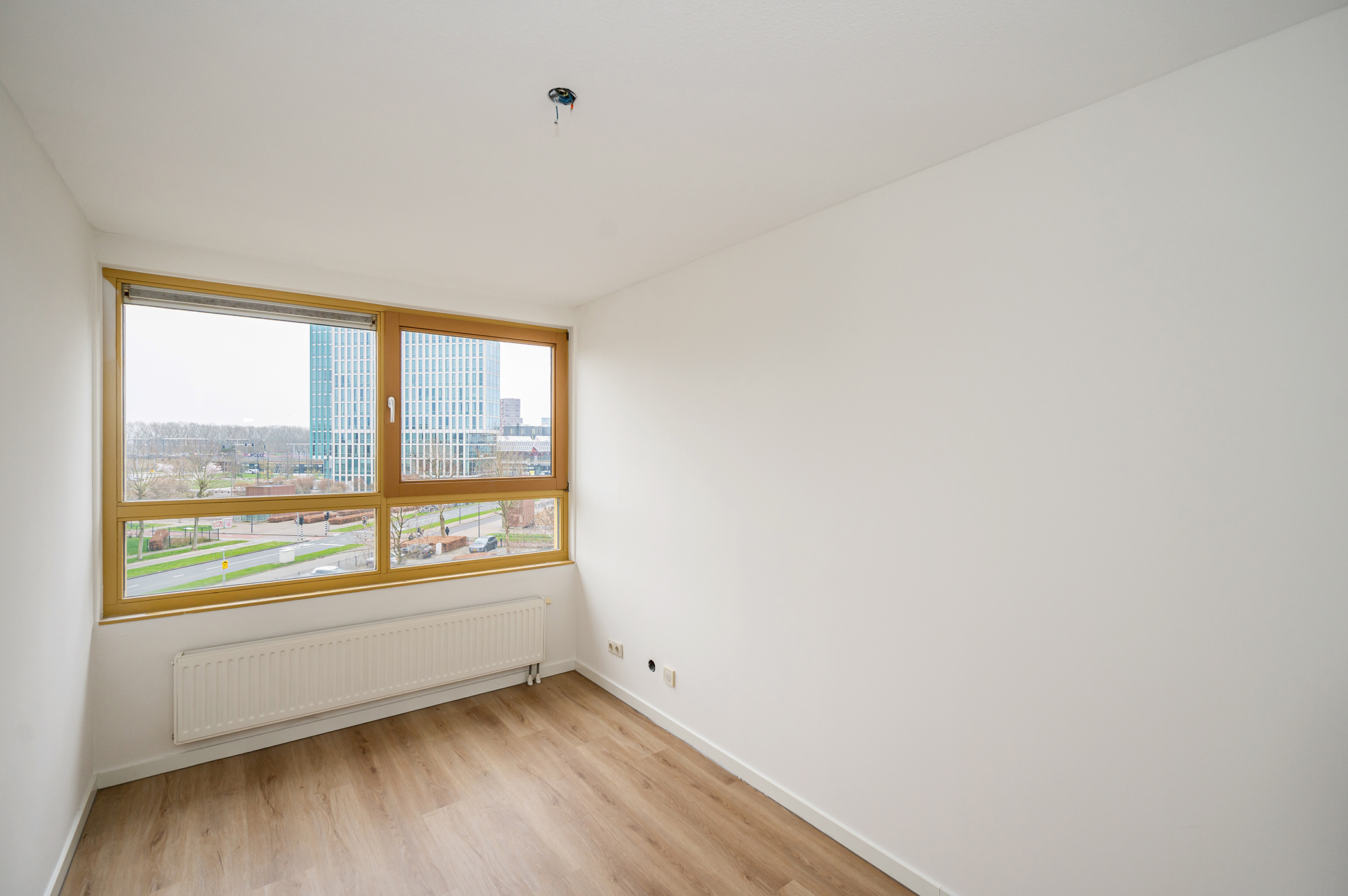 Binnenkomst in de hal met toegang tot een inpandige berging met mechanische ventilatie en een separaat toilet met fonteintje. Vanuit de hal bereikt u de twee ruime slaapkamers, variërend in grootte. De lichte woonkamer, met grote raampartijen, biedt toegang tot het ruime balkon met uitzicht op de stad. De keuken is uitgerust met een vaatwasser, oven en een kookplaat. De woning is voorzien van een laminaatvloer. De badkamer is volledig betegeld en voorzien van een ligbad, aparte douche, een wastafel en een spiegel.