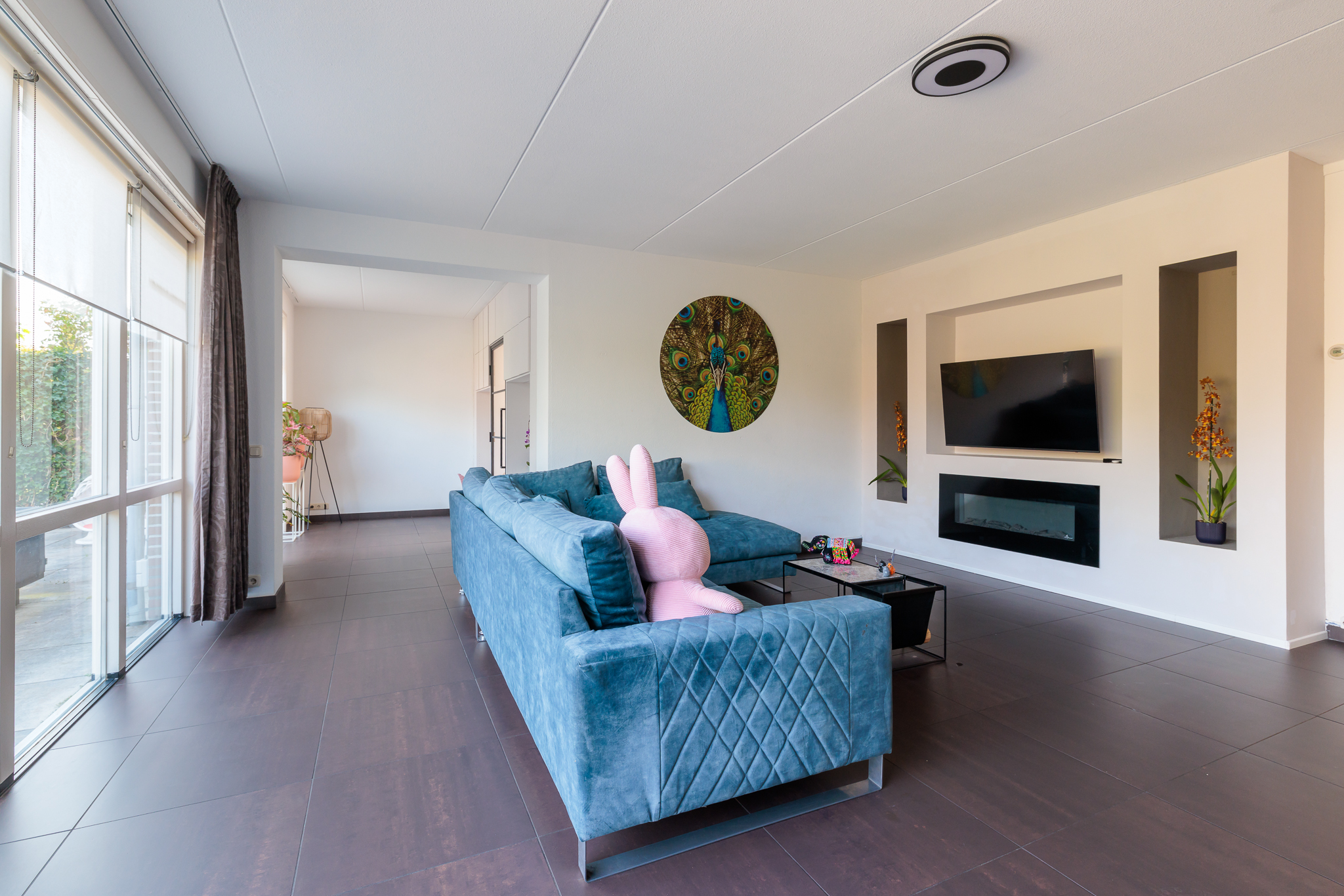The house features a spacious hallway with access to the toilet, fitted with wall-hung sanitary ware, the meter cupboard, and the staircase to the first floor. The spacious, extended living room and kitchen-diner are accessible from the hallway. At the front of the house is the beautiful kitchen-diner with a large kitchen island and a natural stone countertop with a breakfast bar. The kitchen offers ample storage space and is equipped with various built-in appliances, including a refrigerator, freezer, dishwasher, oven, and induction cooktop with extractor hood. Next to the kitchen, there is ample space for a dining table and chairs, making this space ideal for both cooking and dining. The large bay windows make this a wonderful place to relax. The extended, spacious living room, which faces the garden, is accessible from the kitchen. This living room is bright and spacious. There is plenty of room for a large sofa, and the large windows offer a lovely view of the backyard. A cinema wall with an electric fireplace adds to the ambiance. There are also French doors leading to the back garden, which is very pleasant on warmer days. A big plus is the extra room next to the living room on the ground floor, which is currently used as a study.This space can be closed off with a stylish steel door and can easily be used as an extra bedroom or perhaps a playroom for the little ones. Ideal if you want to keep the living room tidy! Because this room is also accessible from outside, it can also be used as a living room or home office, for example. The entire ground floor is finished with a tiled floor with underfloor heating.