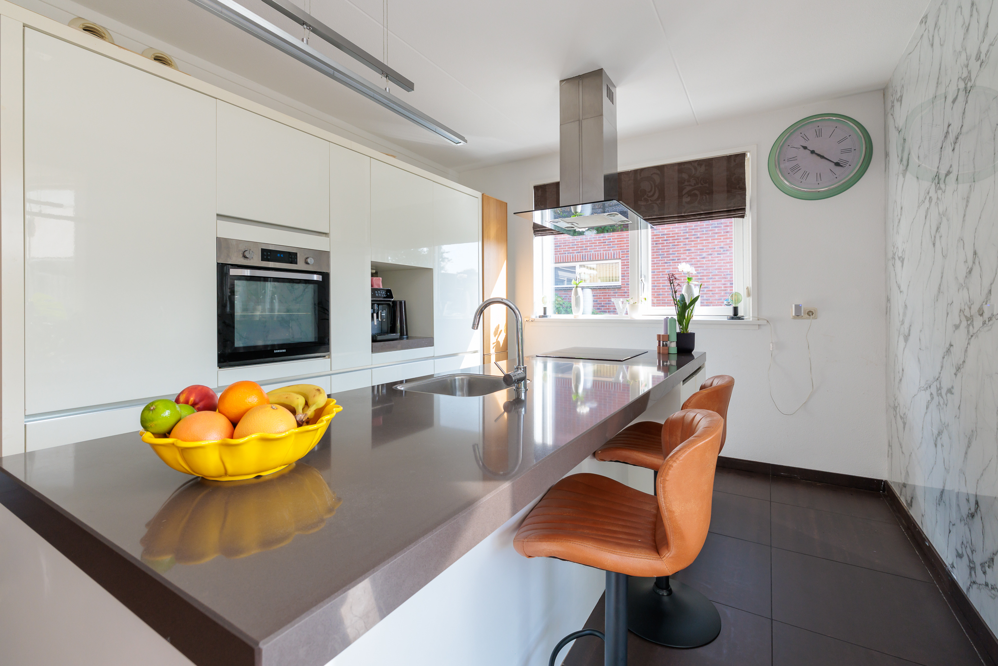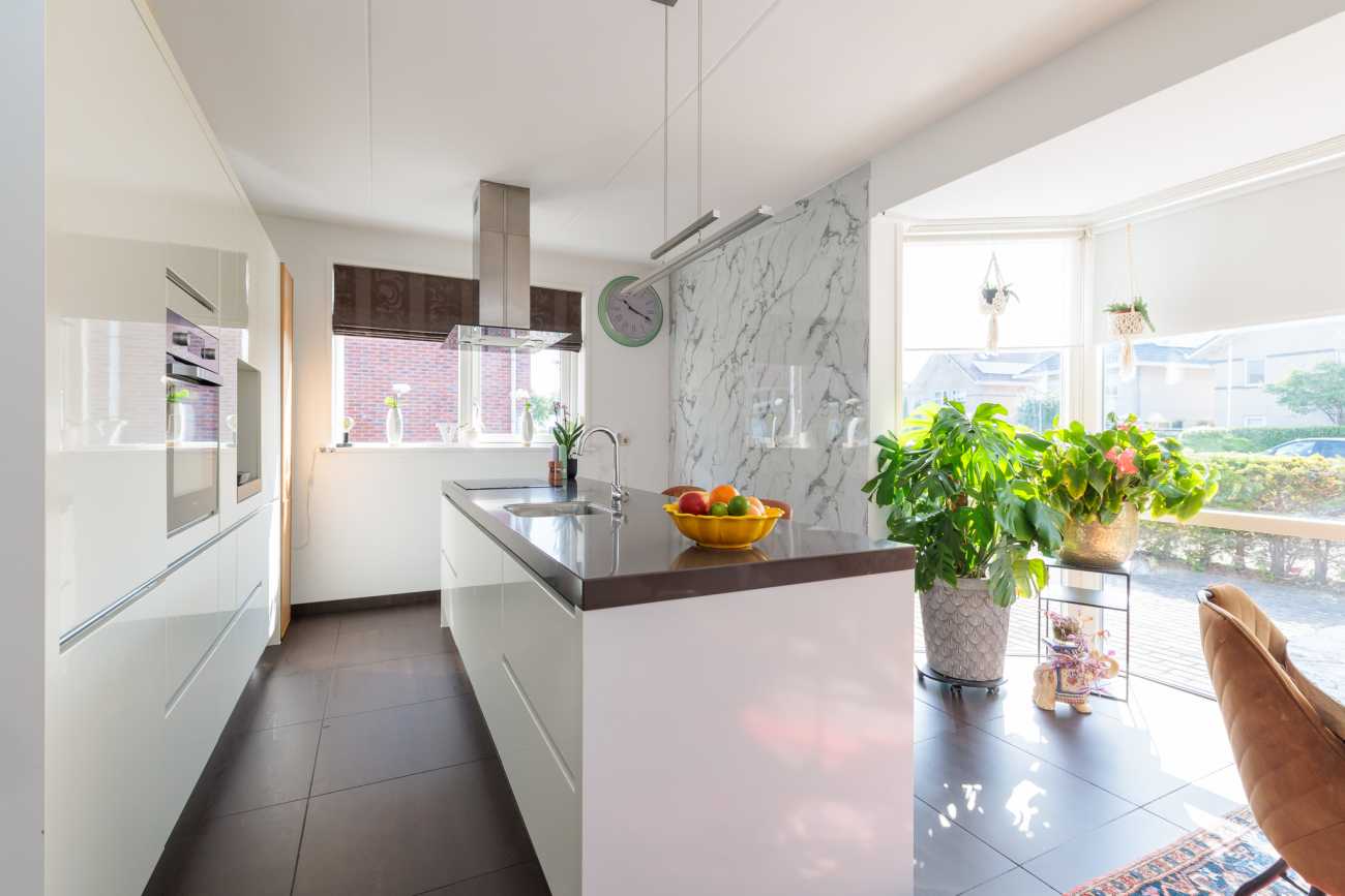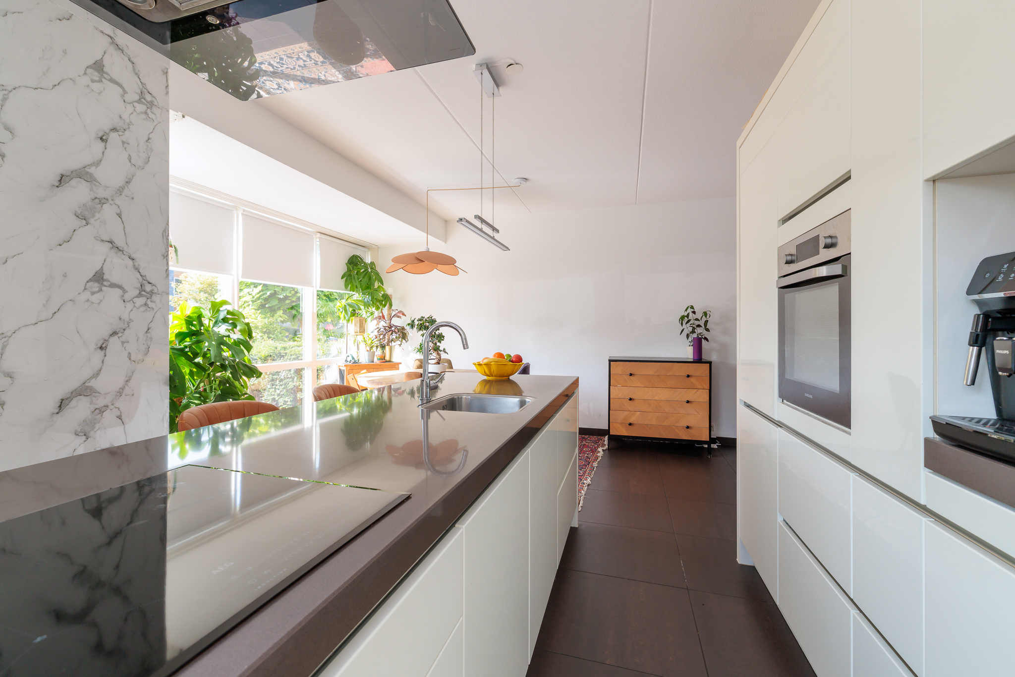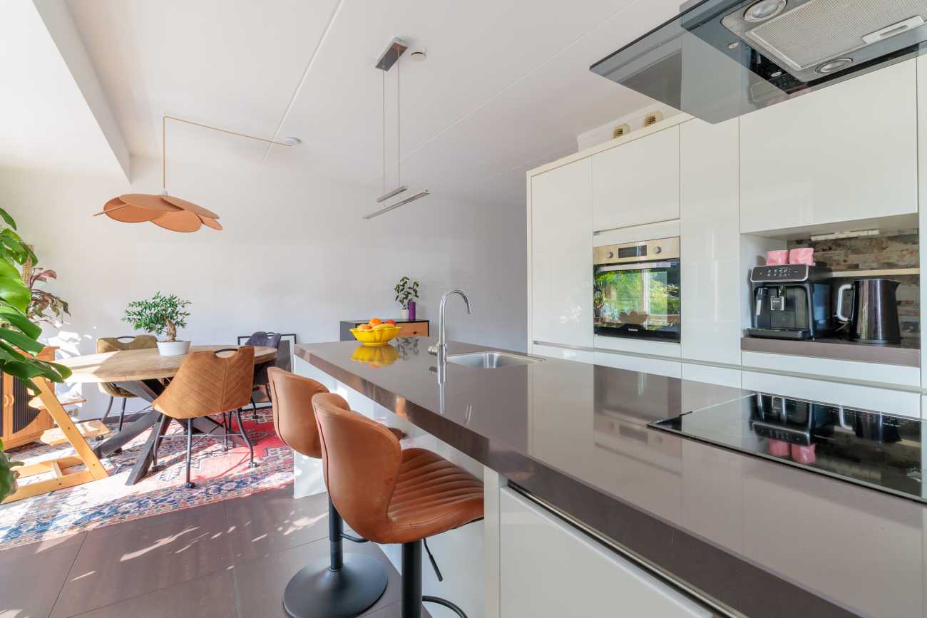 De woning beschikt over een ruime hal met toegang tot het toilet, voorzien van vrijhangend sanitair, de meterkast en geeft toegang tot de trapopgang naar de eerste verdieping. Vanuit de hal is de ruime uitgebouwde woonkamer en woonkeuken te bereiken. Aan de voorzijde van de woning bevindt zich de fraaie woonkeuken met een groot kookeiland en een natuurstenen aanrechtblad met bar. De keuken heeft veel opbergruimte en is voorzien van diverse inbouwapparatuur, waaronder een koelkast, vriezer, vaatwasser, oven en inductie kookplaat met afzuigschouw. Naast het kookeiland is er voldoende ruimte voor het plaatsen van een eettafel met stoelen, waardoor deze ruimte uitstekend geschikt is voor zowel koken als dineren. Door de grote raampartijen van de erker is dit een heerlijke plek om te vertoeven. Vanuit de keuken is de uitgebouwde, ruime tuingerichte woonkamer bereikbaar. Deze woonkamer is licht en ruim van opzet. U heeft hier genoeg ruimte om een grote bank te plaatsen en kijkt door de grote raampartijen leuk uit op de achtertuin. Er is een cine wall met elektrische haard aanwezig, wat voor extra sfeer zorgt. Tevens zijn er openslaande deuren naar de achtertuin, wat heel fijn is tijdens de warmere dagen. Een groot pluspunt is de extra kamer naast de woonkamer op de begane grond, die momenteel als werkkamer is ingericht. Deze ruimte is afsluitbaar middels een hippe stalen deur en kan eenvoudig worden gebruikt als extra slaapkamer of wellicht als speelkamer voor de kleintjes. Ideaal als u de woonkamer opgeruimd wilt houden dus! Doordat deze kamer ook vanaf de buitenzijde te betreden is, kan hij ook voor bv. een salon