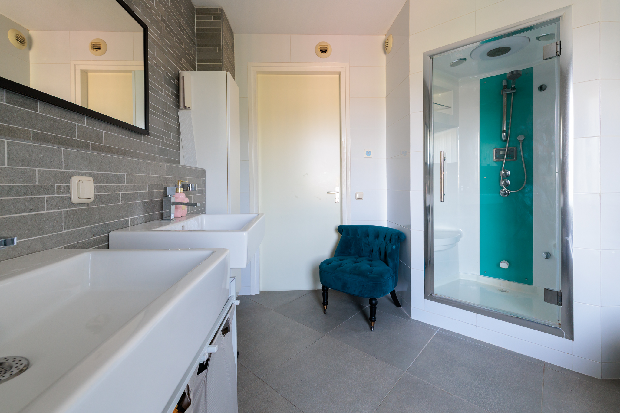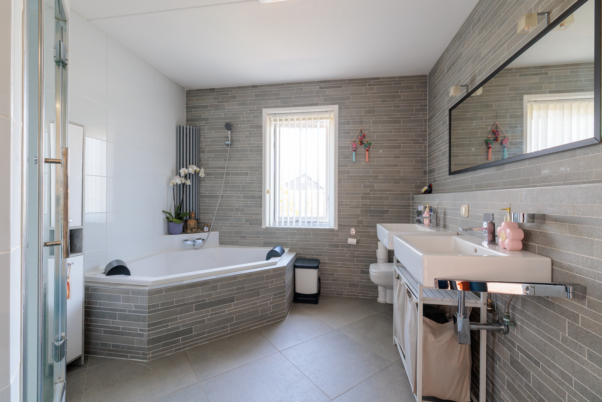 Via de trap bereikt u de overloop op de eerste verdieping, die toegang biedt tot drie ruime slaapkamers en ruime badkamer. De overloop is voorzien van een raam, waardoor het ook hier heerlijk licht is. Twee van de slaapkamers zijn gesitueerd aan de voorzijde van de woning, terwijl één slaapkamer aan de achterzijde is gelegen. Alle kamers beschikken over ruime raampartijen, waardoor deze van voldoende daglicht worden voorzien. De gehele verdieping is voorzien van een laminaat vloer. De badkamer op deze verdieping is ruim van opzet en uitgevoerd in wit met grijs tegelwerk tot aan het plafond. De badkamer is voorzien van een tweepersoons ligbad met aparte handdouche, een separate douche met stoomfunctie, een tweede hangend toilet en een twee wastafels en een opbergmeubel. Door het extra raam heeft u hier ook weer voldoende daglicht toetreding en kunt u de ruimte snel en effectief ventileren.