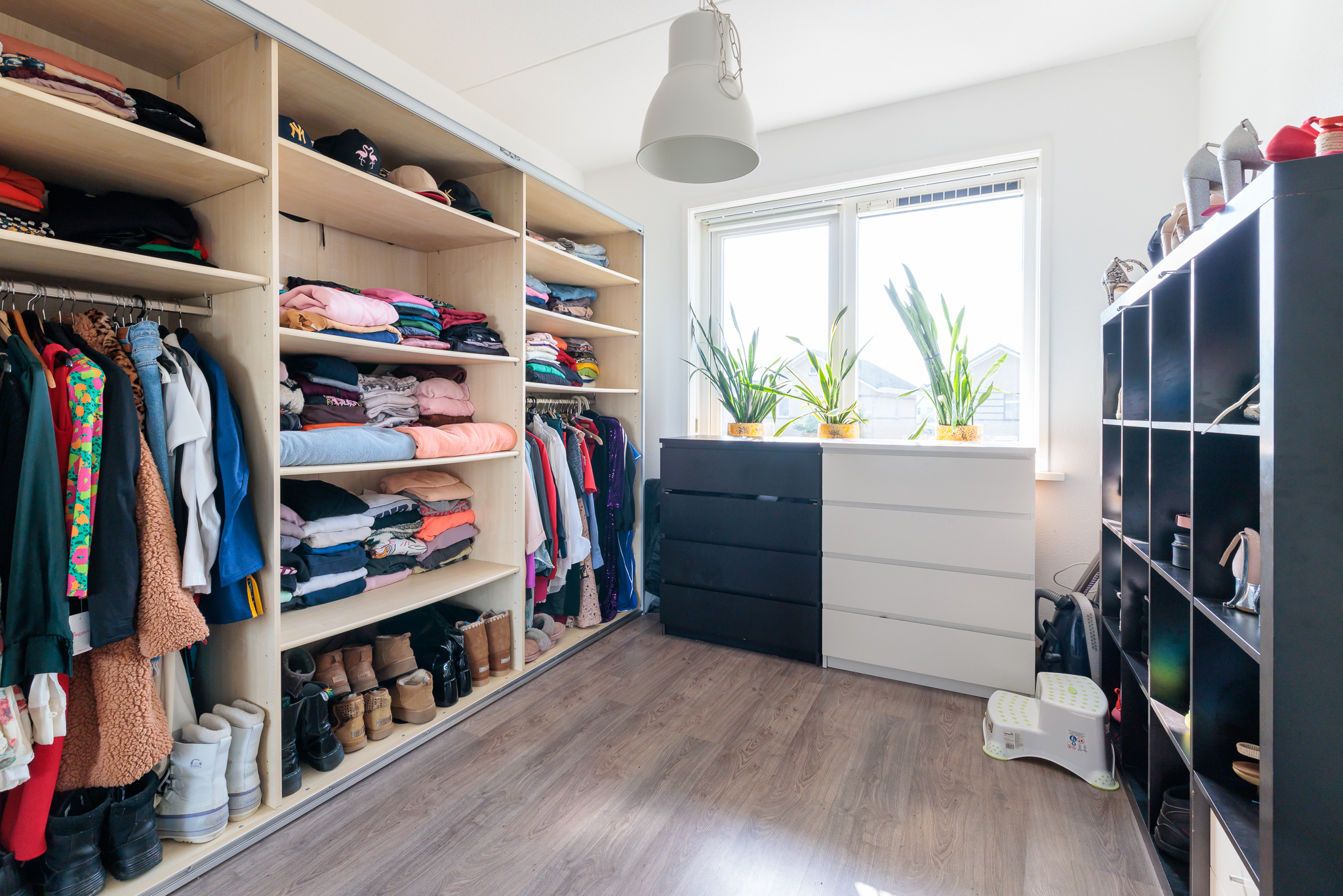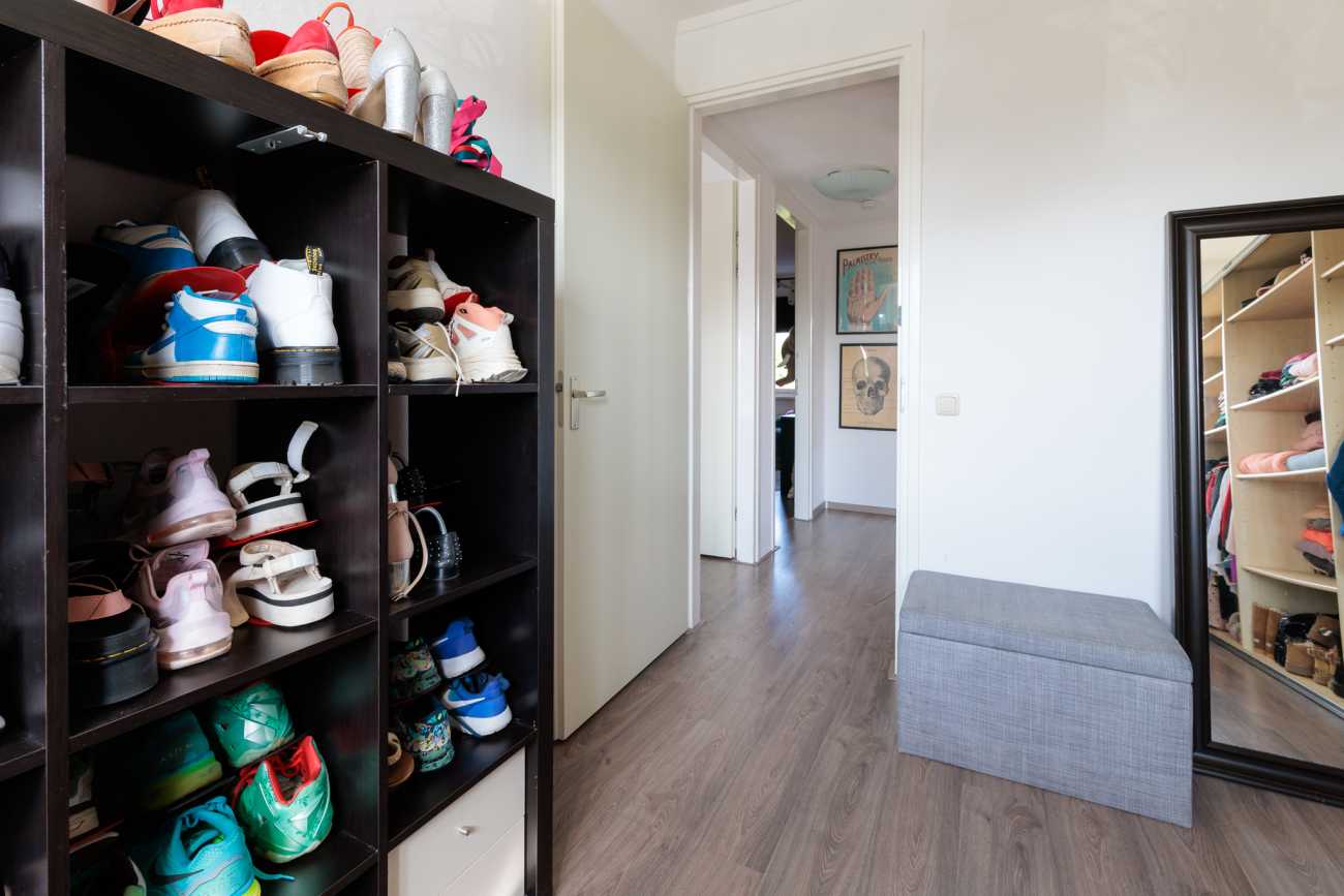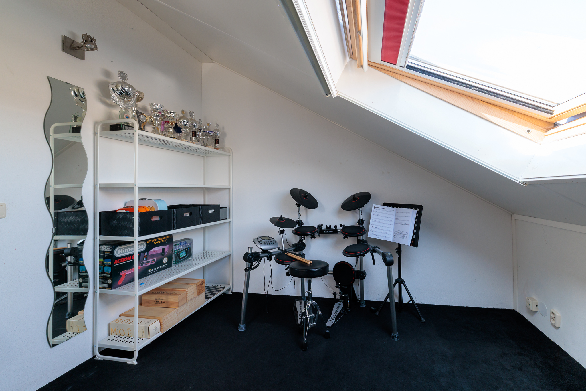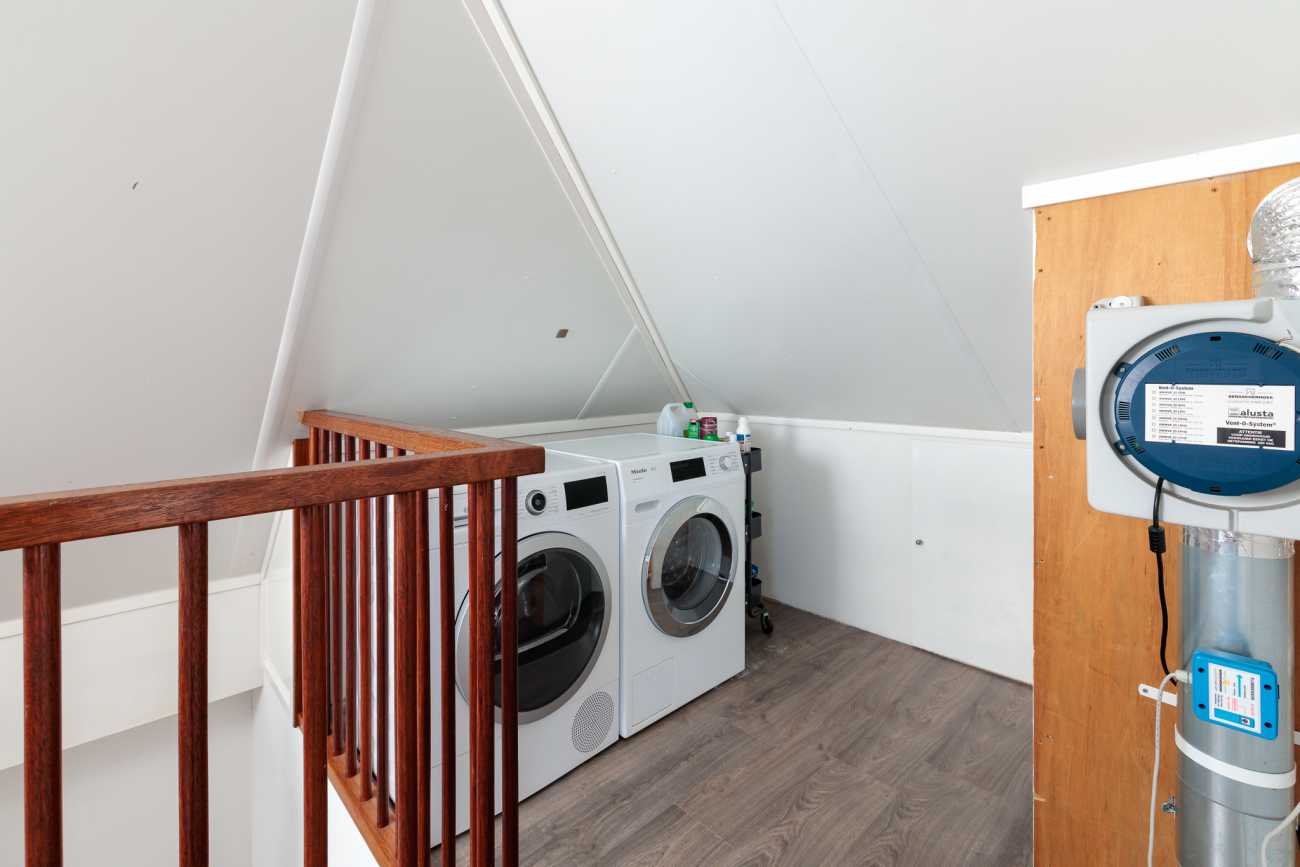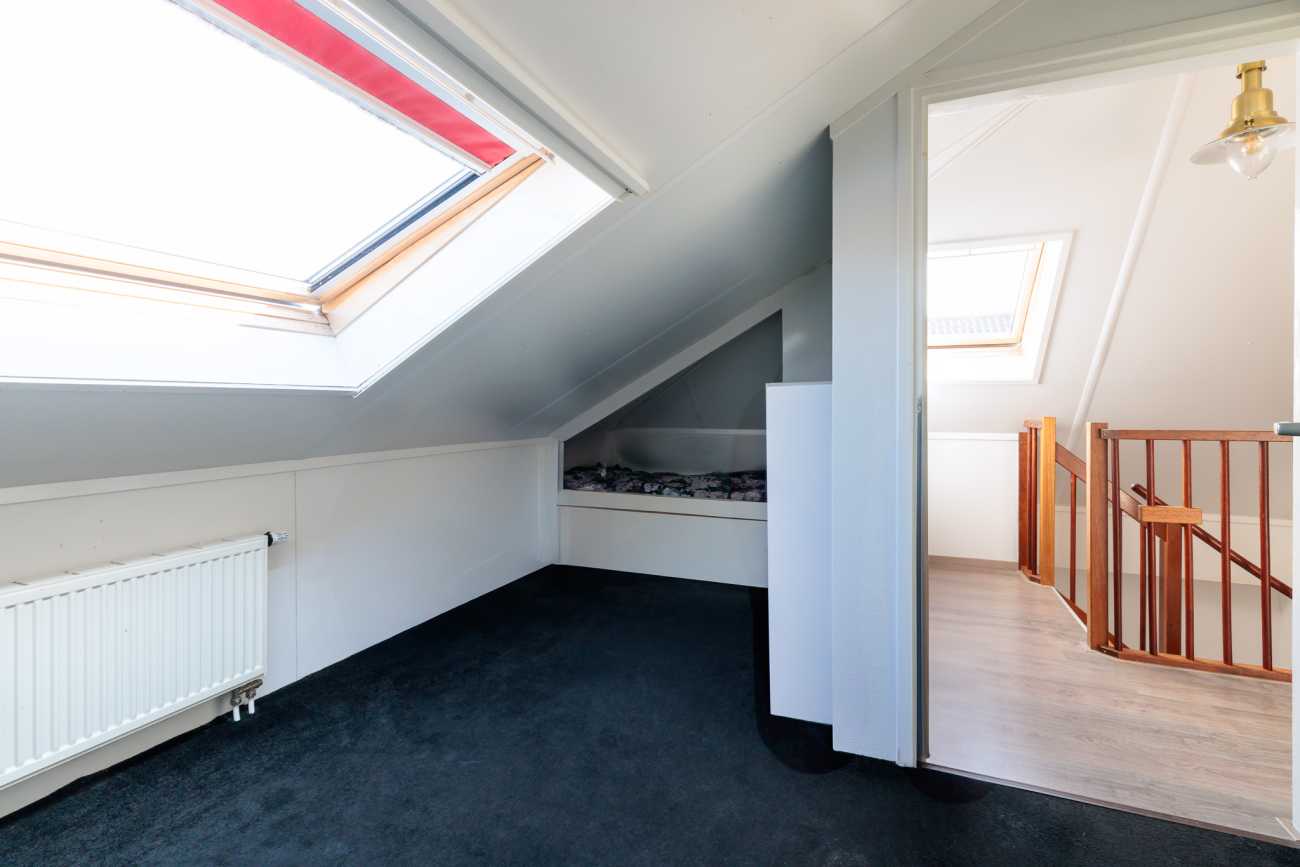 Via de trap bereikt u de tweede verdieping, waar zich de wasruimte en de twee overige slaapkamers bevinden. Eén van de slaapkamers is voorzien van een dakkapel, waardoor de ruimte extra licht en een gevoel van hoogte krijgt. De andere slaapkamer beschikt over een groot Velux-dakvenster. Achter de knieschotten is volop bergruimte aanwezig, ideaal voor het opbergen van spullen.