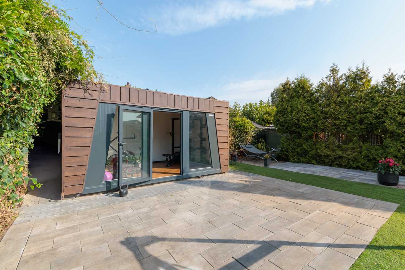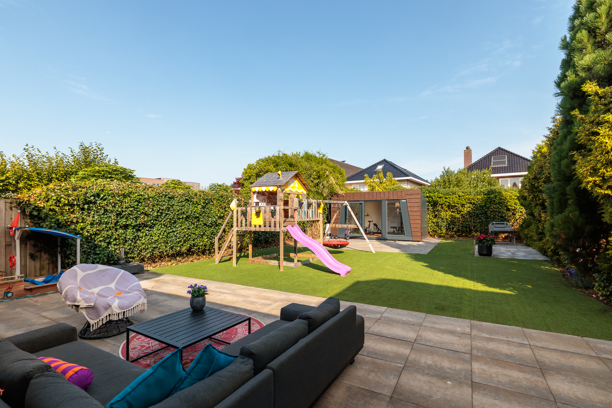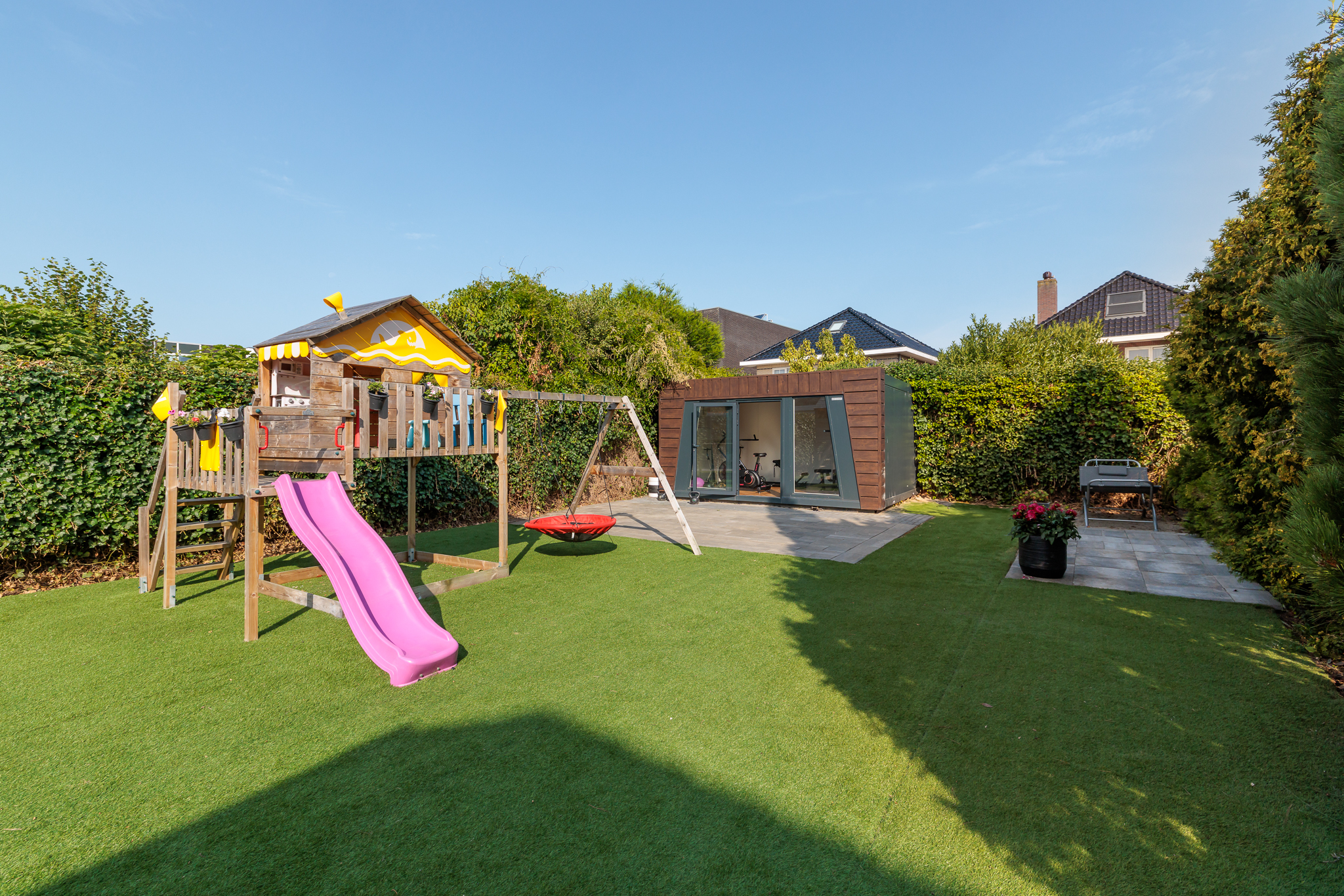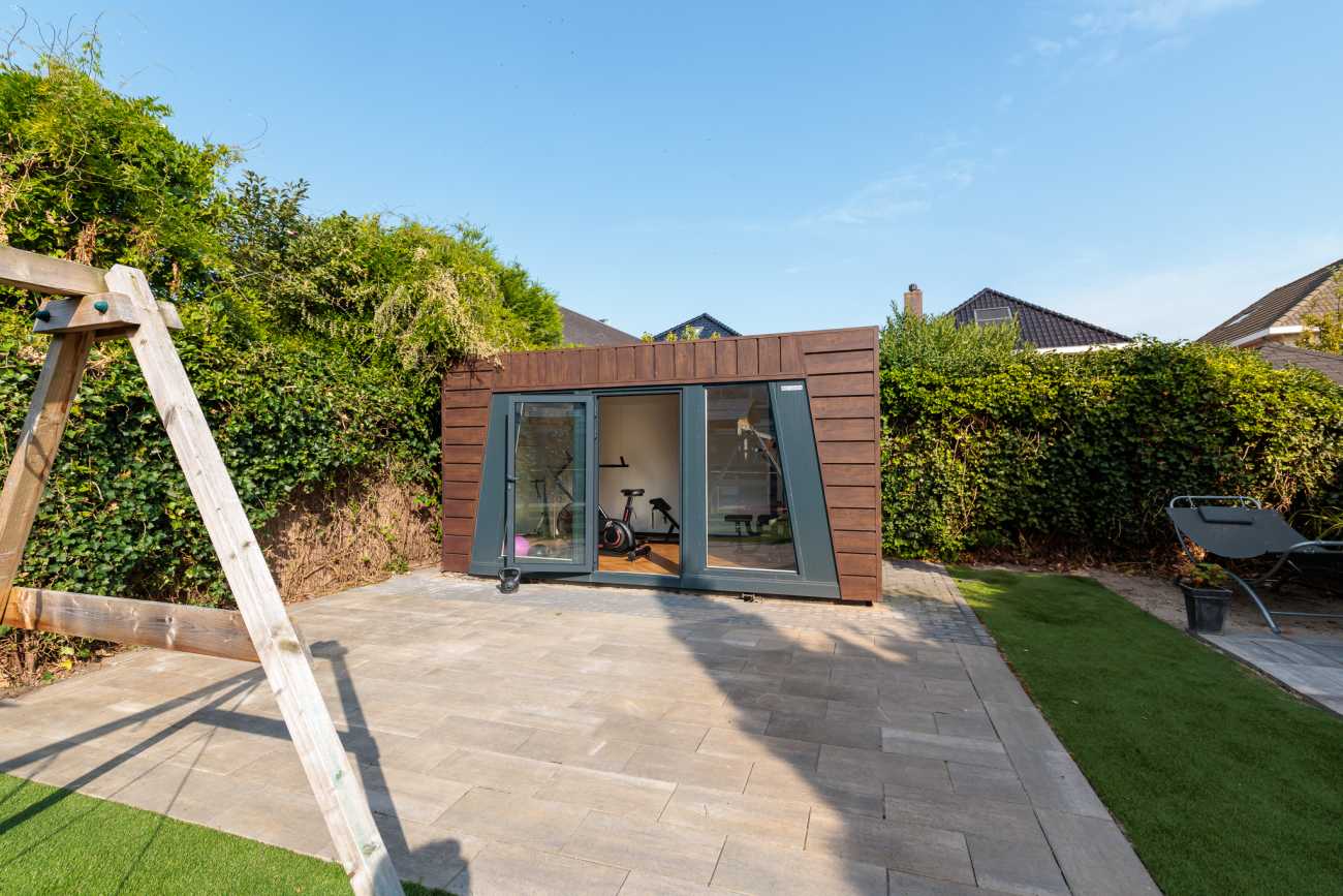De woning beschikt over een zeer nette aangelegde achtertuin van circa 20 meter diep en 11 meter breed. Door deze royale opzet geniet u hier van veel ruimte en voldoende privacy. De tuin is functioneel een praktisch ingericht met meerdere terrassen, zodat u ieder uur van de dag een fijne plek heeft waar u heerlijk kunt loungen. Er is een goede balans met het groen, doordat er rondom de tuin diverse struiken zijn geplaatst. In het midden vindt u een groot stuk gras met een speelhuis en schommels, wat een leuke en veilige speelplek biedt voor kinderen. Door de diepte van de tuin en de noordwestelijke ligging is deze zeer zonnig en kunt u vanaf ochtend tot de avond genieten bij mooi weer. In de achterhoek van de tuin bevindt zich een vrijstaande tuinkantoor van 15 m2, die momenteel in gebruik is als homegym, maar ook eenvoudig voor andere doeleinden kan worden gebruikt. Hij is volledig geïsoleerd, voorzien van kunststof kozijnen en deur met HR glas en van onderhoudsarm materiaal. Door de airco is dit tuinkantoor eenvoudig te koelen of te verwarmen, dus mogelijkheden genoeg om deze naar wens te gebruiken.
