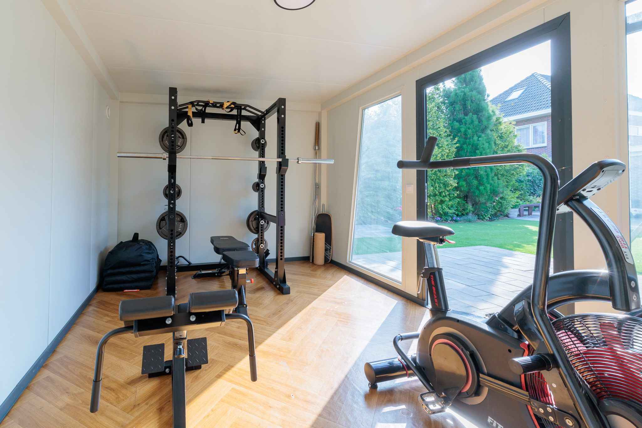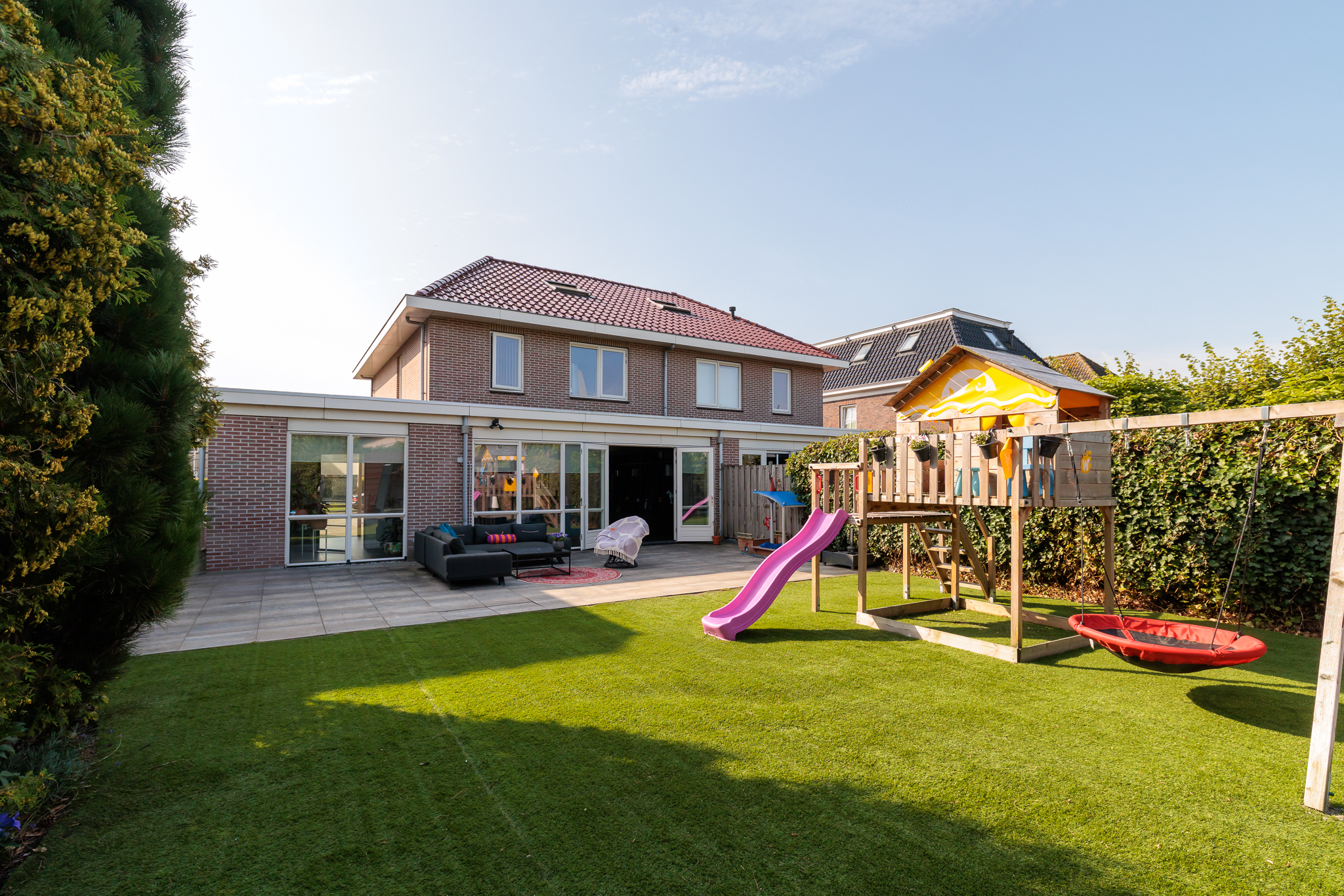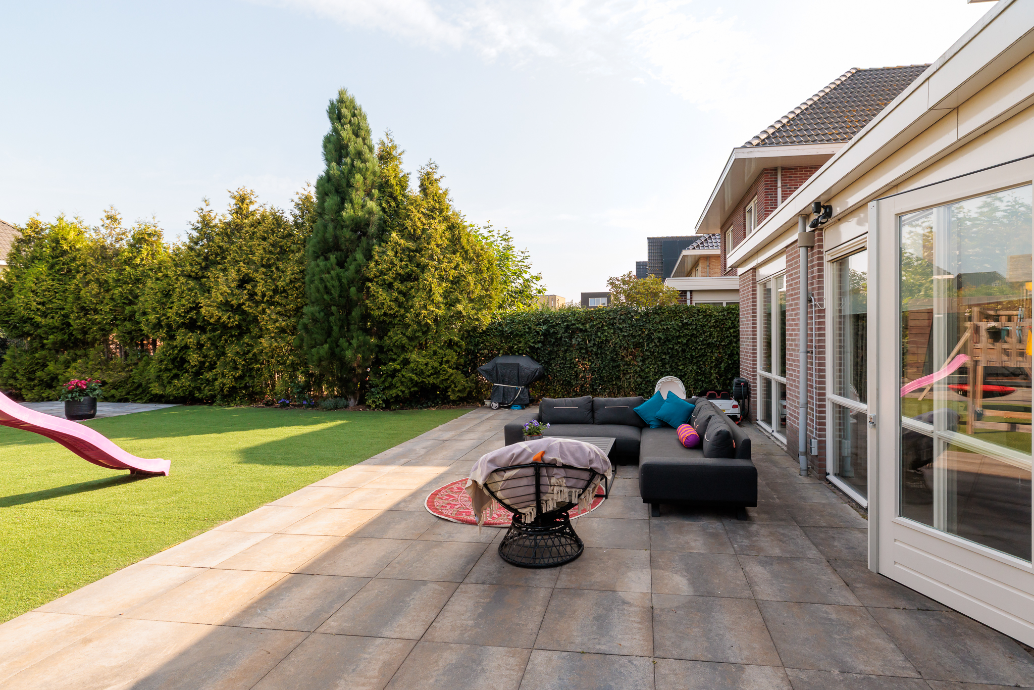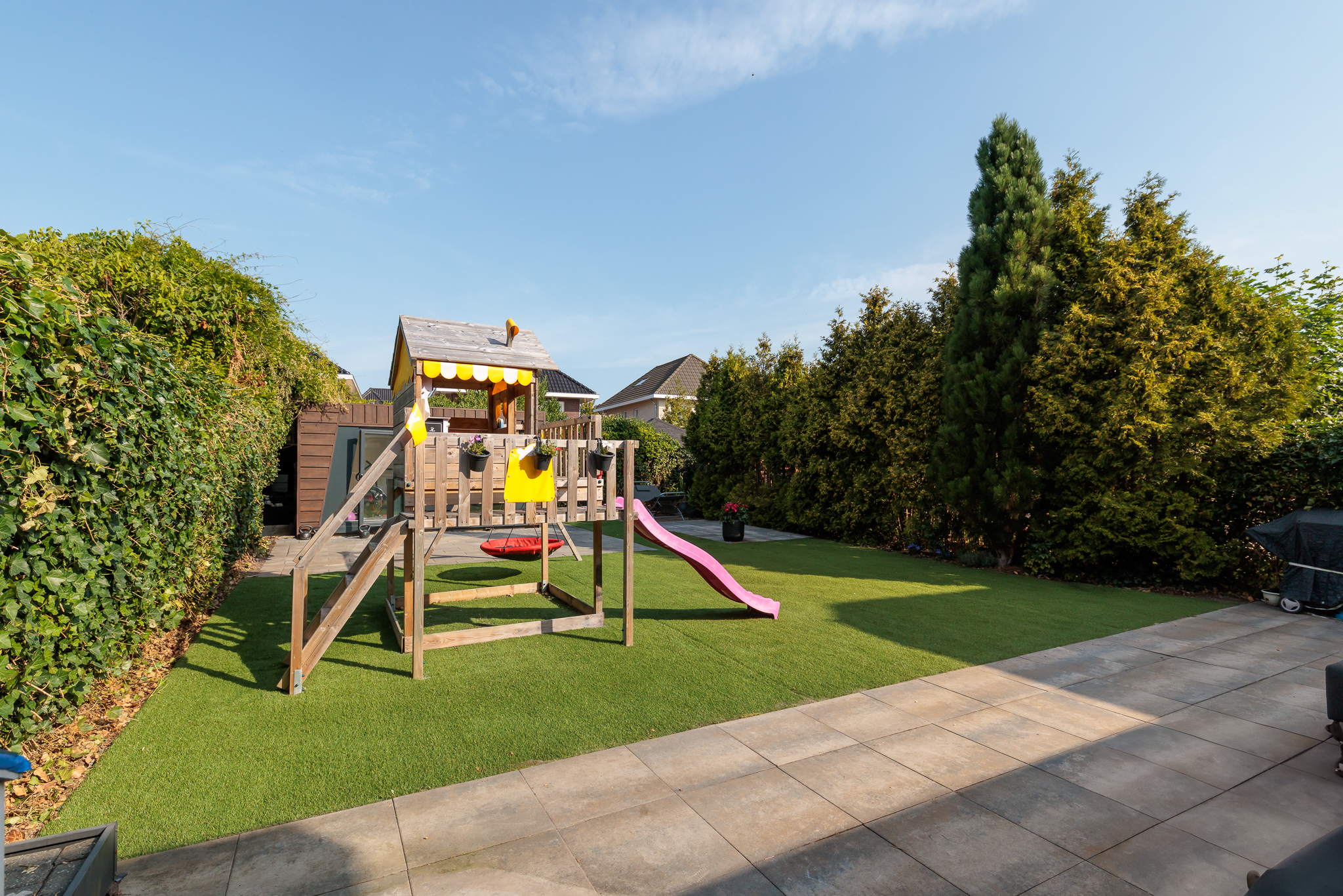 De woning beschikt over een zeer nette aangelegde achtertuin van circa 20 meter diep en 11 meter breed. Door deze royale opzet geniet u hier van veel ruimte en voldoende privacy. De tuin is functioneel een praktisch ingericht met meerdere terrassen, zodat u ieder uur van de dag een fijne plek heeft waar u heerlijk kunt loungen. Er is een goede balans met het groen, doordat er rondom de tuin diverse struiken zijn geplaatst. In het midden vindt u een groot stuk gras met een speelhuis en schommels, wat een leuke en veilige speelplek biedt voor kinderen. Door de diepte van de tuin en de noordwestelijke ligging is deze zeer zonnig en kunt u vanaf ochtend tot de avond genieten bij mooi weer. In de achterhoek van de tuin bevindt zich een vrijstaande tuinkantoor van 15 m2, die momenteel in gebruik is als homegym, maar ook eenvoudig voor andere doeleinden kan worden gebruikt. Hij is volledig geïsoleerd, voorzien van kunststof kozijnen en deur met HR glas en van onderhoudsarm materiaal. Door de airco is dit tuinkantoor eenvoudig te koelen of te verwarmen, dus mogelijkheden genoeg om deze naar wens te gebruiken.
