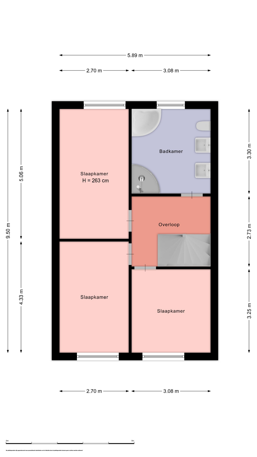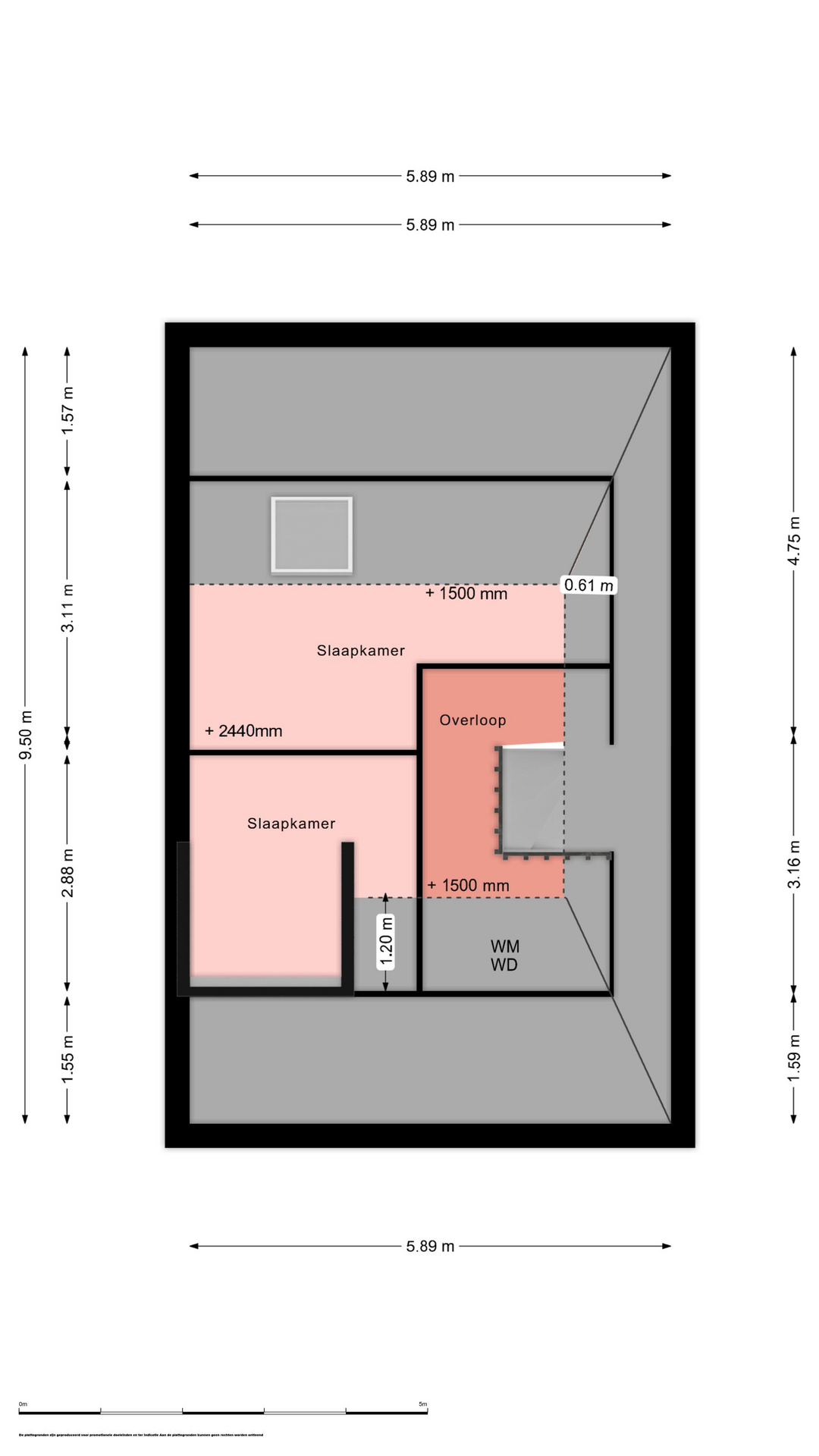 The stairs lead to the second floor, where you’ll find the laundry room and the two other bedrooms. One of the bedrooms features a dormer window, adding extra light and a sense of height. The other bedroom has a large Velux roof window. Behind the knee walls, there’s ample storage space, ideal for storing belongings.