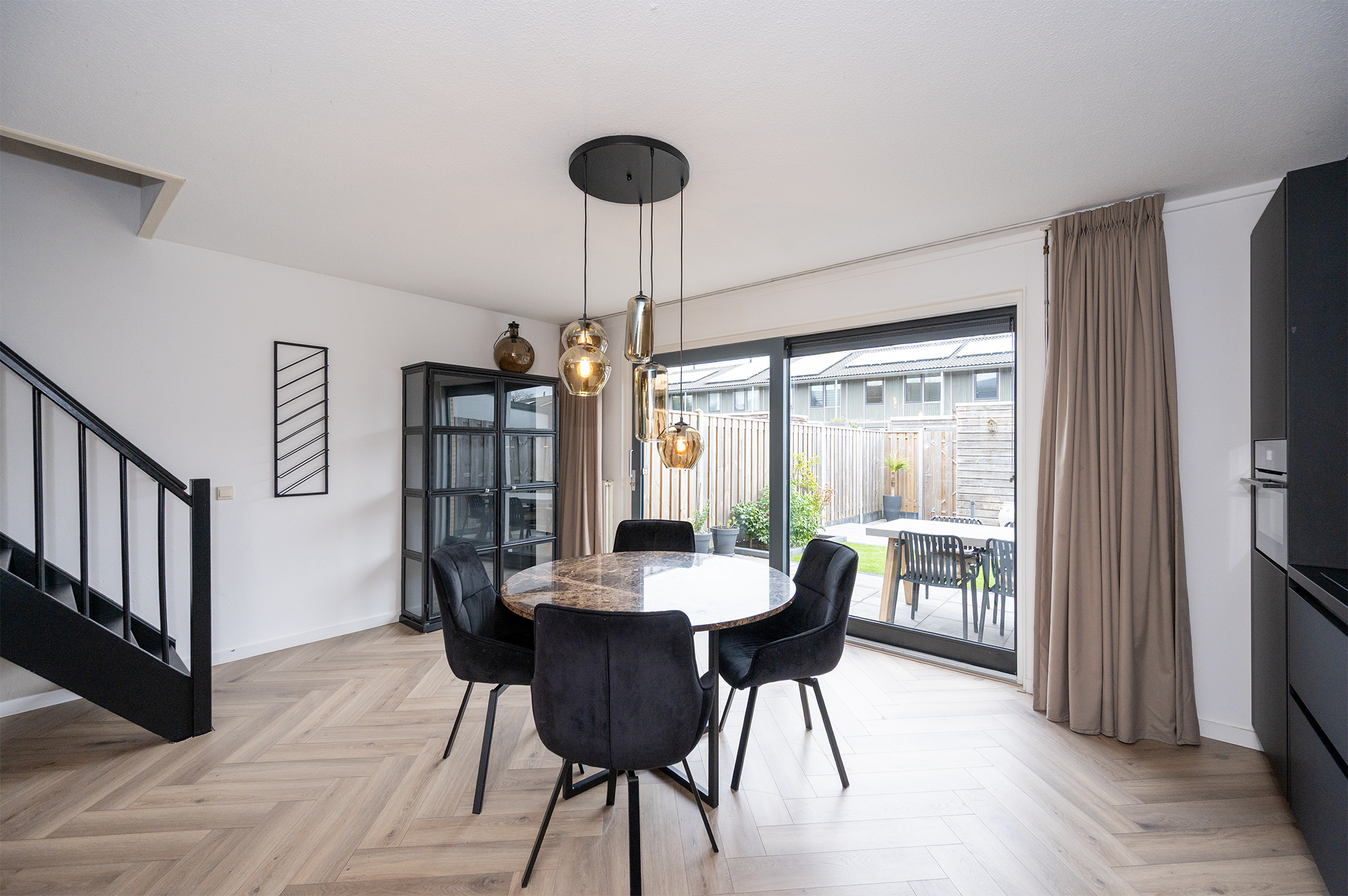 Via de verzorgde voortuin bereikt u de entree van de woning, waarna u binnenkomt in de hal. Deze hal vormt een prettige binnenkomer en biedt toegang tot een modern hangend toilet met fonteintje. Tevens bereikt u vanuit hier de woonkamer, waardoor de indeling direct overzichtelijk en praktisch aanvoelt. De lichte woonkamer bevindt zich aan de voorzijde van de woning en profiteert van een aangename hoeveelheid daglicht dankzij de grote raampartijen. Deze ruimte leent zich uitstekend voor het creëren van een comfortabele zithoek waar u kunt ontspannen en genieten van het uitzicht op de voortuin en de rustige omgeving. Aan de achterzijde van de woning treft u de moderne keuken, die strak en functioneel is ingericht. De keuken is uitgerust met diverse inbouwapparatuur, waaronder een vaatwasser, een inductiekookplaat en een combi oven/magnetron. Daarnaast beschikt de keuken over voldoende kastruimte, zodat u al uw keukengerei en proviand netjes kunt opbergen. Tevens vindt u aan de achterzijde van de woning de trapopgang naar de eerste verdieping, die op een logische en centrale plek in de woning is gesitueerd.