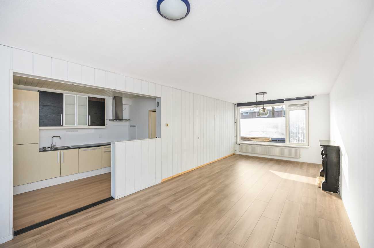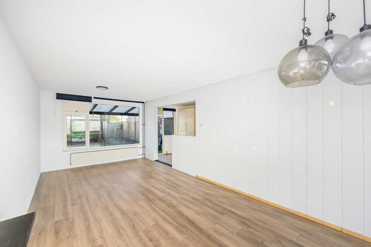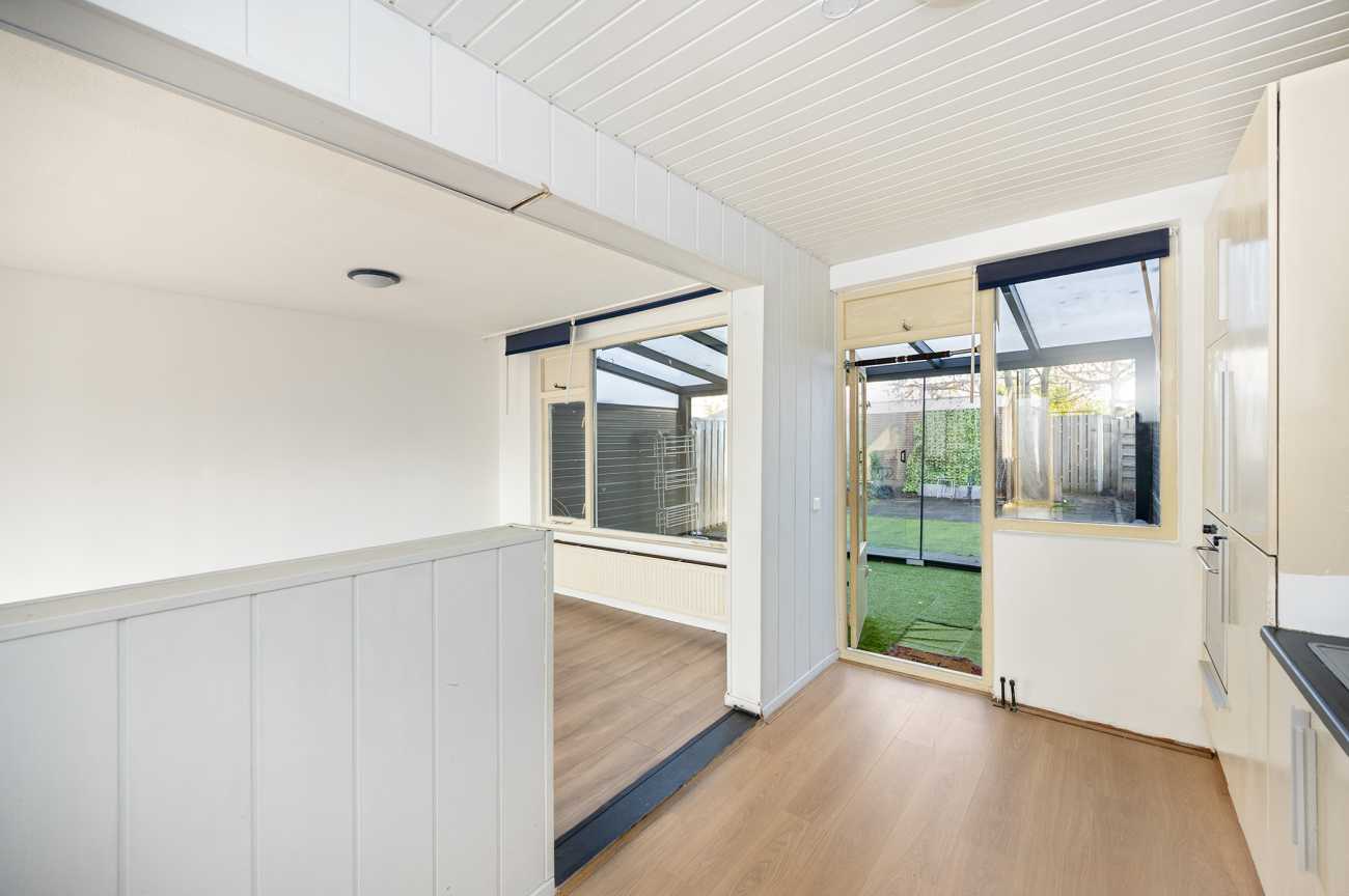 U komt binnen in de hal die toegang geeft tot het toilet, de woonkamer, meterkast en de trapopgang. De ruime tuingerichte woonkamer is voorzien van laminaatvloer. De grote raampartijen halen het daglicht royaal naar binnen en geven de woning een open, ruimtelijk gevoel. De keuken beschikt over een ingebouwde kookplaat, oven, koelkast, vriezer en vaatwasser en is deels afgescheiden van de woonkamer, wat zorgt voor een prettige balans tussen openheid en privacy.