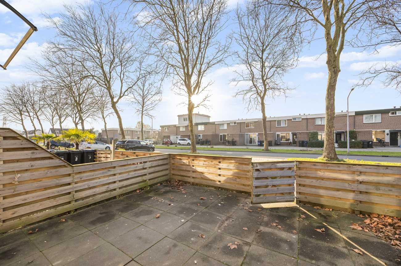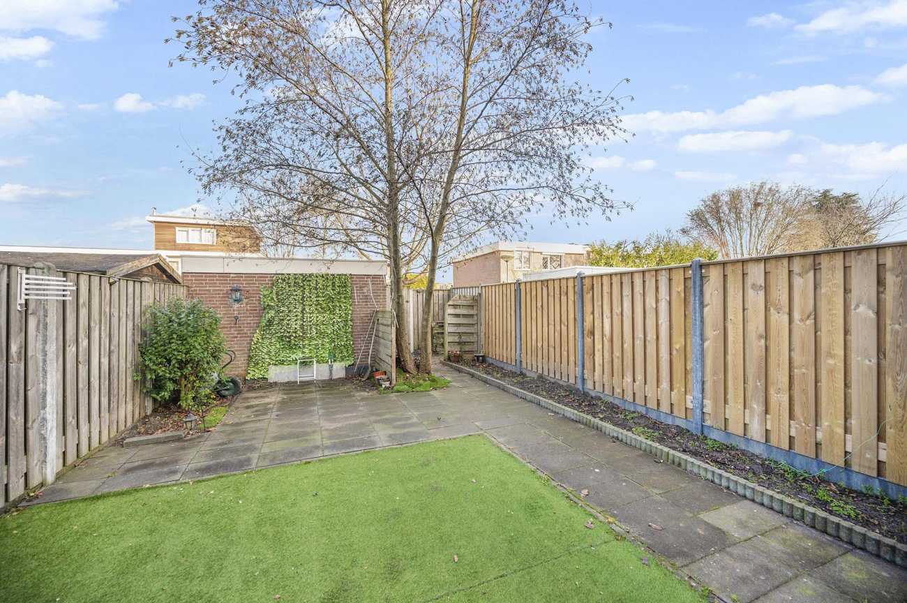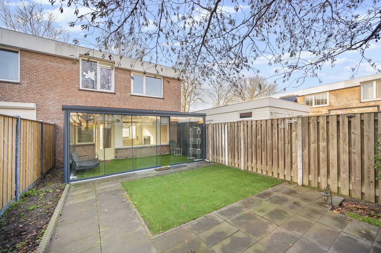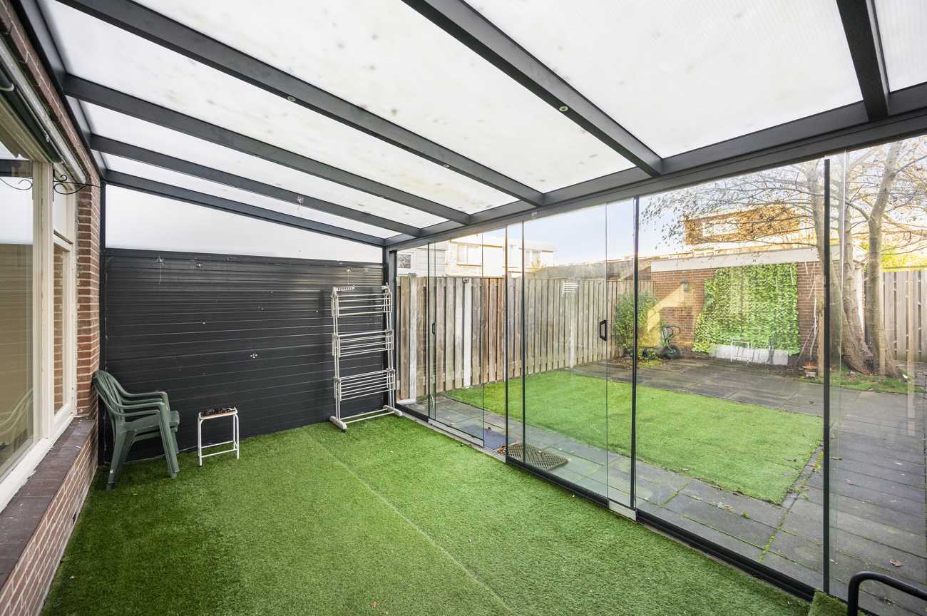 De achtertuin is gelegen op het noordoosten, waardoor u in de ochtend kunt genieten van de eerste zonuren. Het formaat van de tuin maakt deze uitermate geschikt voor het creëren van een comfortabele buitenruimte, waar u in alle rust kunt ontspannen of gasten kunt ontvangen tijdens de warmere maanden. De tuin is onderhoudsvriendelijk aangelegd en voorzien van kunstgras en strakke sierbestrating. Aan de woning is een aangebouwde serre gerealiseerd, die zorgt voor een prettige overgang tussen binnen en buiten en het hele jaar door extra leefruimte biedt. Aan de achterzijde van de tuin bevindt zich een praktische, vrijstaande berging. Deze biedt voldoende ruimte voor het opbergen van tuinmeubilair, (tuin)gereedschap, fietsen of andere opslagbehoeften.