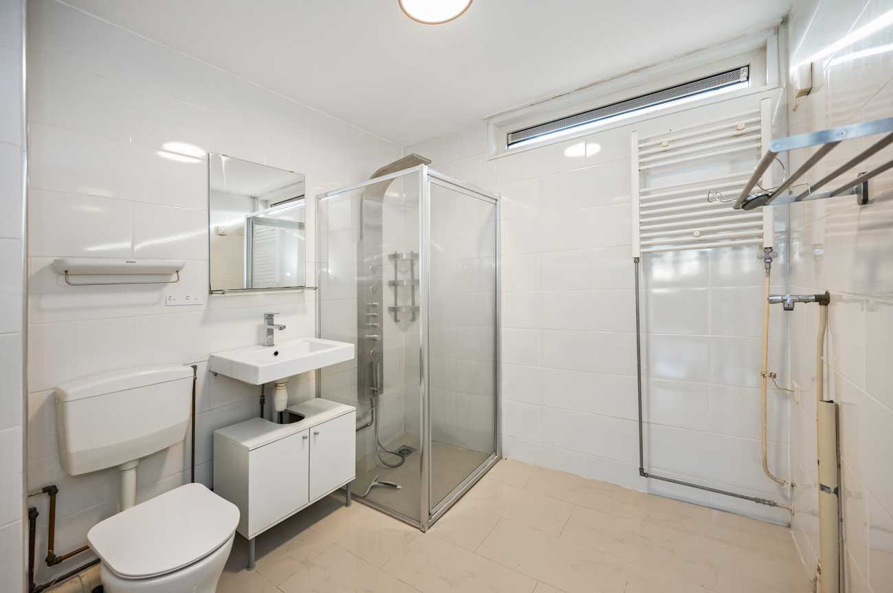 Via de vaste trap bereikt u de overloop op de eerste verdieping, die toegang biedt tot drie volwaardige slaapkamers en de badkamer. De slaapkamers zijn ruim van opzet en beschikken over grote raampartijen, wat zorgt voor een prettig lichtinval. De badkamer is volledig betegeld en functioneel ingericht met een toilet, wastafel en een douche met glazen wanden. Daarnaast beschikt deze verdieping nog over een berging.