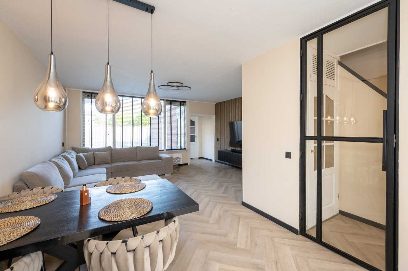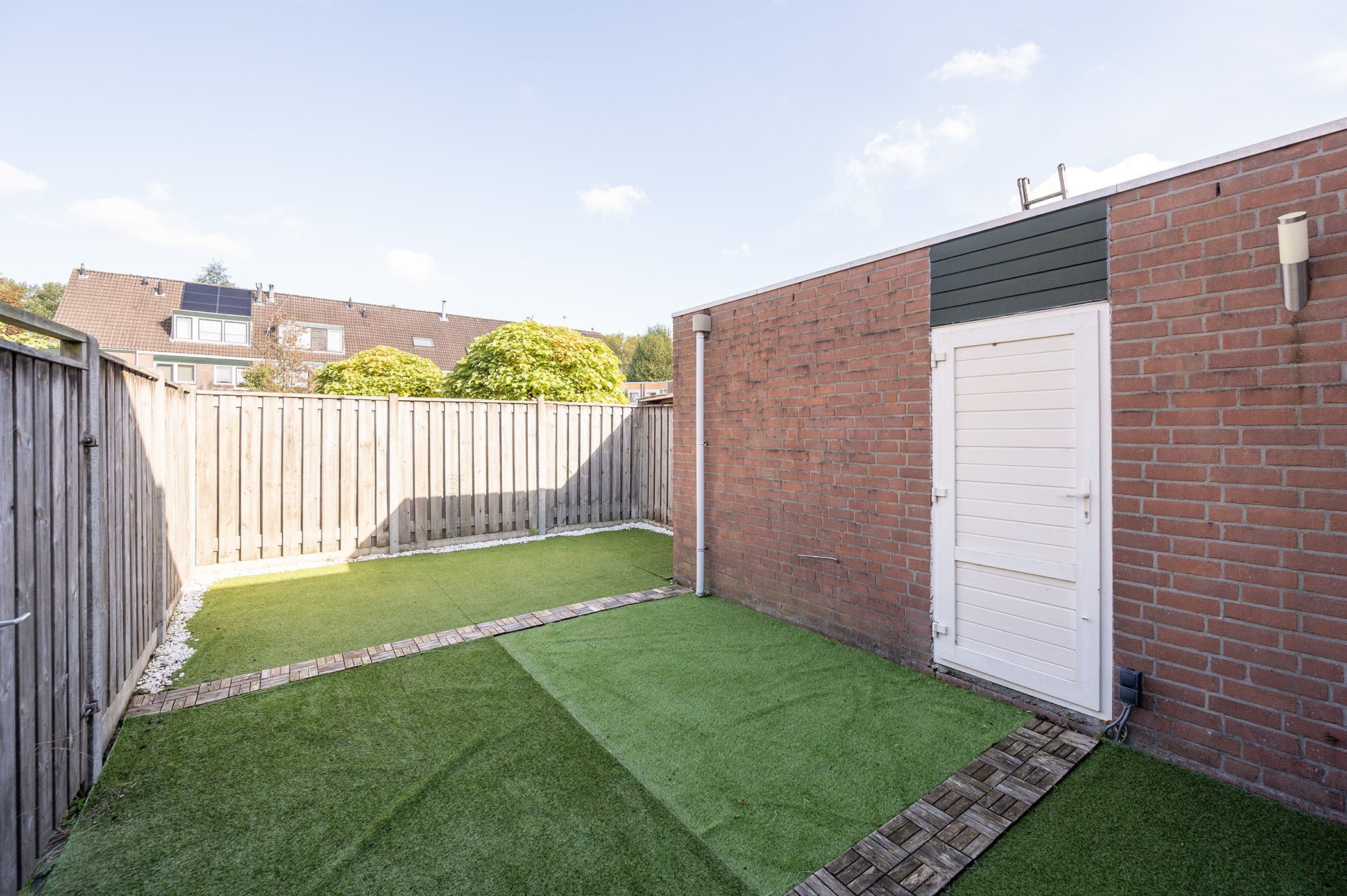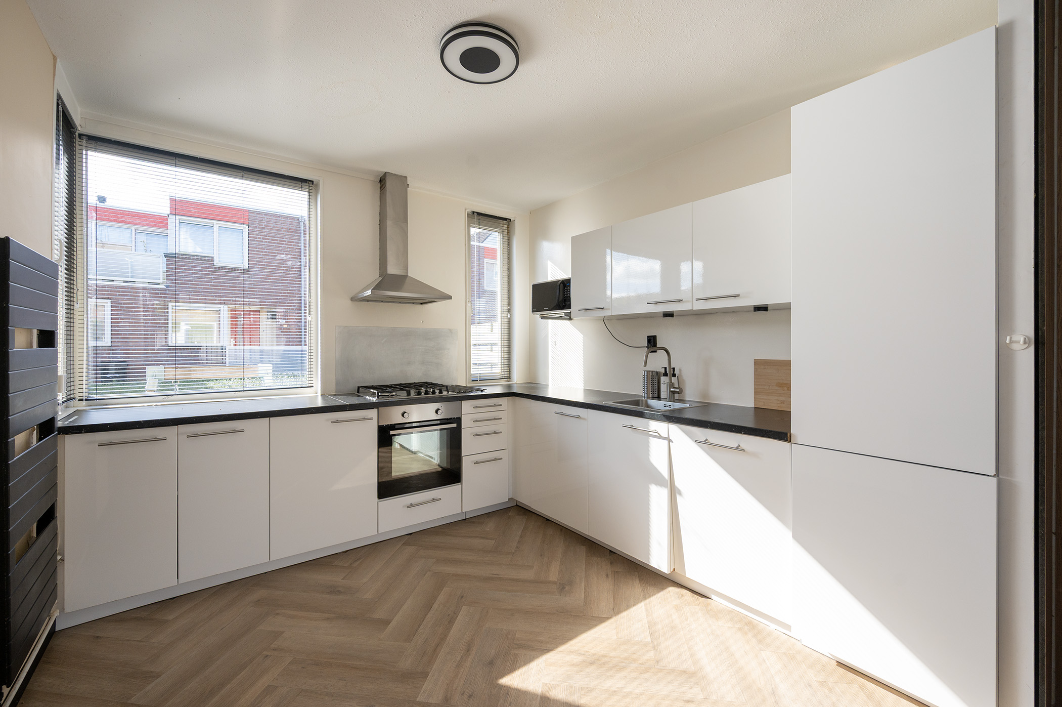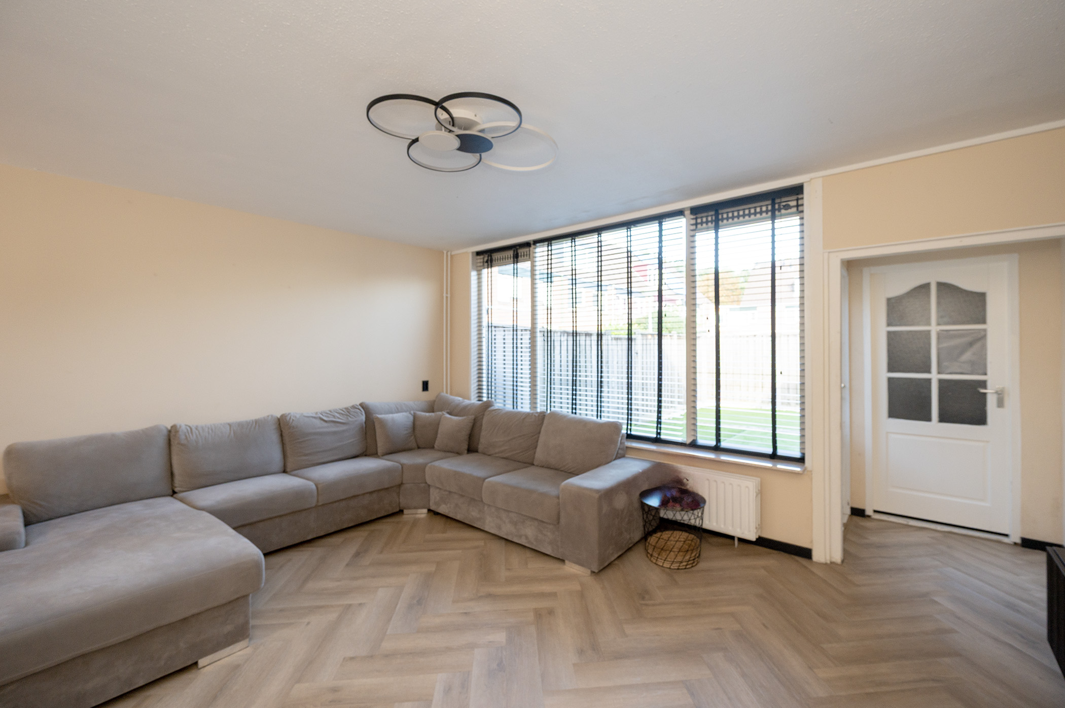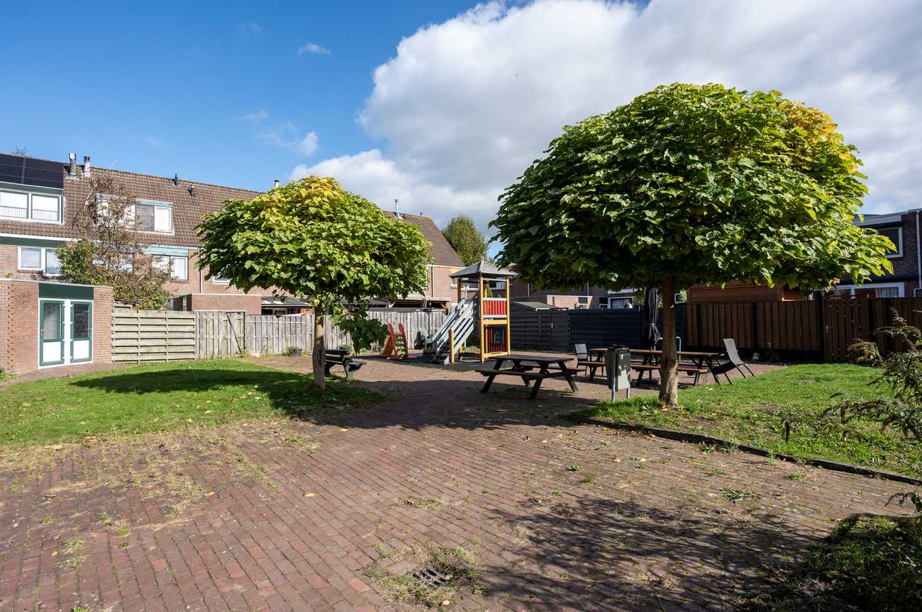 Spacious front garden along a car-free path with access to the house. Upon entering the house, you enter the entrance hall. From this hall, you have access to the modern toilet, the meter cupboard, and the staircase to the first floor. There is also a practical under-stairs cupboard providing additional storage space for cleaning supplies or provisions, for example. The hall leads to the living room through a stylish glass door. This door not only contributes to a luxurious appearance but also provides pleasant natural light. The living room is located at the rear of the house and faces the garden. The walls and ceilings have a smooth finish, creating a well-maintained impression. Thanks to the large windows spanning the entire width of the house, this space enjoys abundant natural light. A garden door provides direct access to the back garden. At the front of the house is the spacious open-plan kitchen, built in 2020. It features a practical corner layout and is equipped with various built-in appliances, including a gas stove, extractor hood, oven, refrigerator, freezer, and dishwasher. The kitchen offers ample work and storage space and is ideal for both daily use and for those who enjoy cooking. The entire ground floor is finished with neat laminate flooring in a modern herringbone pattern. The sunny garden and back garden are low-maintenance. The back garden has a practical rear entrance and an attached stone shed, accessible from both the living room and the garden. Currently, the utility room, housing the washing machine and dryer, is located here. The back garden borders a child-friendly courtyard with various play equipment.