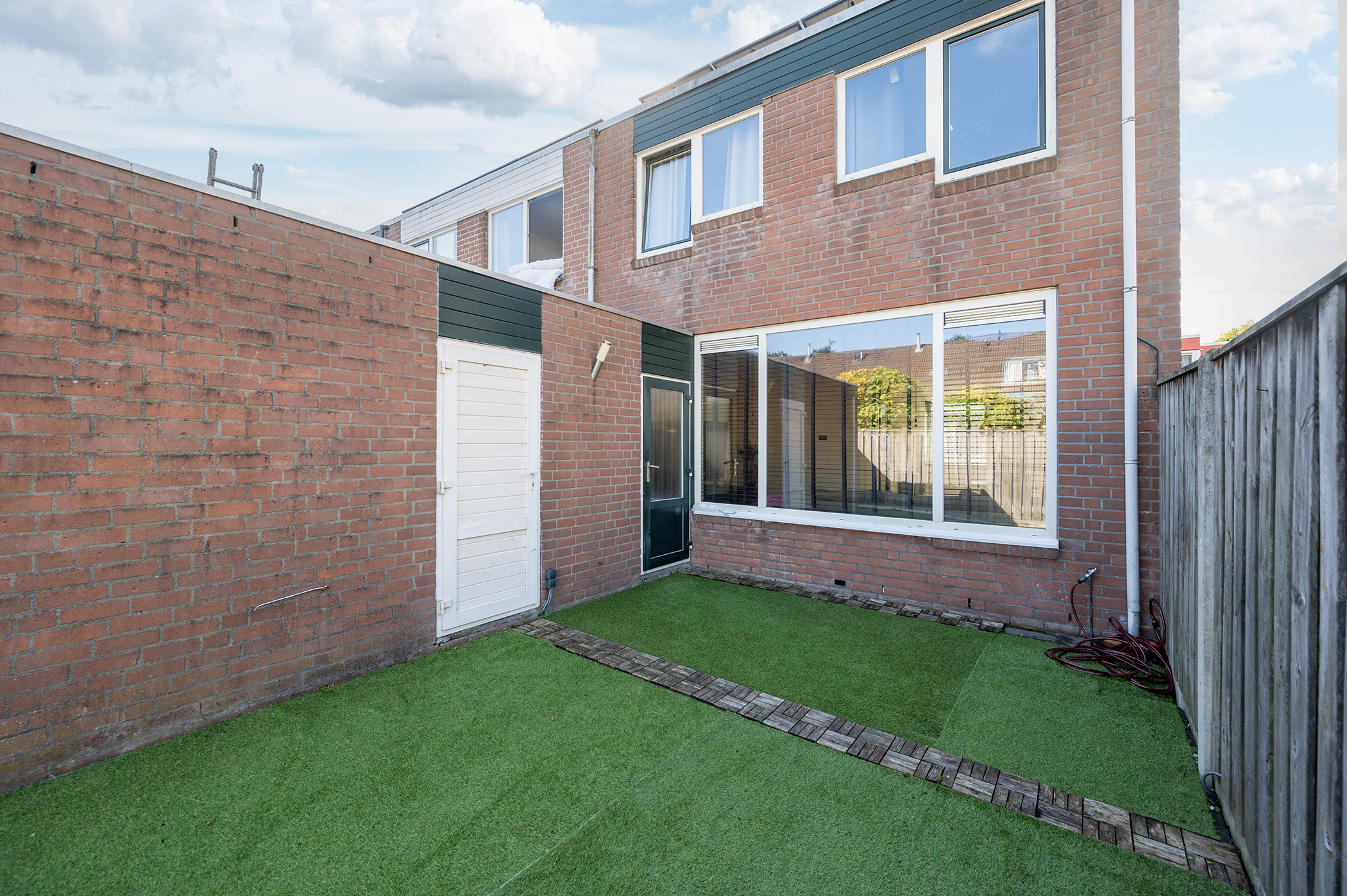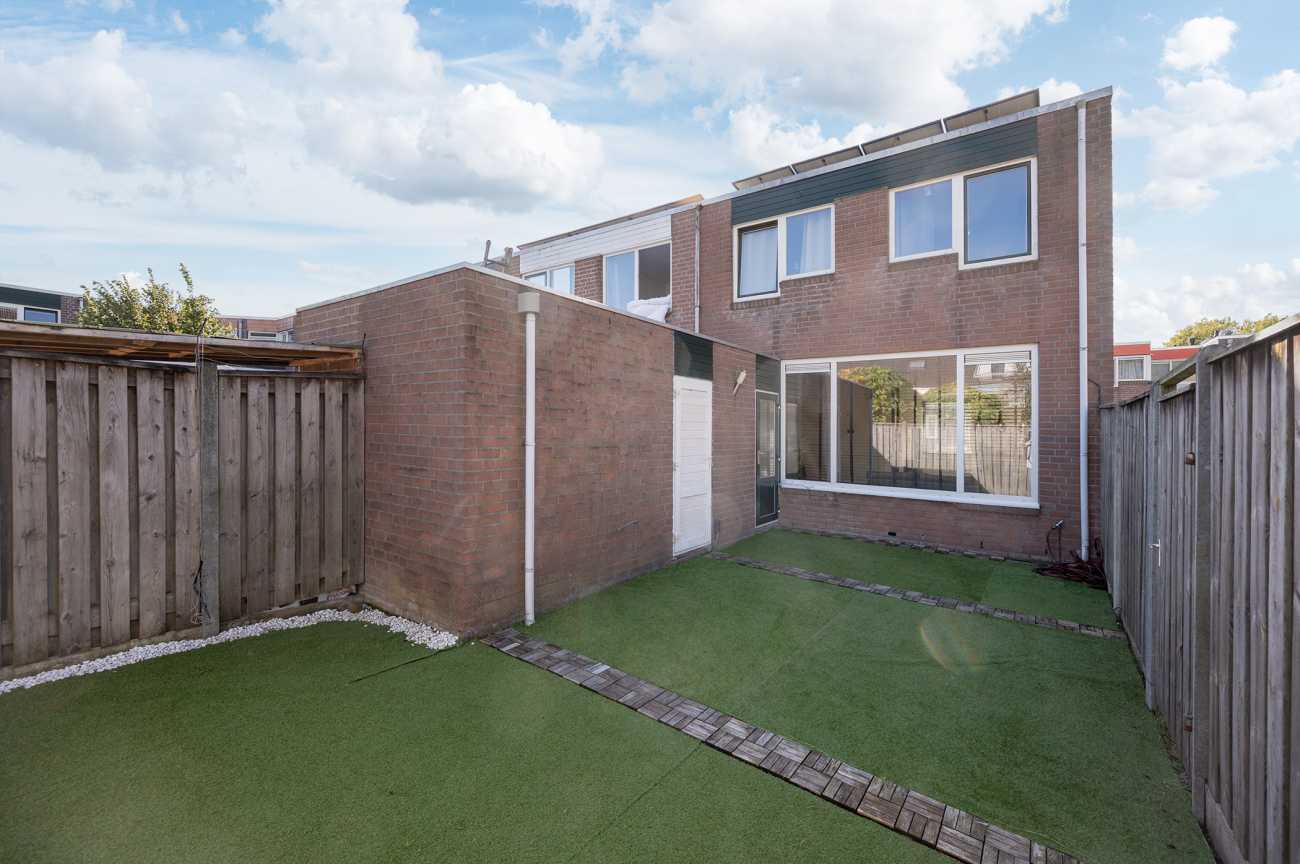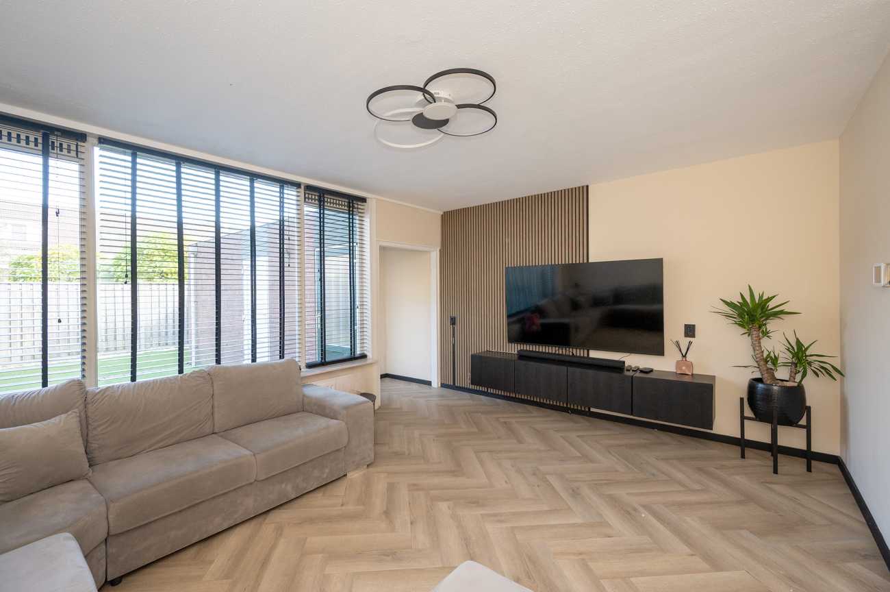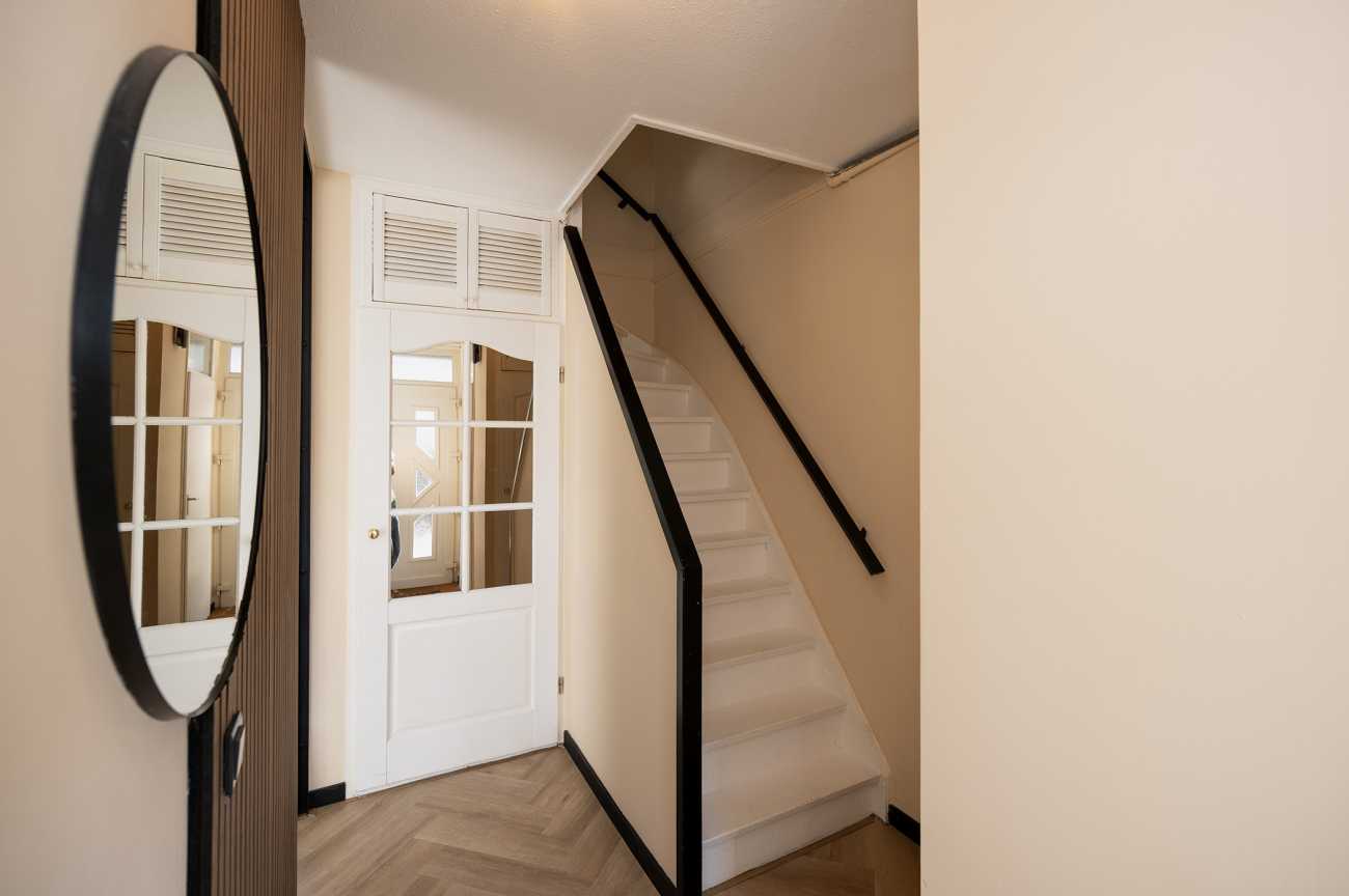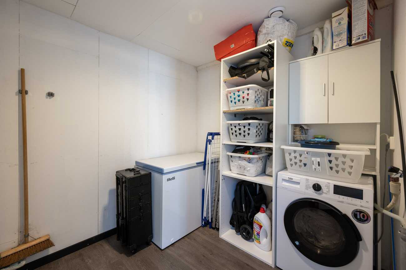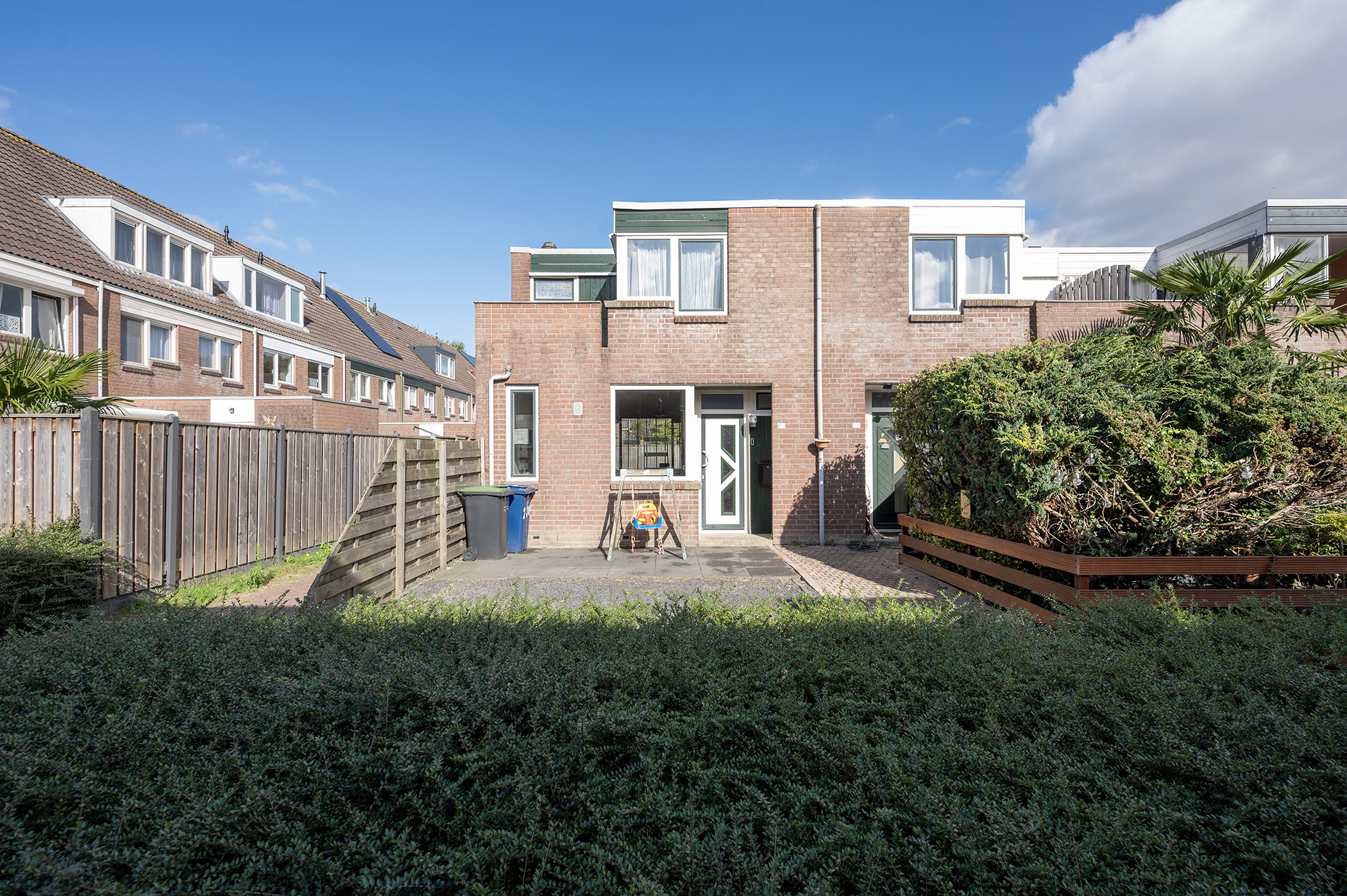 Spacious front garden along a car-free path with access to the house. Upon entering the house, you enter the entrance hall. From this hall, you have access to the modern toilet, the meter cupboard, and the staircase to the first floor. There is also a practical under-stairs cupboard providing additional storage space for cleaning supplies or provisions, for example. The hall leads to the living room through a stylish glass door. This door not only contributes to a luxurious appearance but also provides pleasant natural light. The living room is located at the rear of the house and faces the garden. The walls and ceilings have a smooth finish, creating a well-maintained impression. Thanks to the large windows spanning the entire width of the house, this space enjoys abundant natural light. A garden door provides direct access to the back garden. At the front of the house is the spacious open-plan kitchen, built in 2020. It features a practical corner layout and is equipped with various built-in appliances, including a gas stove, extractor hood, oven, refrigerator, freezer, and dishwasher. The kitchen offers ample work and storage space and is ideal for both daily use and for those who enjoy cooking. The entire ground floor is finished with neat laminate flooring in a modern herringbone pattern. The sunny garden and back garden are low-maintenance. The back garden has a practical rear entrance and an attached stone shed, accessible from both the living room and the garden. Currently, the utility room, housing the washing machine and dryer, is located here. The back garden borders a child-friendly courtyard with various play equipment.