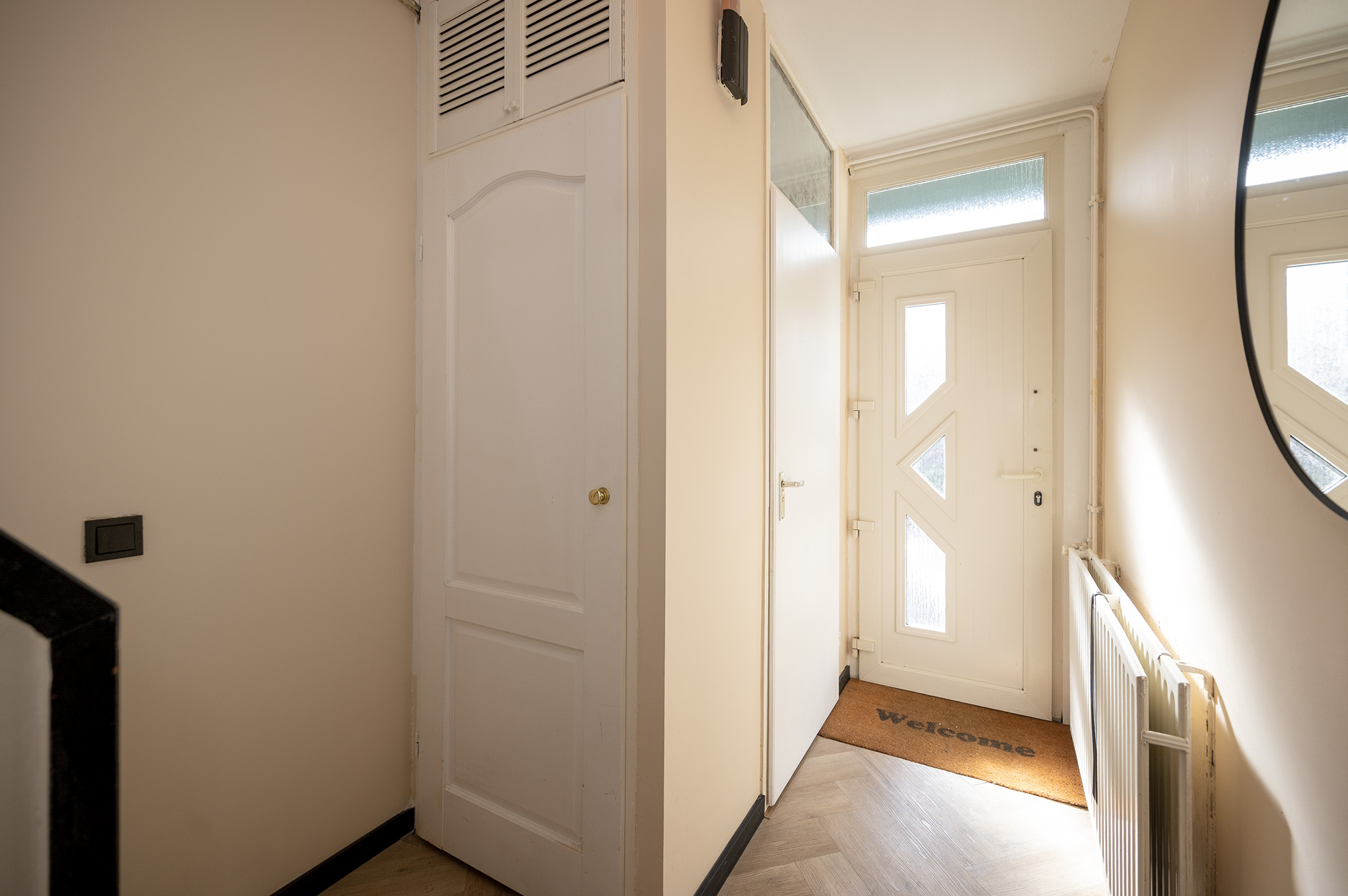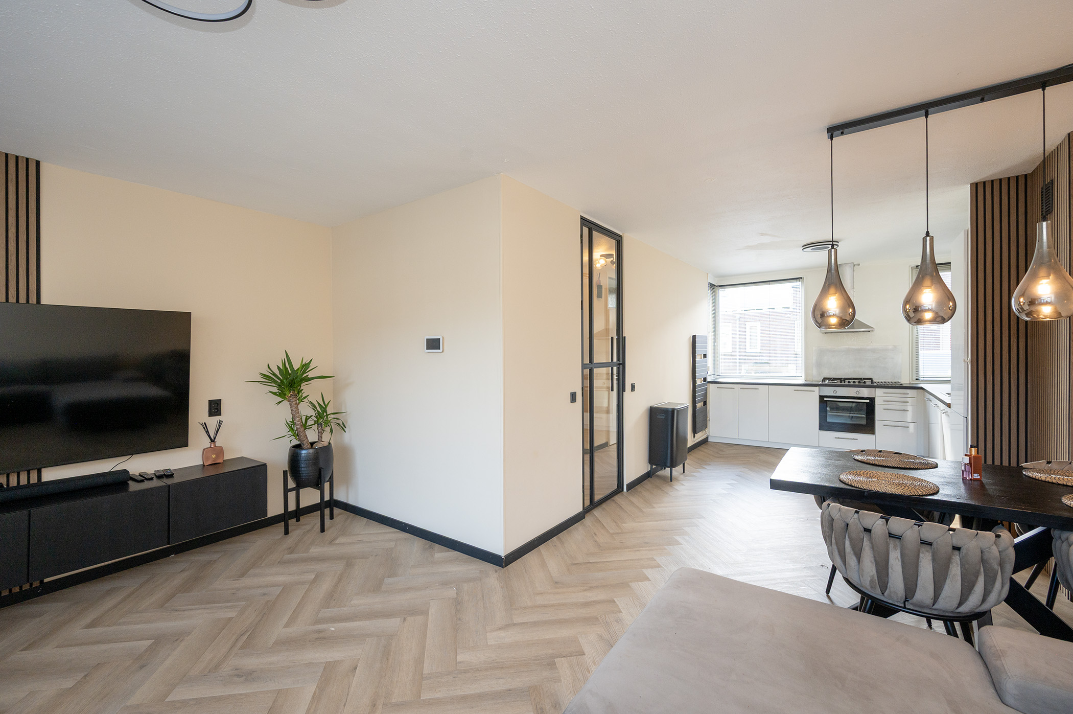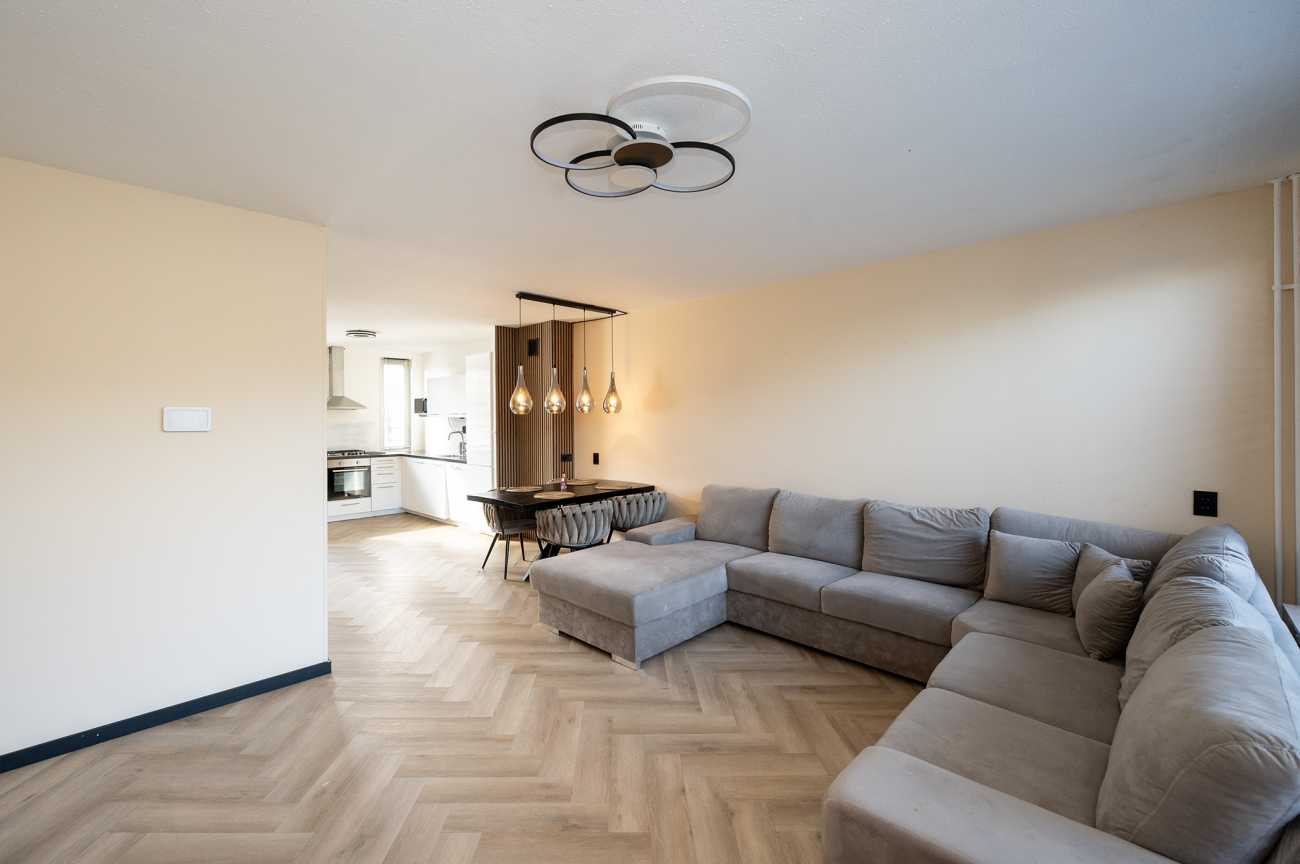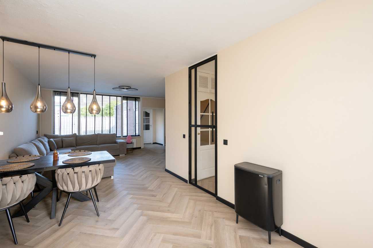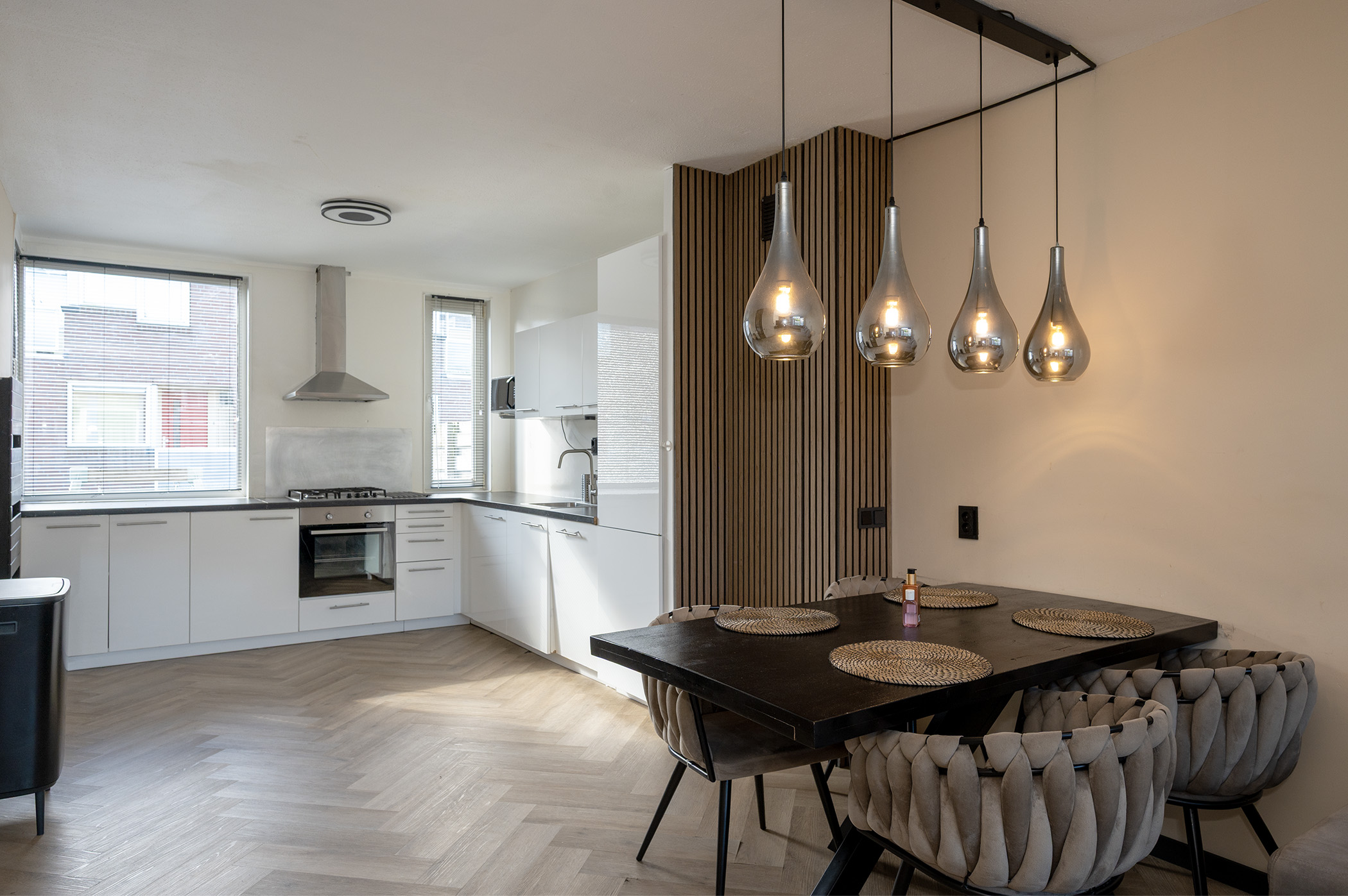 Spacious front garden along a car-free path with access to the house. Upon entering the house, you enter the entrance hall. From this hall, you have access to the modern toilet, the meter cupboard, and the staircase to the first floor. There is also a practical under-stairs cupboard providing additional storage space for cleaning supplies or provisions, for example. The hall leads to the living room through a stylish glass door. This door not only contributes to a luxurious appearance but also provides pleasant natural light. The living room is located at the rear of the house and faces the garden. The walls and ceilings have a smooth finish, creating a well-maintained impression. Thanks to the large windows spanning the entire width of the house, this space enjoys abundant natural light. A garden door provides direct access to the back garden. At the front of the house is the spacious open-plan kitchen, built in 2020. It features a practical corner layout and is equipped with various built-in appliances, including a gas stove, extractor hood, oven, refrigerator, freezer, and dishwasher. The kitchen offers ample work and storage space and is ideal for both daily use and for those who enjoy cooking. The entire ground floor is finished with neat laminate flooring in a modern herringbone pattern. The sunny garden and back garden are low-maintenance. The back garden has a practical rear entrance and an attached stone shed, accessible from both the living room and the garden. Currently, the utility room, housing the washing machine and dryer, is located here. The back garden borders a child-friendly courtyard with various play equipment.
