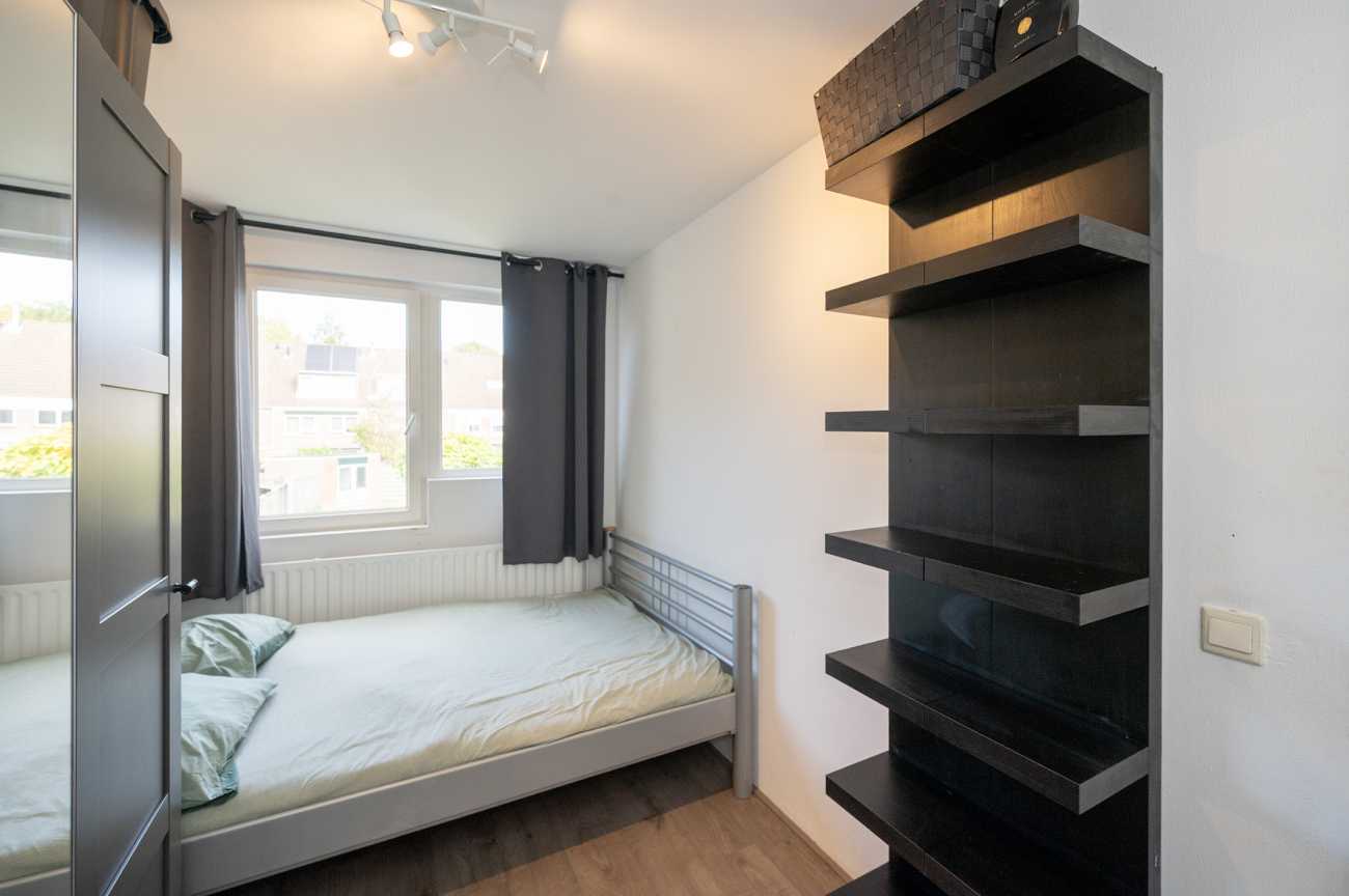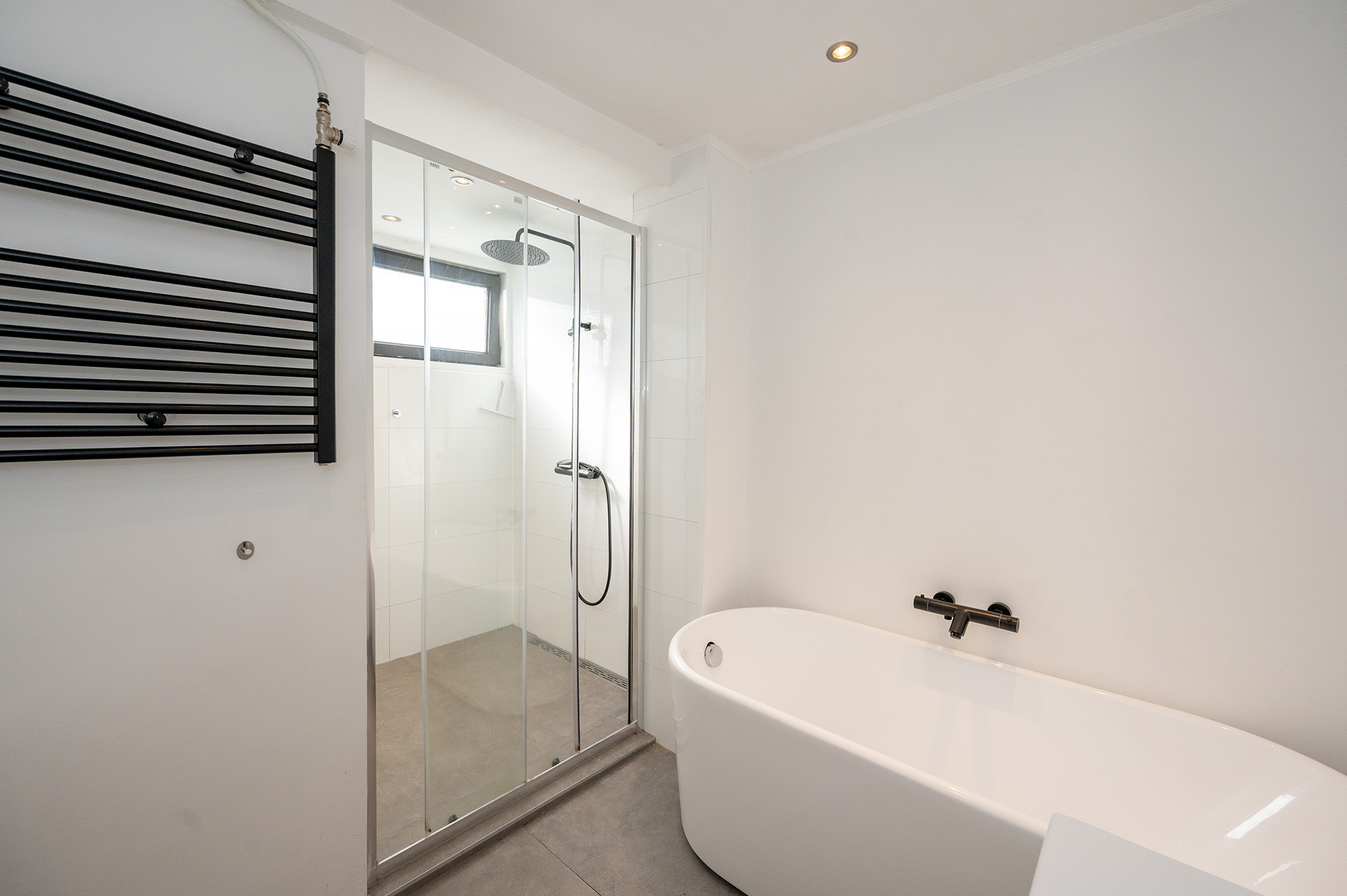 Via de trap bereikt u de overloop op de eerste verdieping, die toegang biedt tot drie slaapkamers en de badkamer. De slaapkamer aan de voorzijde van de woning is ruim van opzet en biedt middels een deur toegang tot een zonnig balkon. De overige twee slaapkamers zijn eveneens goed van formaat en kunnen flexibel worden ingericht als kinderkamer, werkkamer of logeerkamer, afhankelijk van de woonwensen. De moderne badkamer beschikt over een comfortabele inloopdouche, een vrijstaand ligbad en een wastafelmeubel met opberglades en spiegel. Hij heeft een strakke afwerking en is bovendien voorzien van inbouwspots. Op de gehele verdieping ligt een laminaat. Op de overloop vindt u de cv ketel welke in eigendom is.
