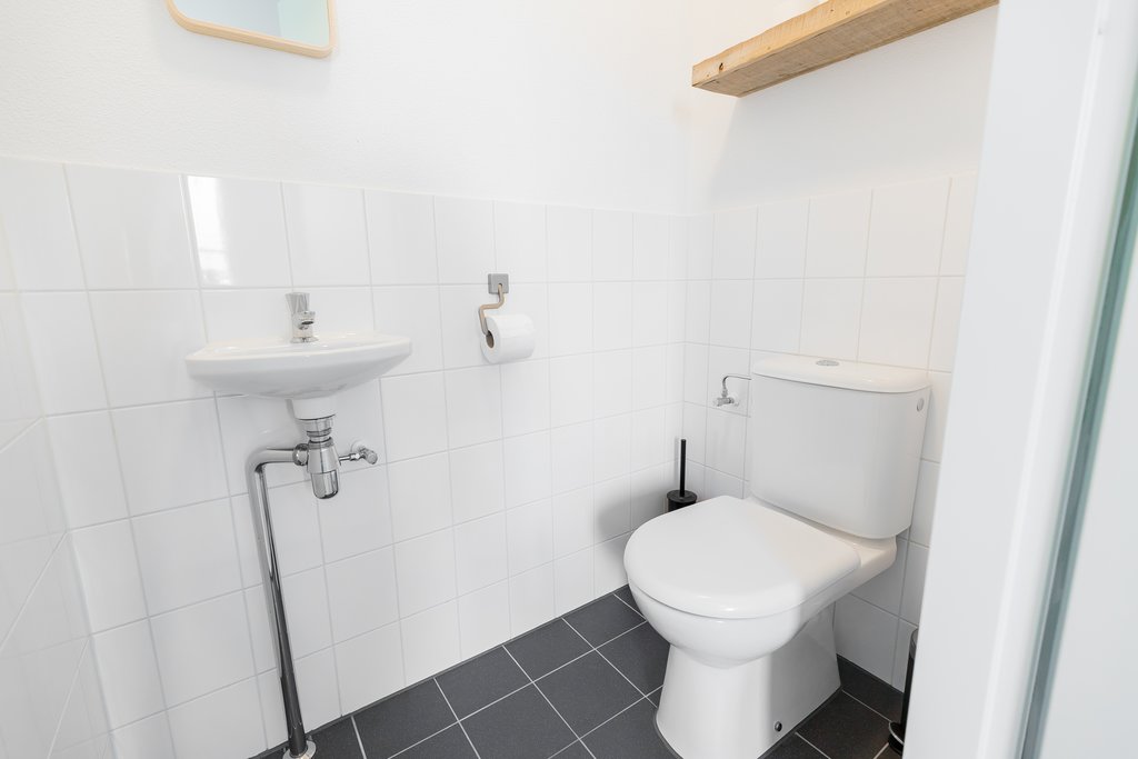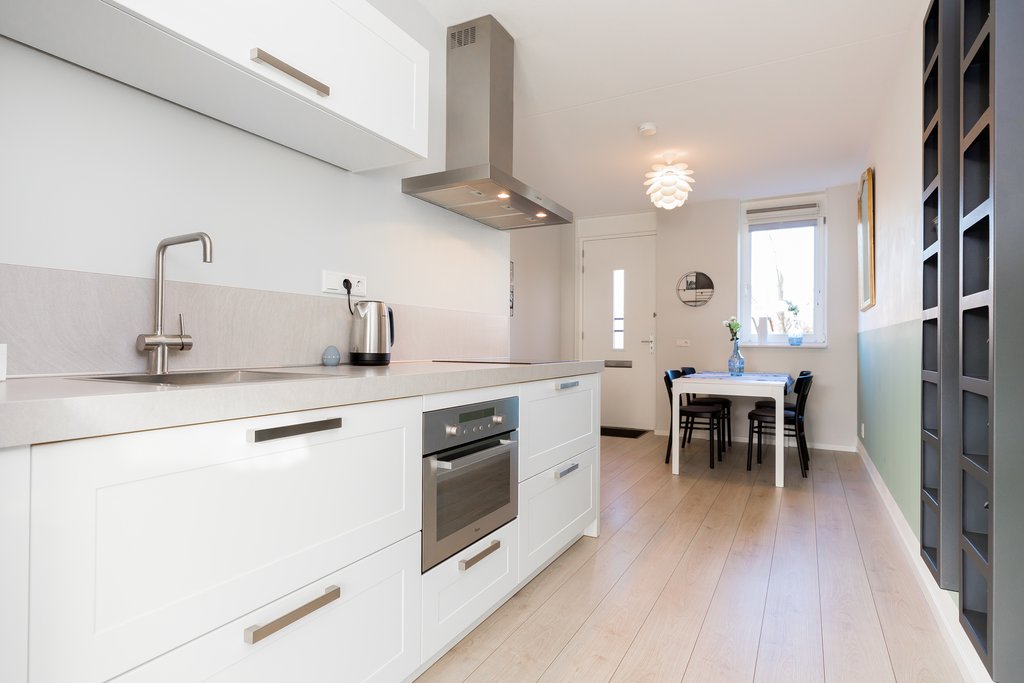 Entrance, toilet with washbasin, utility closet, dining area, kitchen, and living room. The dining area is situated at the front of the property and overlooks the city canal. The modern open kitchen is equipped with various built-in appliances, including a new Bosch fridge-freezer combination. From the kitchen, you have access to the spacious living room with large sliding doors that open onto the sunny south-facing garden. The garden also provides access to the wooden storage shed with a back entrance. The entire ground floor features a beautiful laminate floor with underfloor heating. The whole property is equipped with underfloor heating.