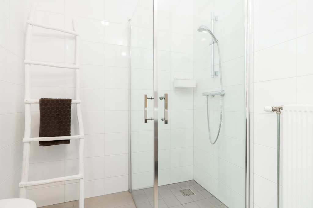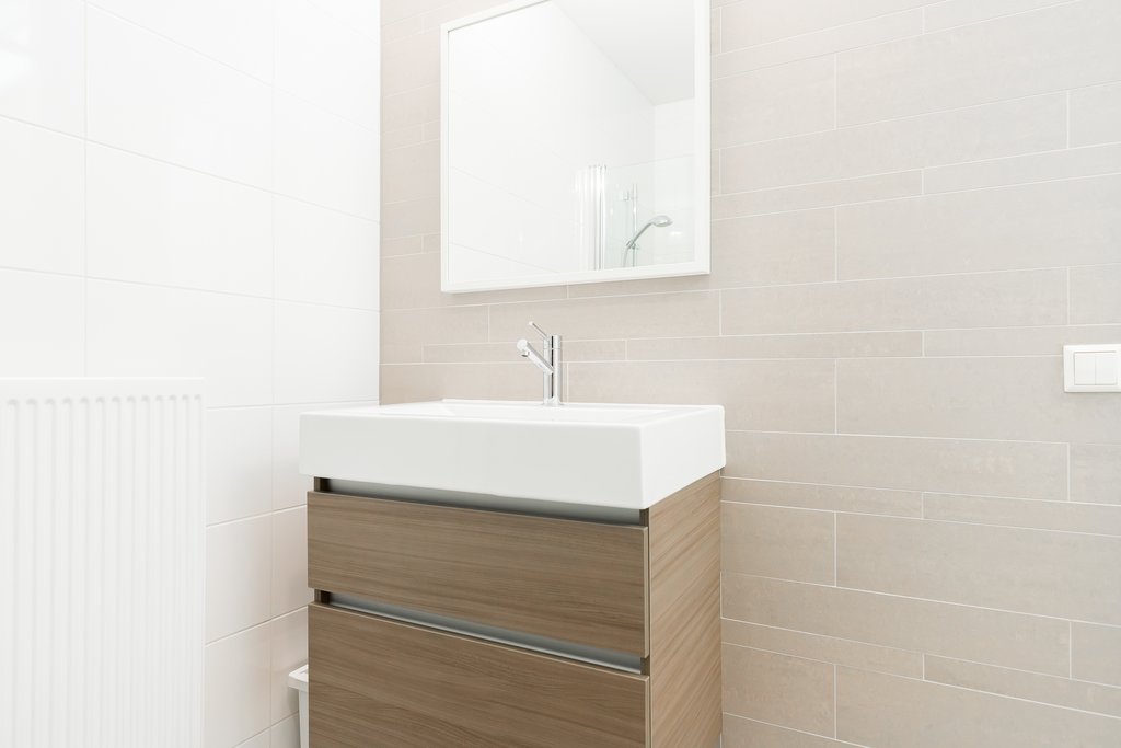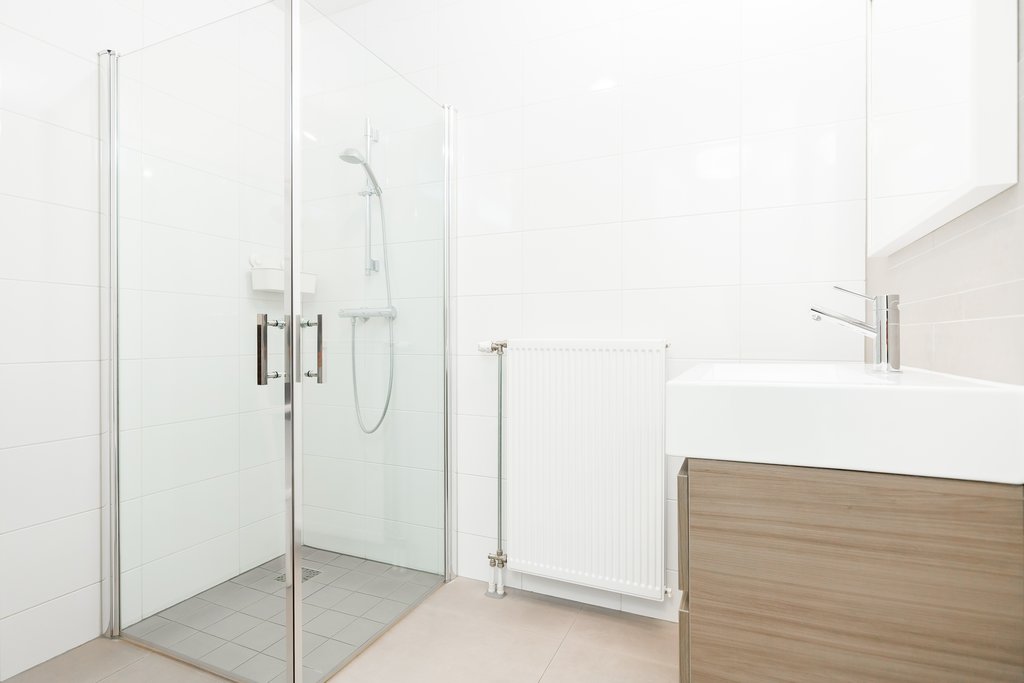 Vanuit de woonkamer heeft u via de houten trap toegang tot de 1e verdieping. Overloop met separate wasruimte, twee slaapkamers en de badkamer. De beide slaapkamers bevinden zich aan de achterzijde van de woning. De badkamer is modern betegeld en voorzien van een wastafel met meubel, inloopdouche en een tweede toilet. Ook deze verdieping is voorzien van een nette laminaatvloer in combinatie met vloerverwarming.