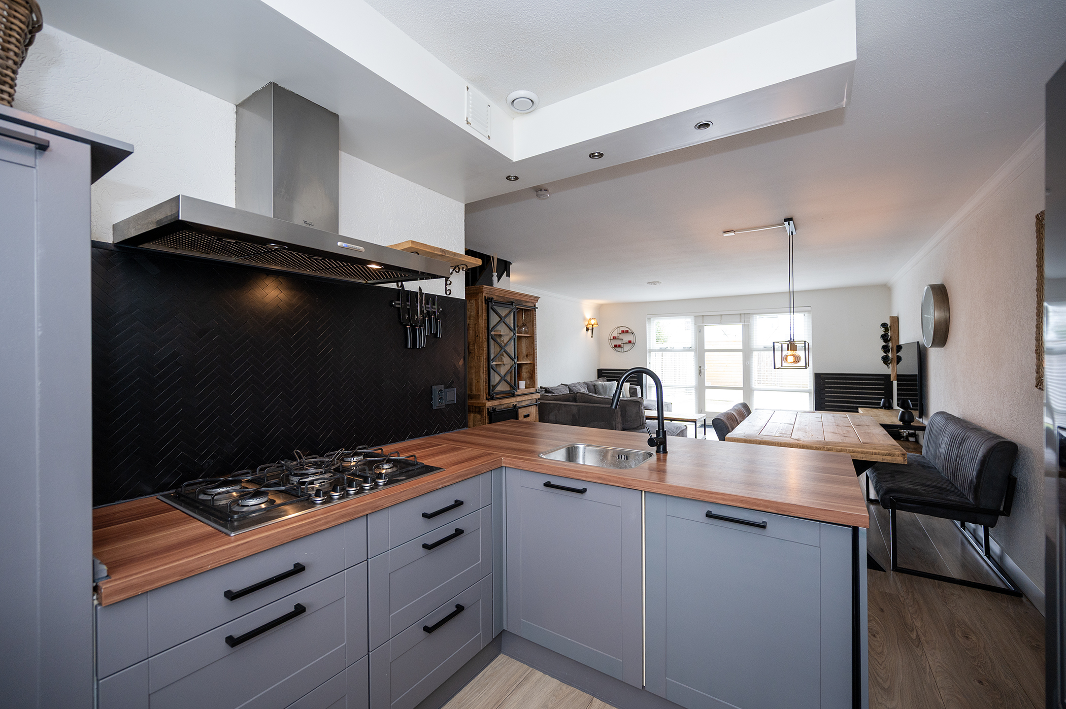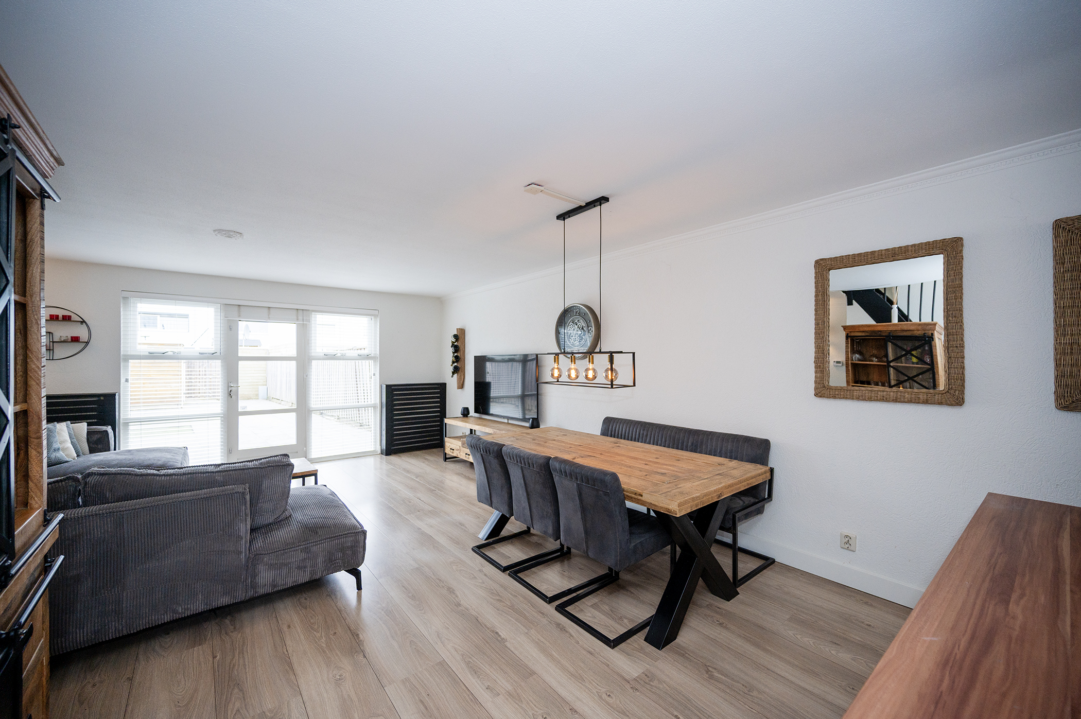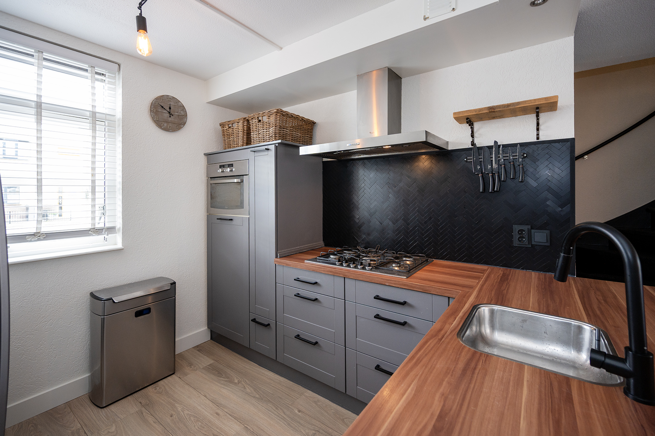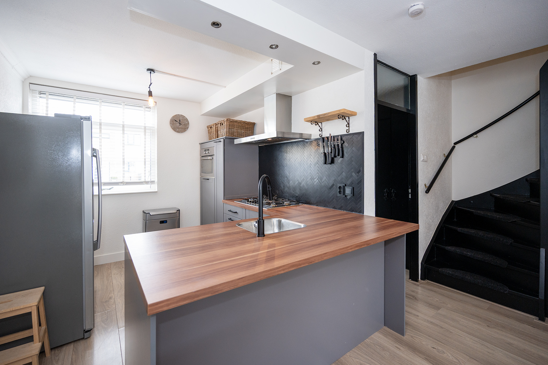 Via de entree betreedt u de woning, waar zich tevens de meterkast, toilet met fonteintje, trapopgang naar de eerste verdieping en de toegang tot de woonkamer zich bevindt. De ruime, tuingerichte woonkamer kenmerkt zich door een prettige lichtinval dankzij de grote raampartij aan de achterzijde van de woning. De directe verbinding met de achtertuin, middels een loopdeur, zorgt voor een aangename overgang tussen binnen- en buitenruimte. De indeling van de woonkamer biedt voldoende mogelijkheden voor het creëren van een comfortabele zit- en eethoek. De keuken is functioneel ingericht en voorzien van diverse apparatuur, waaronder een gaskookplaat, een afzuigkap, een vaatwasser, een oven en een koel-vriescombinatie. Hiermee is de keuken van de nodige gemakken voorzien en geschikt voor dagelijks gebruik.