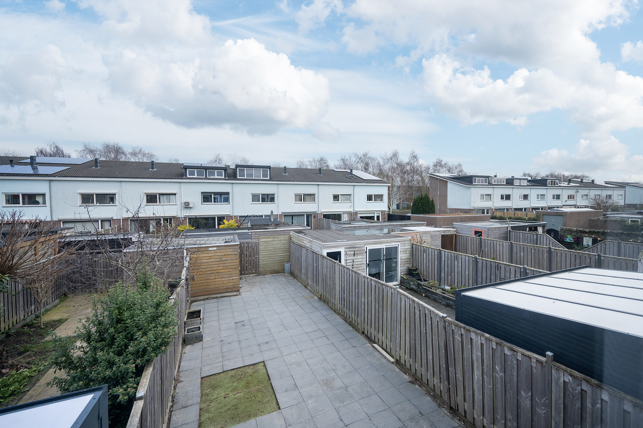 De bijzonder diepe achtertuin is gelegen op het noordoosten en biedt daardoor een aangename combinatie van zon en schaduw gedurende de dag. Dankzij de royale diepte is er voldoende ruimte voor het creëren van meerdere zitgedeeltes, speelruimte of aanvullende beplanting. De tuin is grotendeels voorzien van een stenen bestrating, hetgeen bijdraagt aan een onderhoudsvriendelijk karakter en zorgt voor een nette en verzorgde uitstraling. De achtertuin is tevens bereikbaar via een praktische achterom. Achterin de tuin bevindt zich een houten berging, geschikt voor het opbergen van tuingereedschap, fietsen en overige spullen.