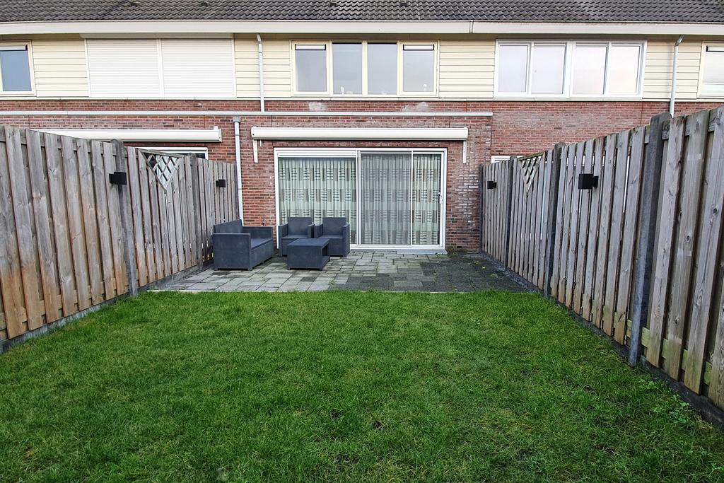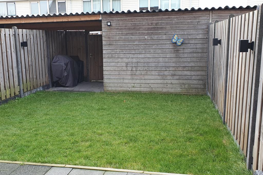 De tuin is gelegen op het zuidwesten waardoor u een gunstige zonligging heeft. De tuin is voorzien van een betegeld terras en gras waardoor hij onderhoudsvriendelijk is. De houten berging is voorzien van licht en elektra en u kunt de tuin via een achterom bereiken.
