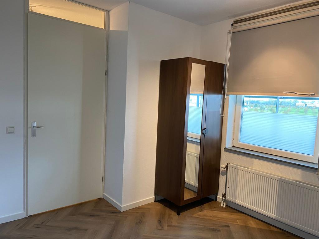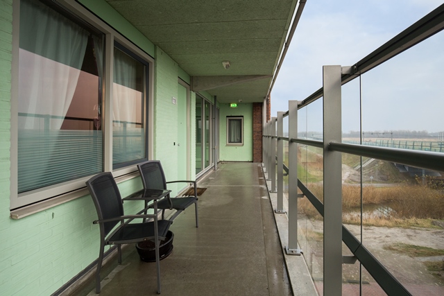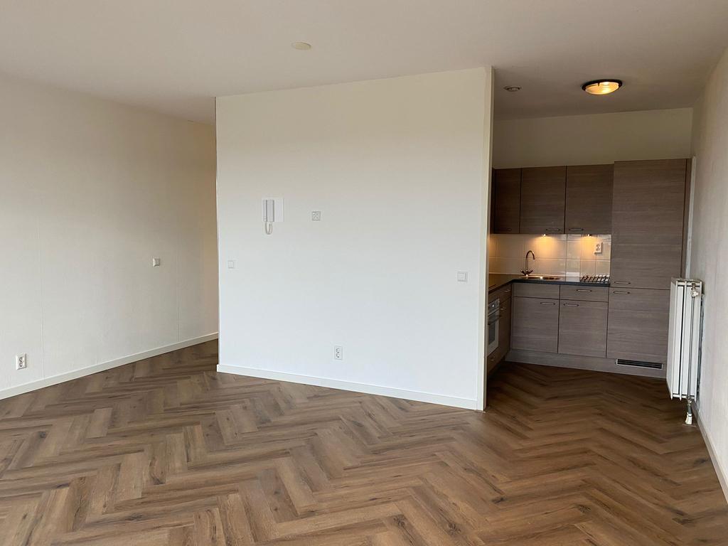 Entree, hal met meterkast toegang tot de ruime slaapkamer met inloopkast, ruime geheel betegelde badkamer met douche, wastafel en toilet. De zonnige woonkamer is voorzien van een fraaie laminaatvloer. Vanuit de woonkamer heb je mooi vrij uitzicht en de openslaande deuren naar de twee Franse balkons zorgen ervoor dat je hier ook heerlijk kan zonnen.