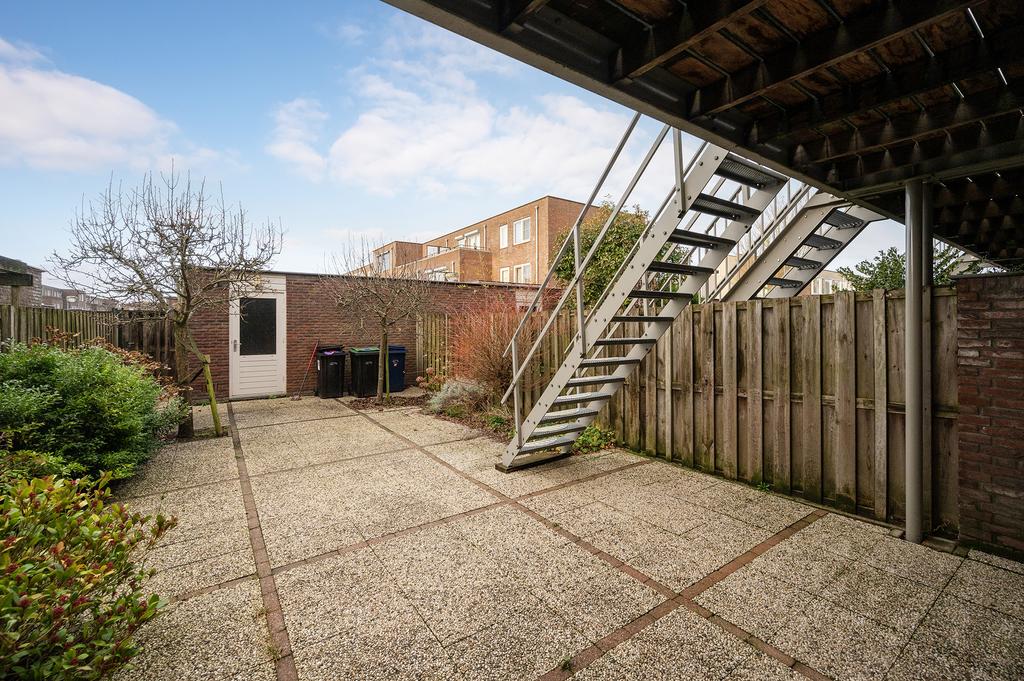 De achtertuin ligt op het zonnige zuidwesten, grotendeels bestraat en is voorzien van een stenen berging. Boven de achtertuin bevindt zich het tweede balkon, dat toegankelijk is via de eerste verdieping en via een buitentrap in de achtertuin.