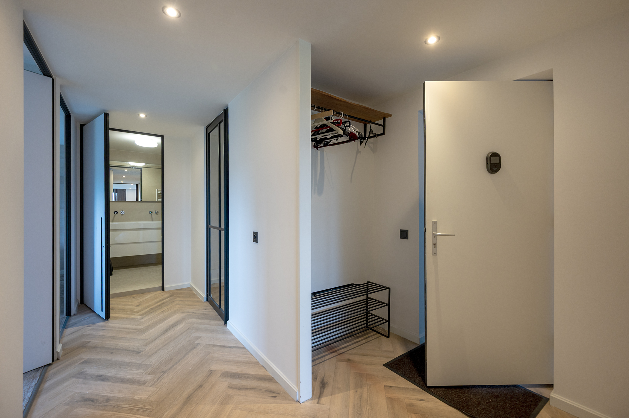 Bij binnenkomst vind je de postbussen en het bellentableau met videofooninstallatie. De centrale entree geeft toegang tot de ruime hal, vanwaar je de inpandige bergingen en de lift kunt bereiken.