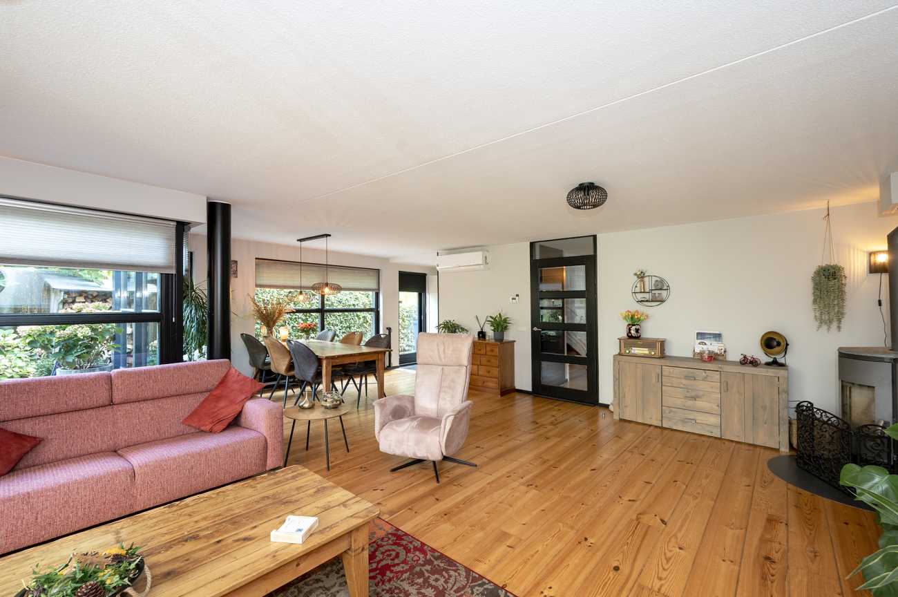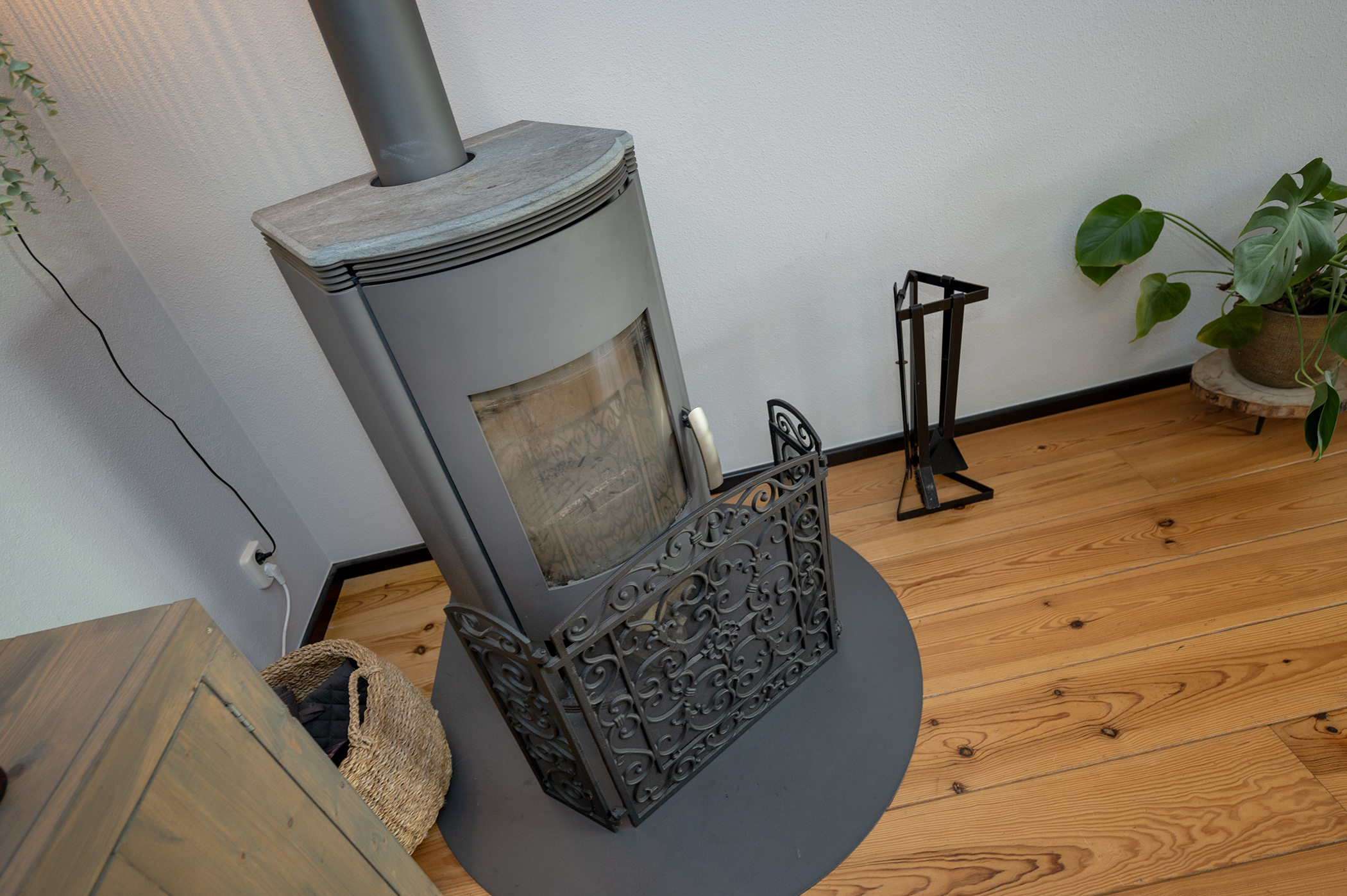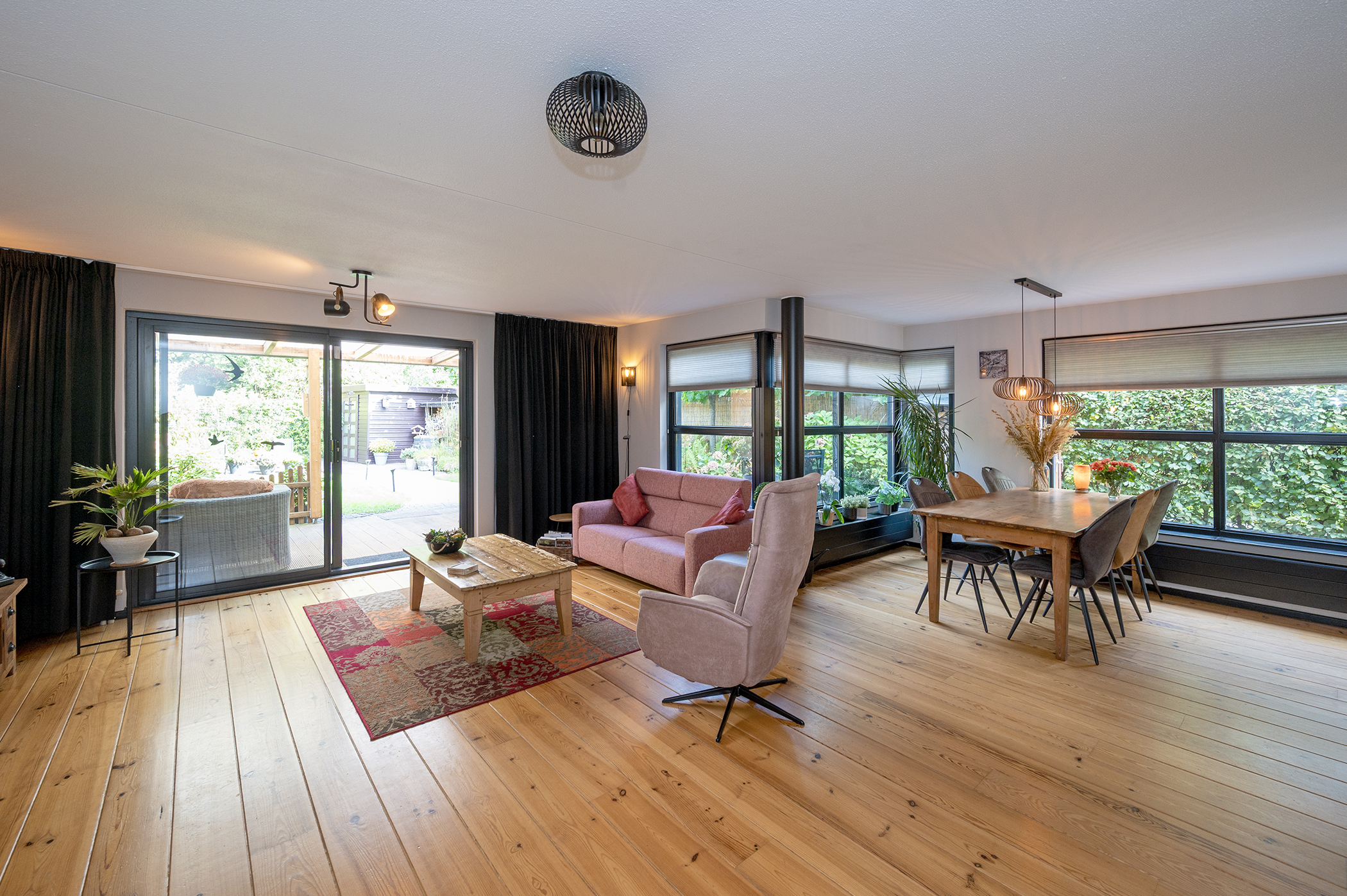 – Sfeervolle woonkamer met houten vloer, houtkachel en schuifpui