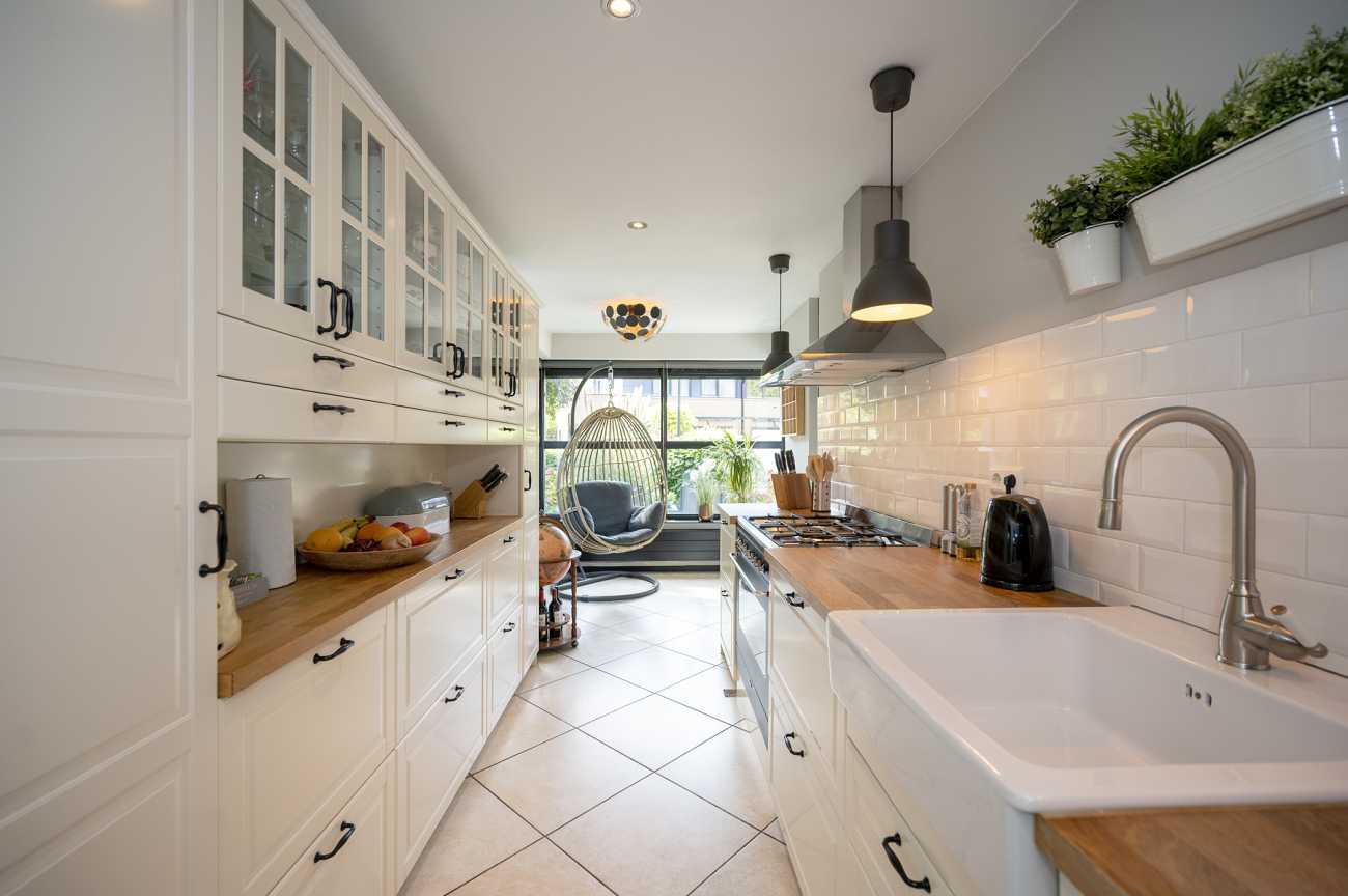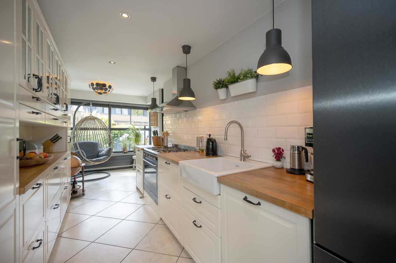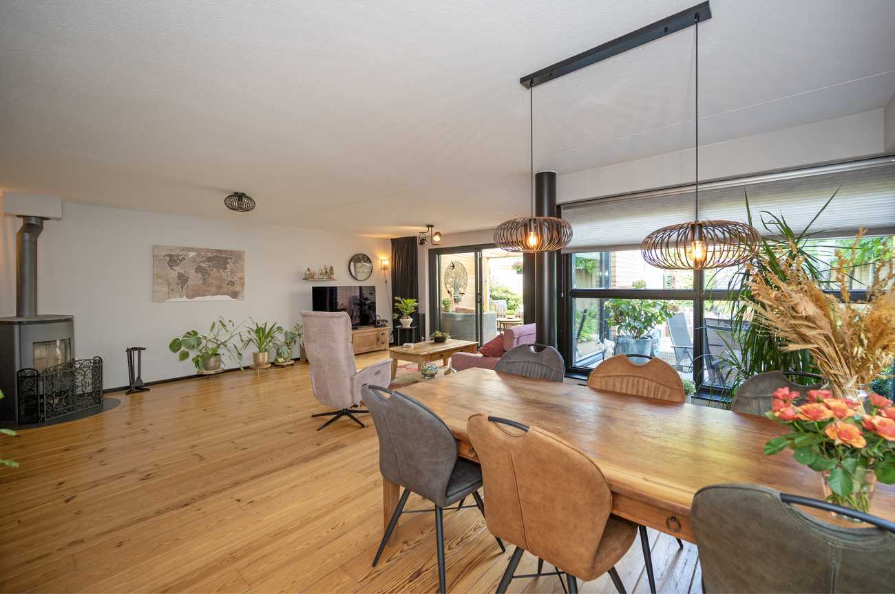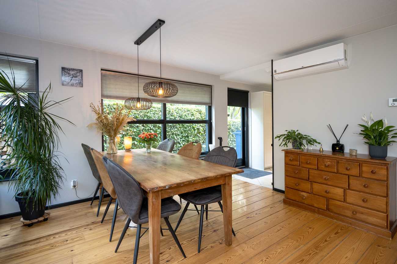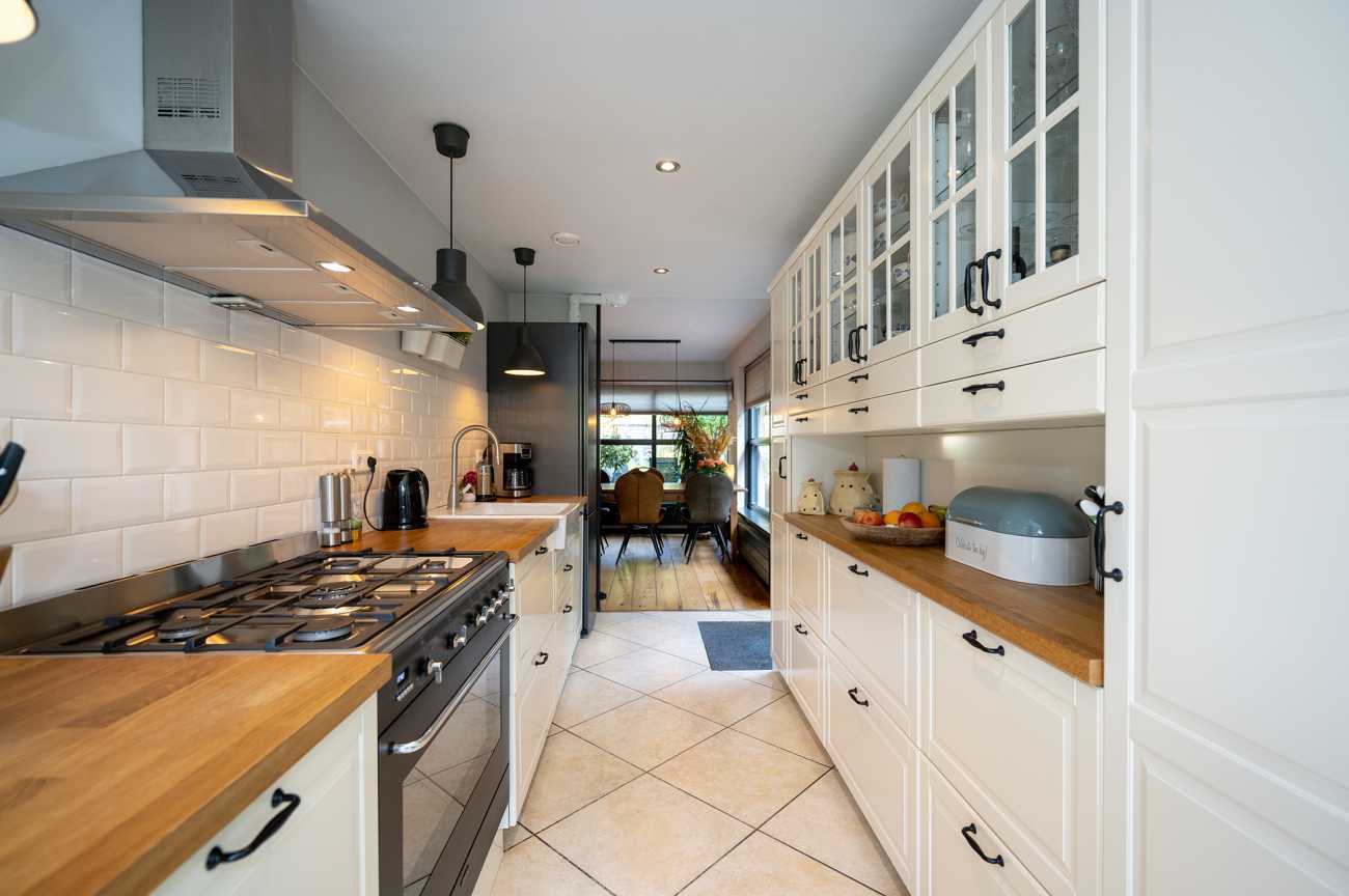De woonkamer is sfeervol en praktisch ingericht met een houten vloer, gezellige houtkachel, schuifpui en airco. Dankzij de grote ramen en schuifpui geniet u van veel licht en een fijn zicht op de tuin. De keuken bevind zich tussen de voor- en achterzijde van de woning en is praktisch opgesteld, voorzien van veel bergruimte, en divers inbouwapparatuur waaronder een XL Smeg fornuis met afzuigkap vaatwasser, en een koel-vries combinatie.