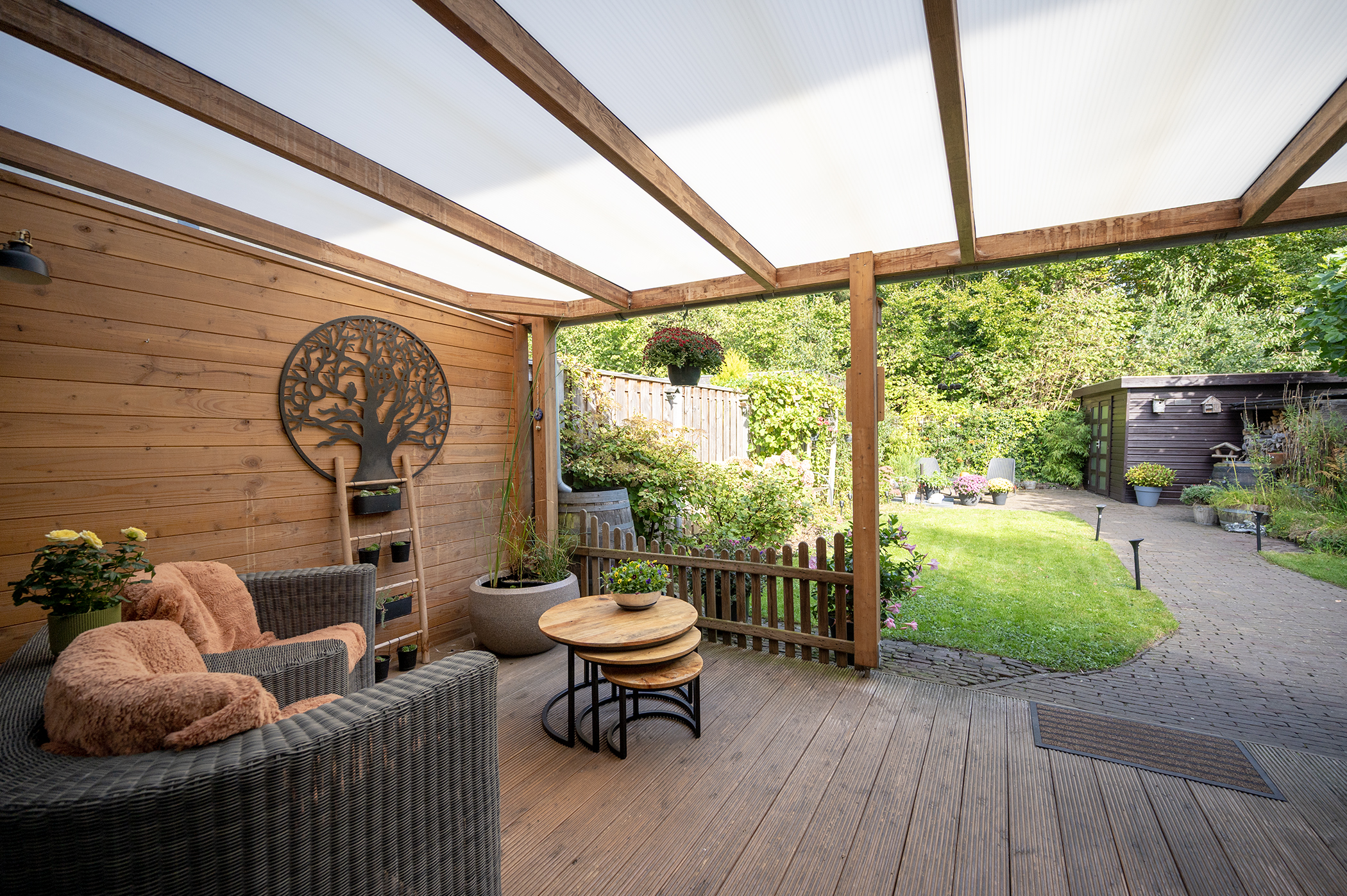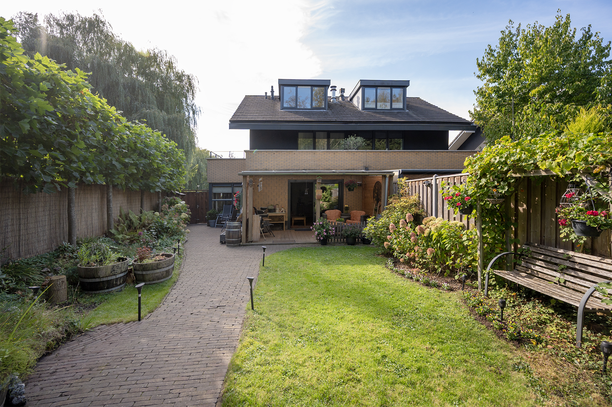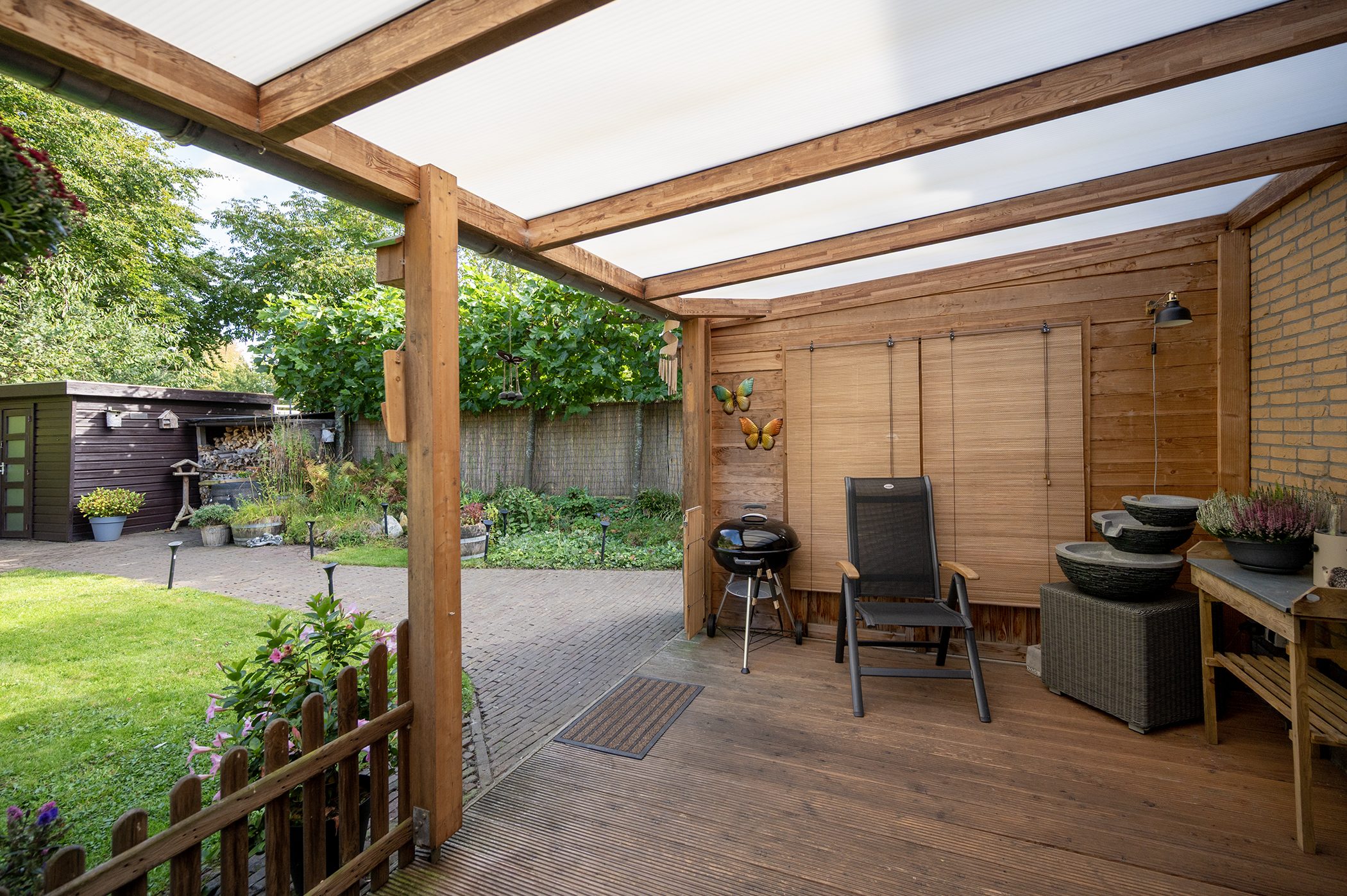 De tuin is een van de echte pluspunten van deze woning. Dankzij de aankoop van extra grond is de achtertuin bijzonder ruim en biedt deze volop mogelijkheden om te spelen, te tuinieren of te ontspannen. De sfeervolle houten overkapping met heather zorgt voor een gezellige plek waar u het hele jaar door buiten kunt zitten. Daarnaast zijn er meerdere zitplekken, zodat u altijd kunt kiezen voor zon of schaduw. Ook de zijtuin en voortuin bieden extra gebruiksmogelijkheden.