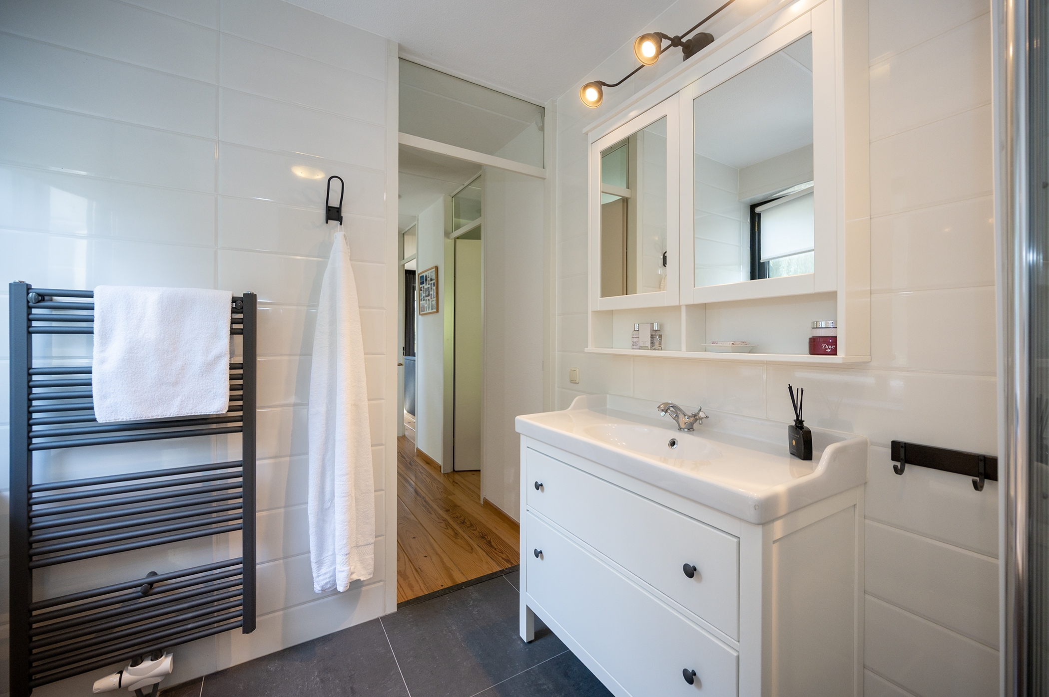 – Moderne badkamer met ligbad, inloopdouche en wastafelmeubel