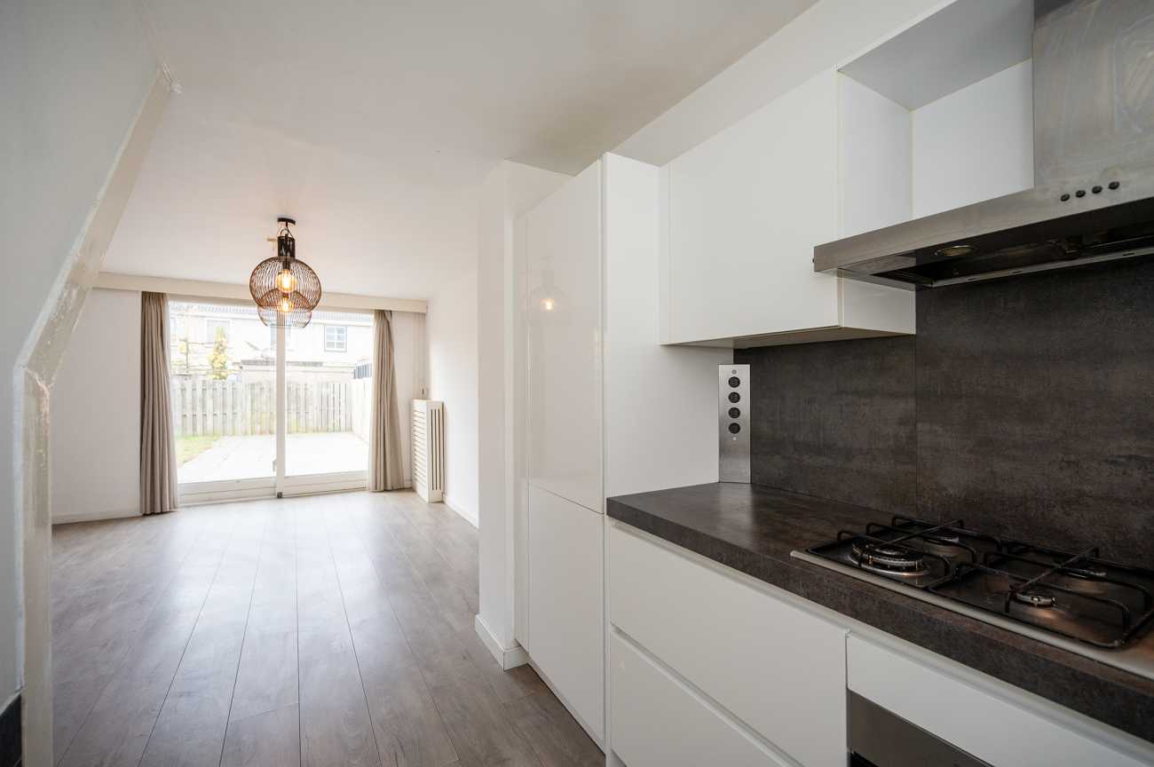 Via de entree bereikt u de hal, waar zich een geheel betegelde toiletruimte bevindt, voorzien van een zwevend toilet en een fonteintje. Vanuit de hal heeft u toegang tot de ruime woonkamer. De woonkamer is breed opgezet en beschikt over grote raampartijen die zorgen voor veel natuurlijke lichtinval. Daarnaast biedt de schuifpui directe toegang tot de zonnige achtertuin. Aan de voorzijde van de woning bevindt zich de complete keuken in L-opstelling. Deze is uitgerust met ruime opbergmogelijkheden en diverse inbouwapparatuur, waaronder een gaskookplaat, afzuigkap, oven, vaatwasser, koelkast en vriezer. De gehele begane grond is afgewerkt met een nette laminaatvloer. Vanuit de woonkamer heeft u toegang tot de bijkeuken, waar u veel spullen kunt opslaan. Vanuit de bijkeuken bereikt u de garage, welke tevens vanuit buitenom te betreden is middels een loopdeur. De kanteldeur is aan de binnenzijde afgesloten, waardoor de ruimte voor diverse doeleinden gebruikt kan worden. De ruimte is verwarmd, dus ideaal voor kantoor of wellicht slapen op de begane grond.