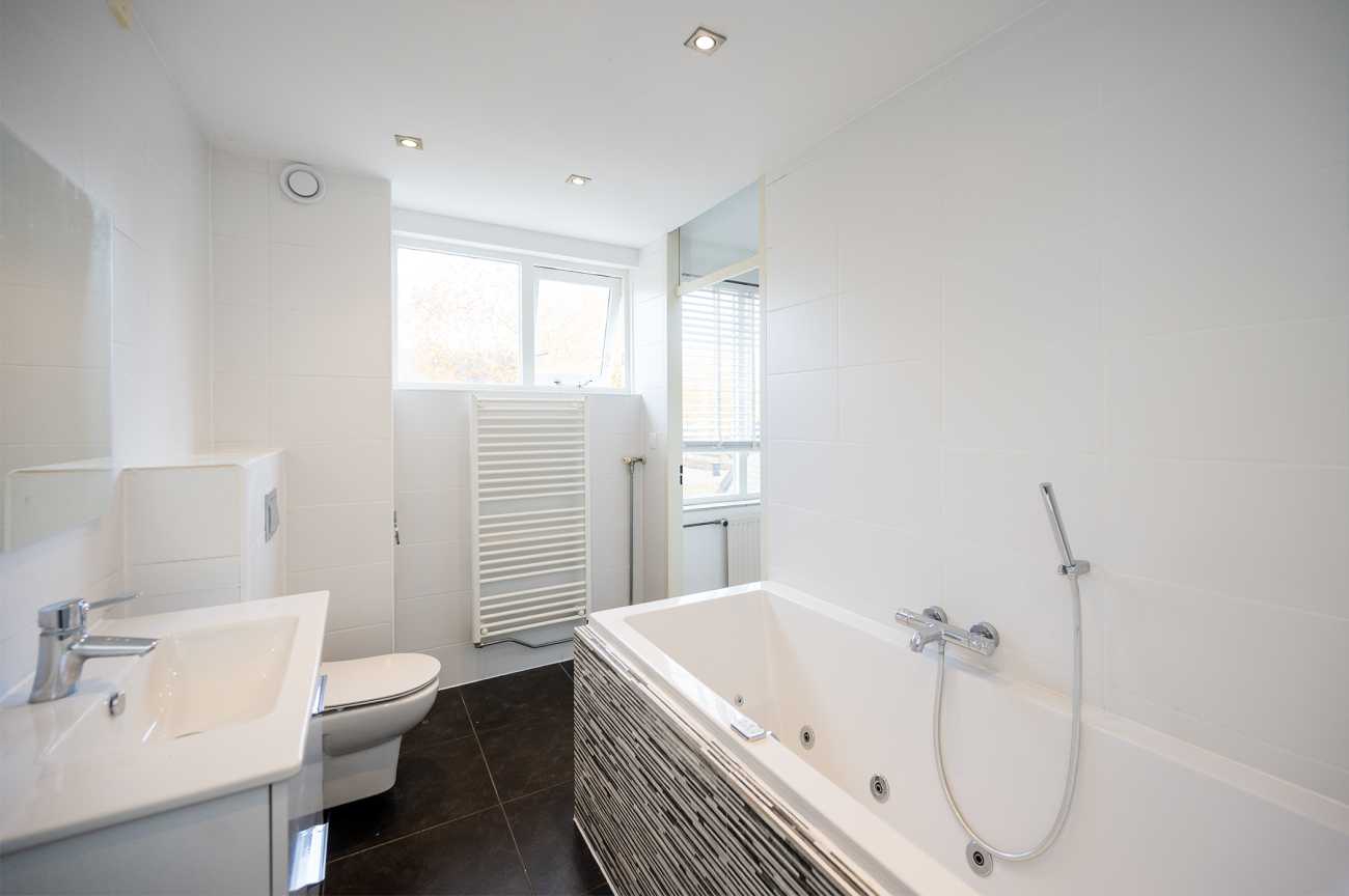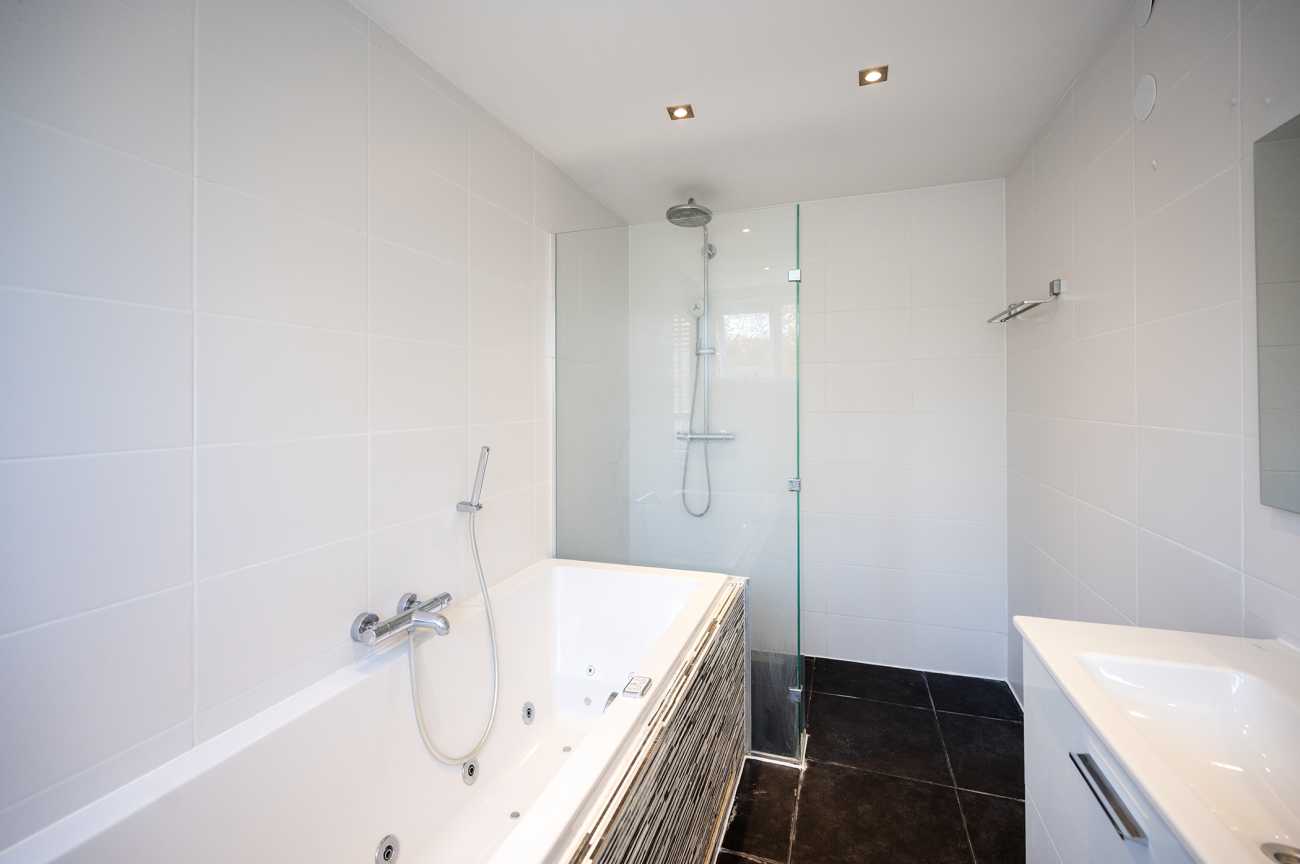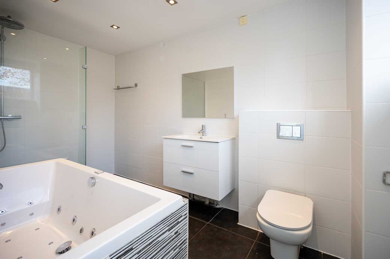 De eerste verdieping beschikt over een ruime overloop met een vaste trapopgang naar de tweede etage. Vanuit deze overloop heeft u toegang tot drie goed bemeten slaapkamers. De volledig betegelde badkamer is compleet uitgevoerd en voorzien van een dubbele wastafel met meubel, een bubbelbad, een inloopdouche, een tweede toilet en een designradiator. De gehele verdieping is afgewerkt met een nette laminaatvloer.