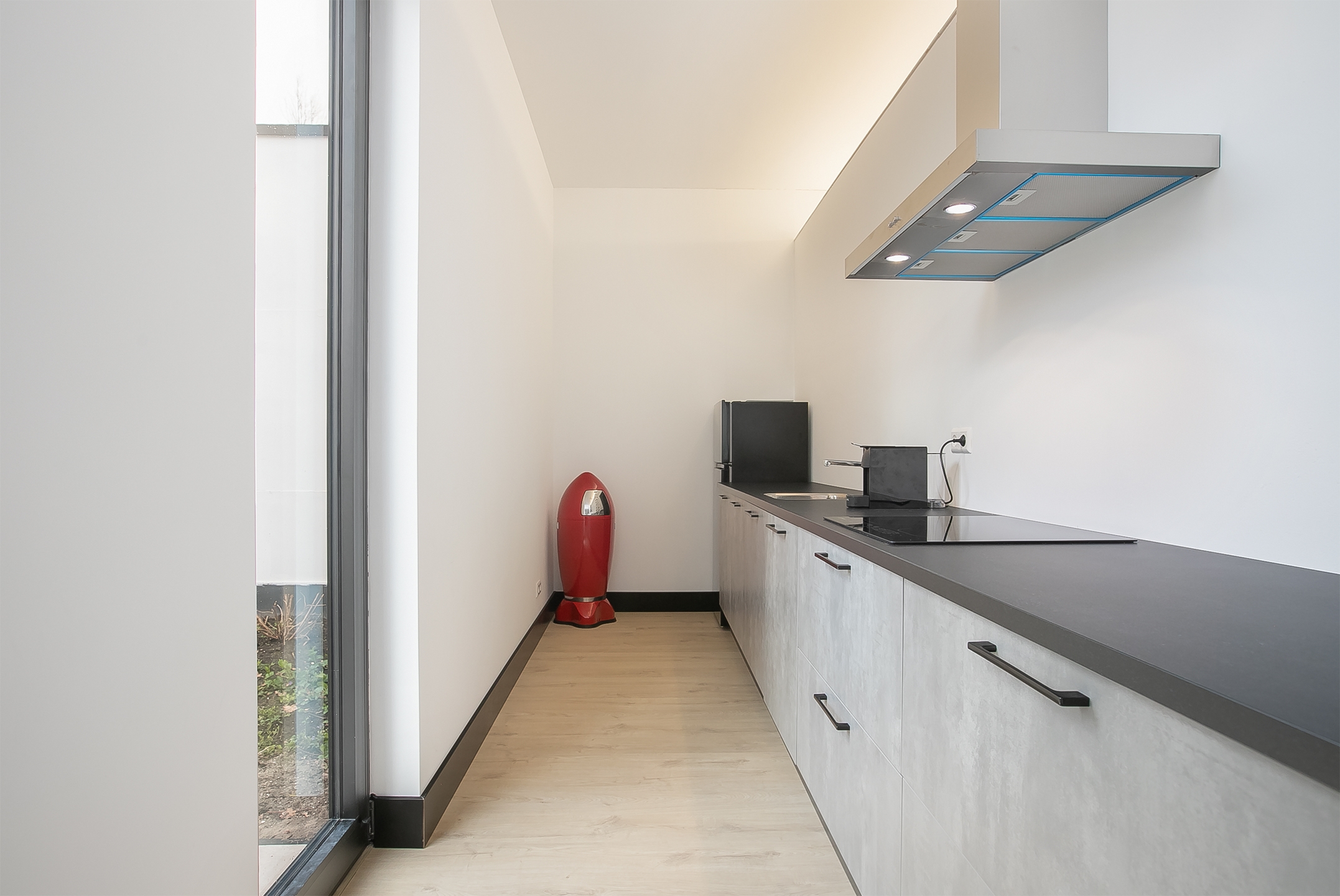 De woning beschikt over een eigen oprit en zelfstandige toegang. Bij binnenkomst bereikt u de entreehal die toegang bied naar de slaapkamer, badkamer, het separate toilet, de wasruimte met inpandige berging en de royale woonkamer met open keuken. De woonkamer is licht en uitnodigend dankzij grote ramen en deuren aan de tuinzijde, die een naadloze verbinding creëren tussen binnen en buiten. De ruimte is ingericht met een comfortabele zithoek inclusief televisie en een ronde eettafel met vier stoelen. De stijlvolle open keuken is voorzien van een lang aanrechtblad, koelkast, magnetron en moderne inbouwapparatuur zoals een inductiekookplaat, vaatwasser en afzuigkap. De badkamer is afgewerkt met elegante grootformaat tegels en uitgerust met een regendouche, wastafel met meubel en een spiegel met ledverlichting. Het separate toilet naast de badkamer is volledig in dezelfde stijl uitgevoerd. Daarnaast is er een zeer ruime wasruimte met een wasmachine/droger en extra bergruimte, ideaal voor huishoudelijk gemak. De royale slaapkamer biedt een groot tweepersoonsbed, een bureau en een garderobekast met spiegel, waardoor comfort en functionaliteit perfect samenkomen.