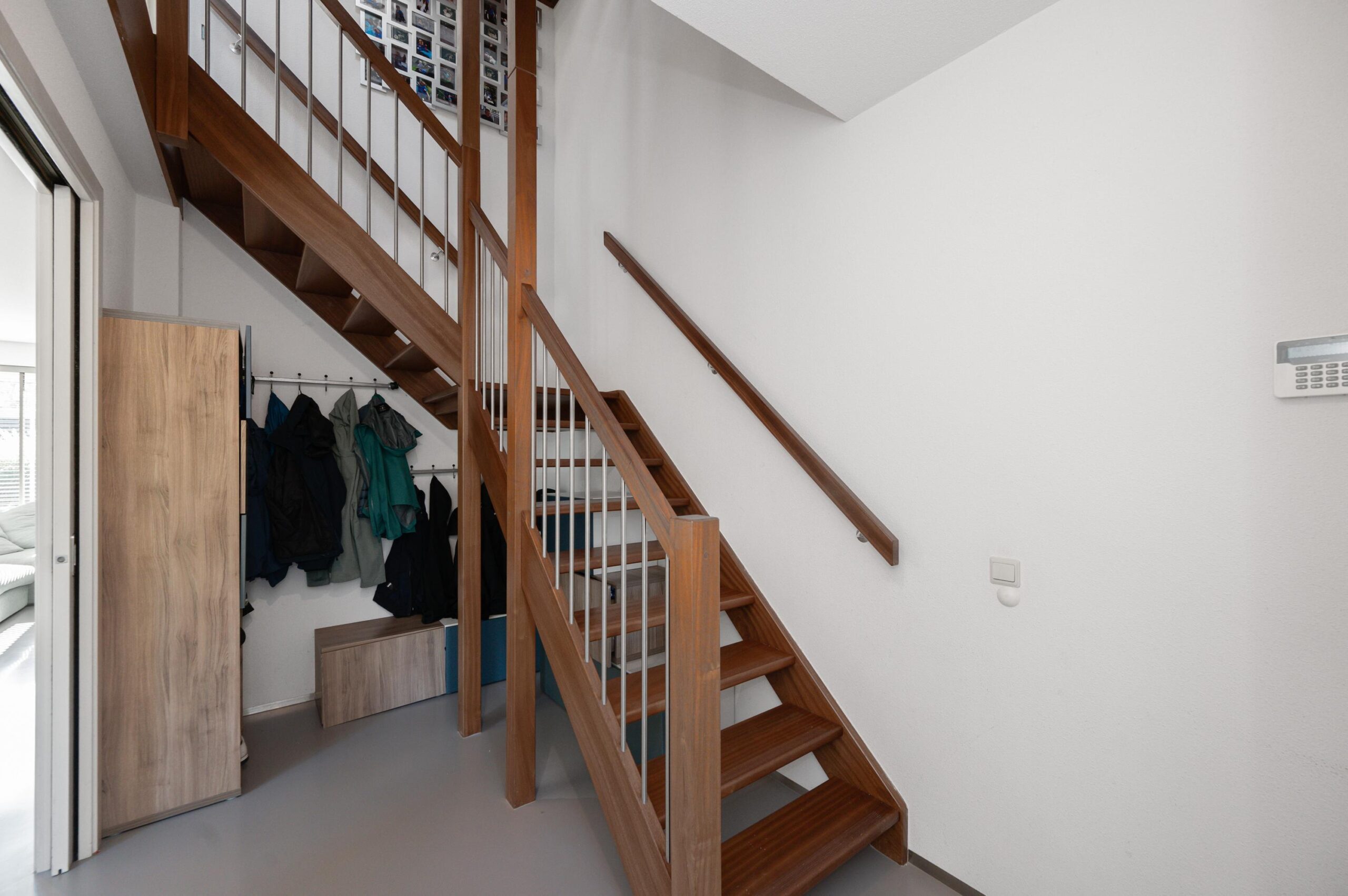 Like the floors below, the second floor features a sleek cast floor with underfloor heating and air conditioning for optimal temperature control. Here you will find two more spacious bedrooms and a second bathroom with a shower, sink, and toilet. From the landing, you have access to the first roof terrace, where you can enjoy the sun in peace and privacy. You have an unobstructed view of the greenery here and sit comfortably sheltered. A staircase on this terrace leads to the spacious second roof terrace on the third floor.