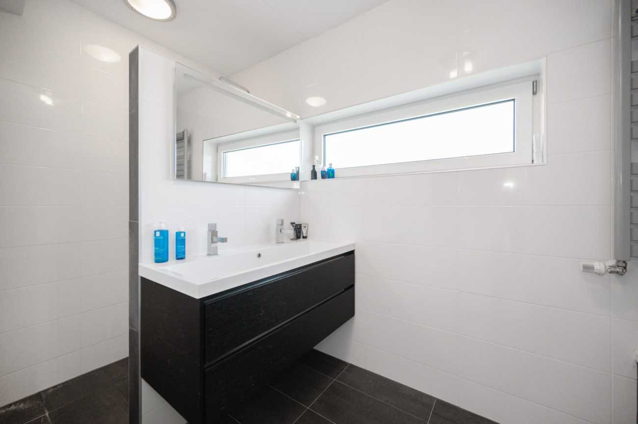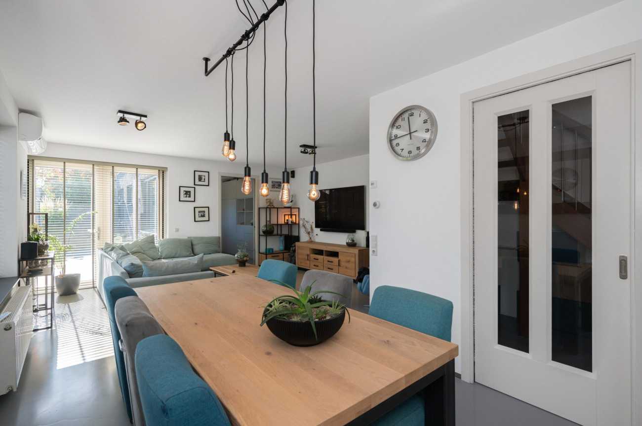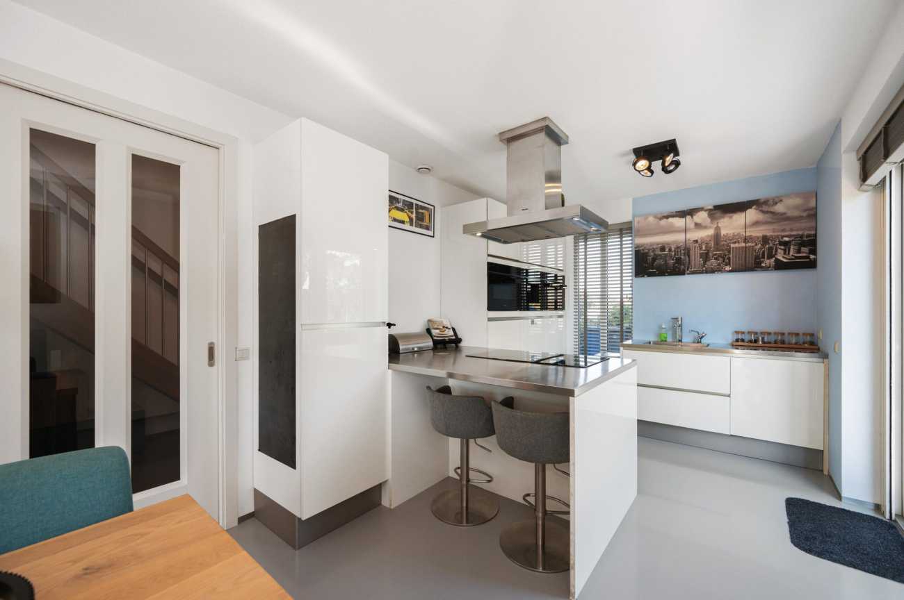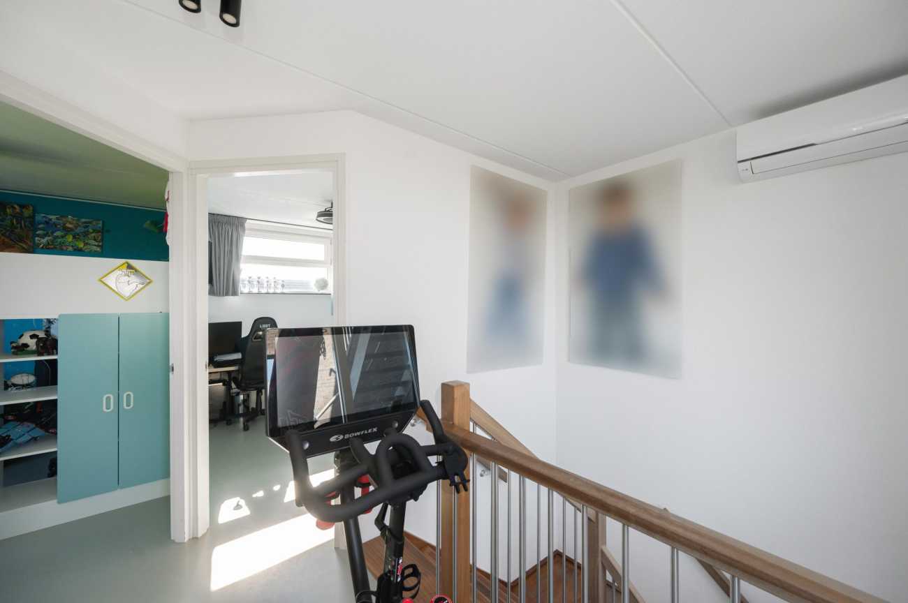 Upon entering, you will find the meter cupboard, toilet with washbasin, staircase to the upper floor, and access to the living room in the hall. Here, you immediately feel the tranquility and luxury that this home exudes. The sleek cast floor extends throughout all rooms and, together with the underfloor heating (individually adjustable per room), forms the basis for modern and comfortable living. The atmospheric living room with large windows offers a lovely place to be together. There is plenty of natural light entering the room, and the walls and ceilings are finished with clean lines. Thanks to the air conditioning, you can always keep the temperature pleasant, even during warmer days. From the living room, you step straight into the well-maintained garden through the French doors, which has a back entrance. The open kitchen with a cozy bar area is equipped with various built-in appliances, including an induction hob with extractor hood, combination microwave oven, built-in coffee maker, fridge-freezer, and a dishwasher. A lovely space to gather, cook, and enjoy long meals! From the kitchen, you walk straight into the garden through the French doors. Additionally, on the ground floor there is a practical workspace that can be closed off with sliding doors. This is an ideal space for working from home or, for example, as a playroom for the children. From this room, you also have access to the utility room/storage area, where you can store many items, among other things.