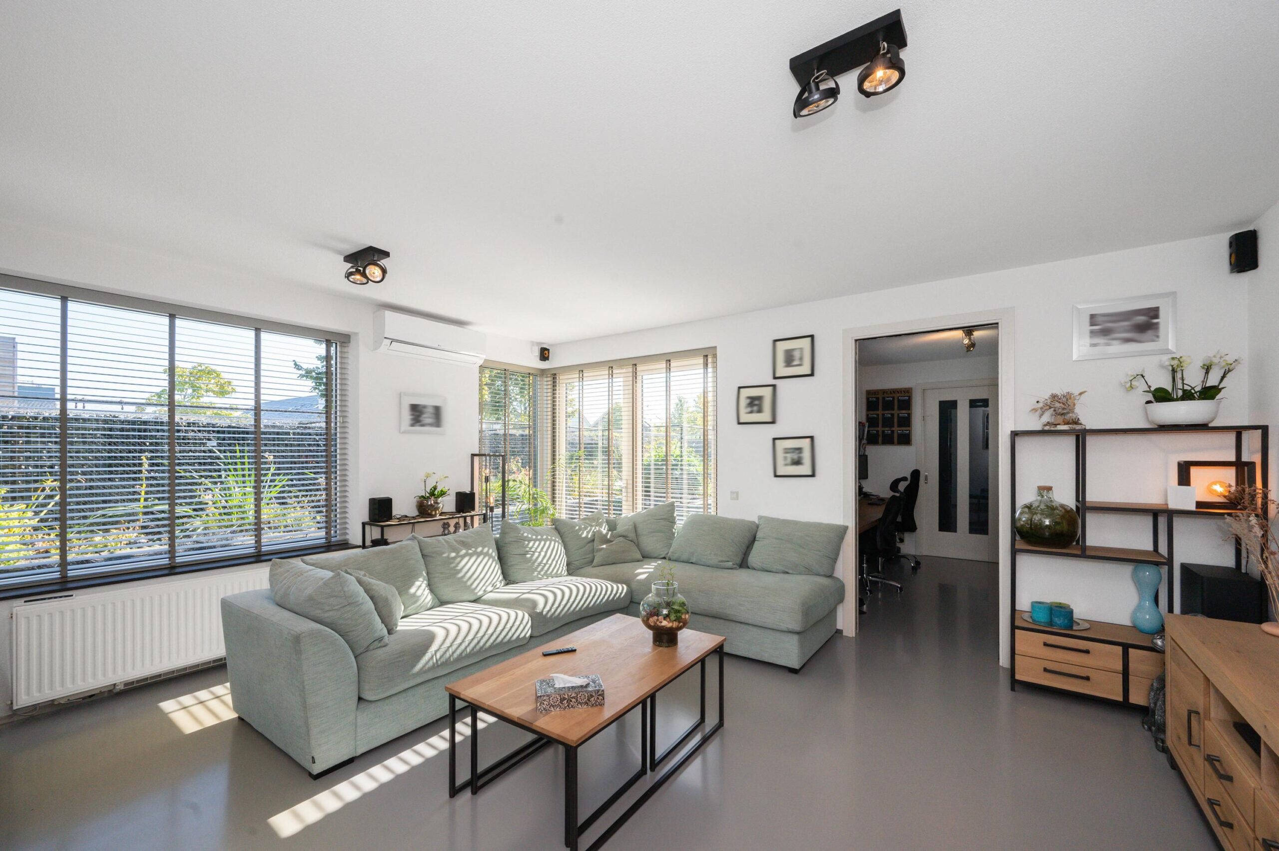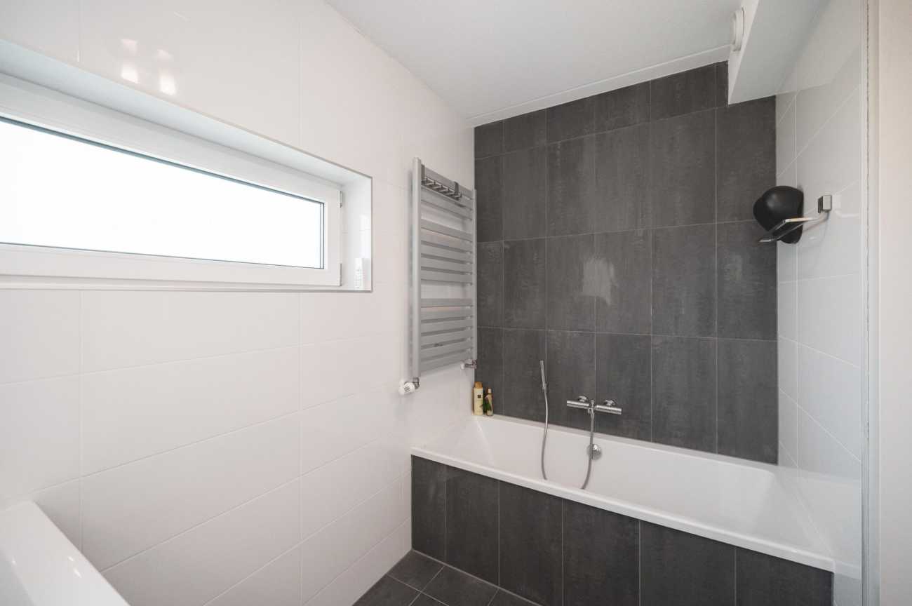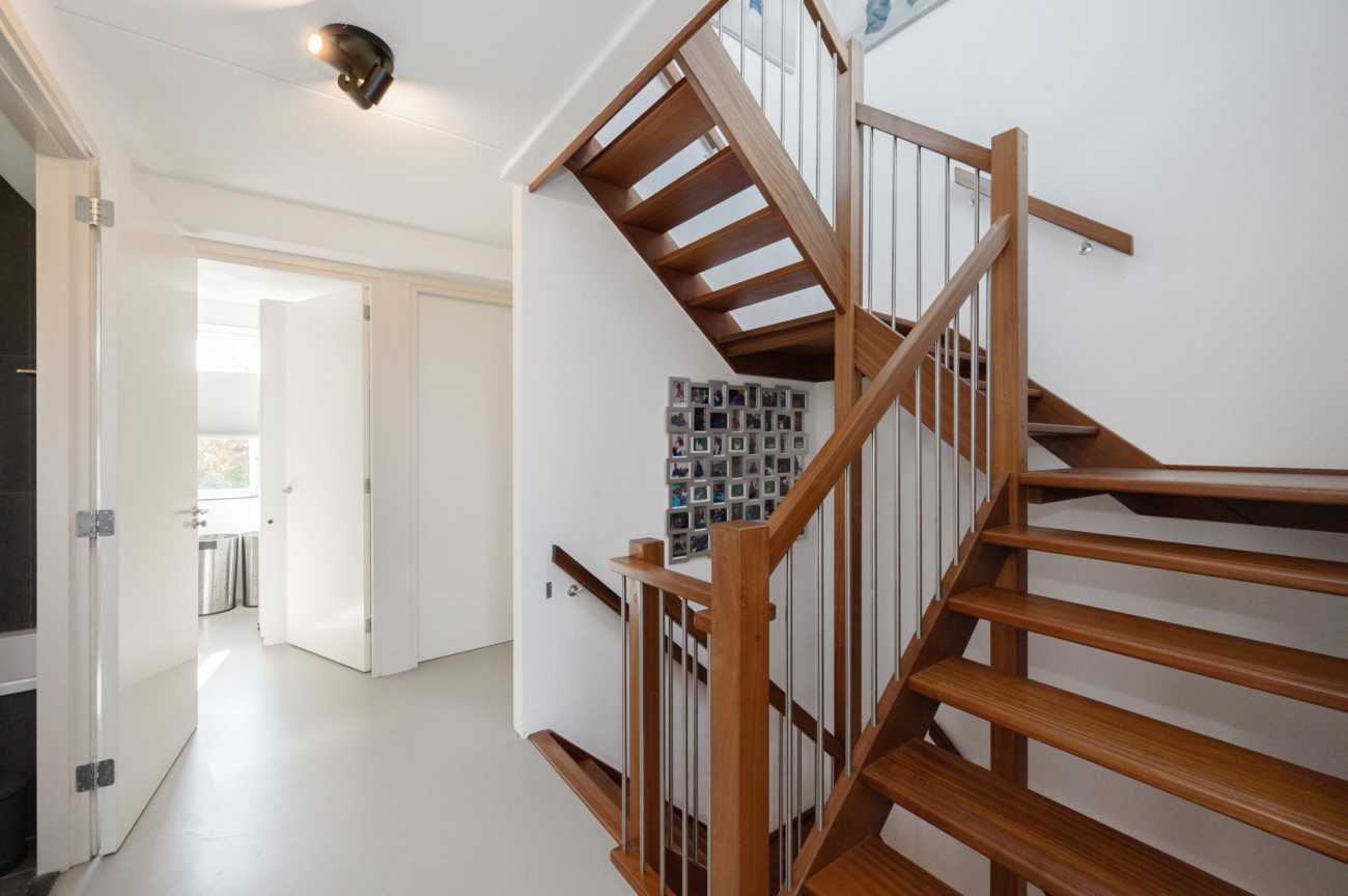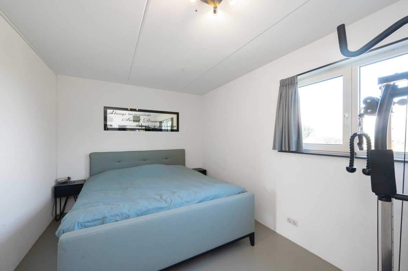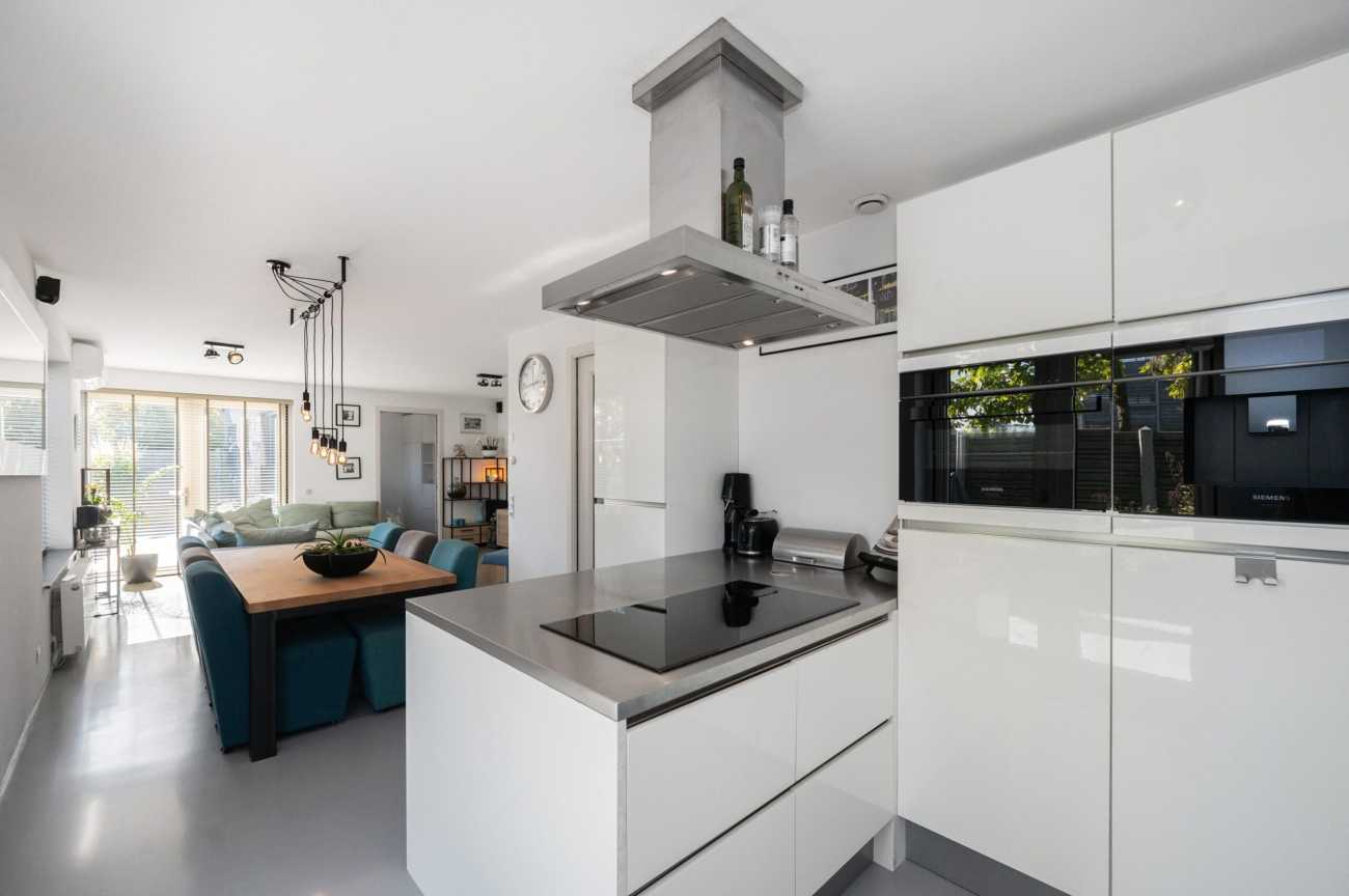 Upon entering, you will find the meter cupboard, toilet with washbasin, staircase to the upper floor, and access to the living room in the hall. Here, you immediately feel the tranquility and luxury that this home exudes. The sleek cast floor extends throughout all rooms and, together with the underfloor heating (individually adjustable per room), forms the basis for modern and comfortable living. The atmospheric living room with large windows offers a lovely place to be together. There is plenty of natural light entering the room, and the walls and ceilings are finished with clean lines. Thanks to the air conditioning, you can always keep the temperature pleasant, even during warmer days. From the living room, you step straight into the well-maintained garden through the French doors, which has a back entrance. The open kitchen with a cozy bar area is equipped with various built-in appliances, including an induction hob with extractor hood, combination microwave oven, built-in coffee maker, fridge-freezer, and a dishwasher. A lovely space to gather, cook, and enjoy long meals! From the kitchen, you walk straight into the garden through the French doors. Additionally, on the ground floor there is a practical workspace that can be closed off with sliding doors. This is an ideal space for working from home or, for example, as a playroom for the children. From this room, you also have access to the utility room/storage area, where you can store many items, among other things.