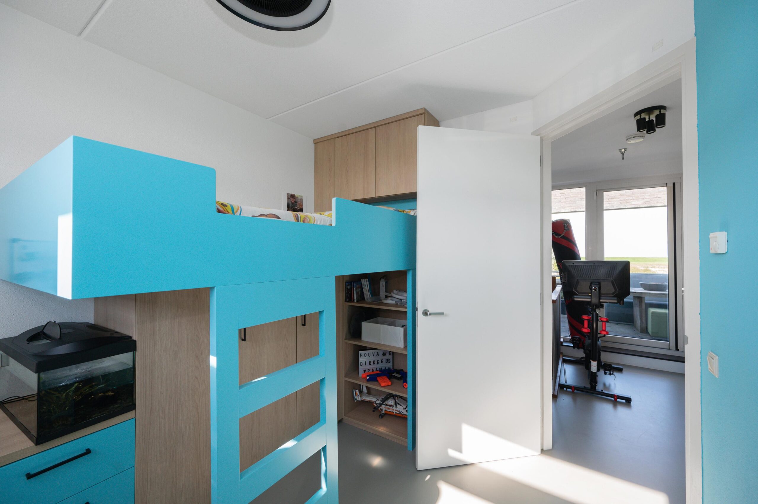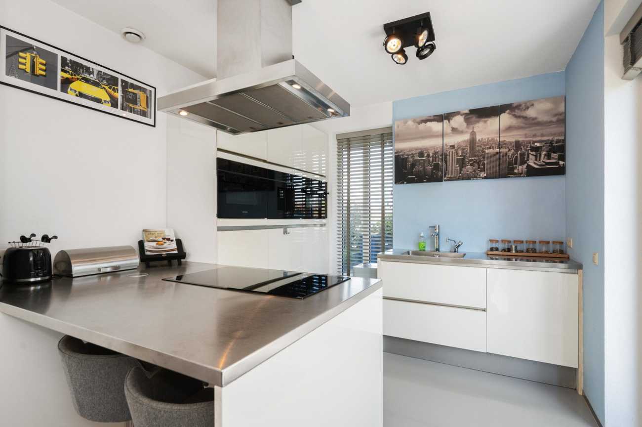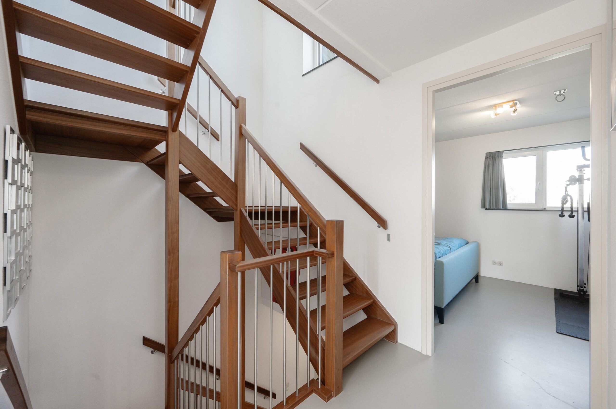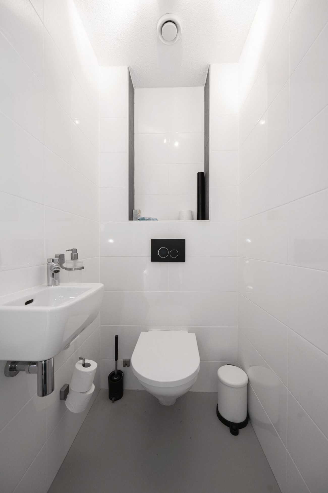 Upon entering, you will find the meter cupboard, toilet with washbasin, staircase to the upper floor, and access to the living room in the hall. Here, you immediately feel the tranquility and luxury that this home exudes. The sleek cast floor extends throughout all rooms and, together with the underfloor heating (individually adjustable per room), forms the basis for modern and comfortable living. The atmospheric living room with large windows offers a lovely place to be together. There is plenty of natural light entering the room, and the walls and ceilings are finished with clean lines. Thanks to the air conditioning, you can always keep the temperature pleasant, even during warmer days. From the living room, you step straight into the well-maintained garden through the French doors, which has a back entrance. The open kitchen with a cozy bar area is equipped with various built-in appliances, including an induction hob with extractor hood, combination microwave oven, built-in coffee maker, fridge-freezer, and a dishwasher. A lovely space to gather, cook, and enjoy long meals! From the kitchen, you walk straight into the garden through the French doors. Additionally, on the ground floor there is a practical workspace that can be closed off with sliding doors. This is an ideal space for working from home or, for example, as a playroom for the children. From this room, you also have access to the utility room/storage area, where you can store many items, among other things.