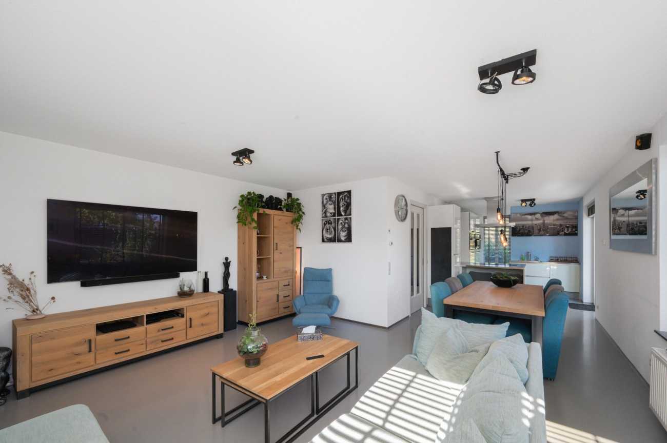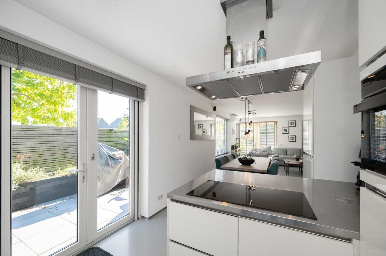 Bij binnenkomst vindt u in de hal de meterkast, toilet met fontein, trapopgang naar boven en toegang tot de woonkamer. U voelt hier direct de rust en luxe die deze woning uitstraalt. De strakke gietvloer loopt door in alle ruimtes en vormt samen met de vloerverwarming (per kamer regelbaar) de basis voor modern en comfortabel wonen. De sfeervolle woonkamer met grote raampartijen biedt een fijne plek om samen te zijn. Er is veel natuurlijk lichtinval dat binnen treedt en de wanden en plafonds zijn strak afgewerkt. Door de aanwezige airco, houdt u de temperatuur altijd aangenaam, ook tijdens de warmere dagen. Vanuit de woonkamer stapt u via de openslaande deuren zo de verzorgde tuin in, met achterom. De open keuken met gezellig zitbarretje is voorzien van diverse inbouwapparatuur waaronder een inductiekookplaat met afzuigkap, combi magnetron-oven, inbouw koffiezetapparaat, koel-vries combinatie en een vaatwasser. Een fijne ruimte om samen te komen, te kokkerellen en lang te tafelen! Vanuit de keuken loopt u via de openslaande deuren zo de tuin in.