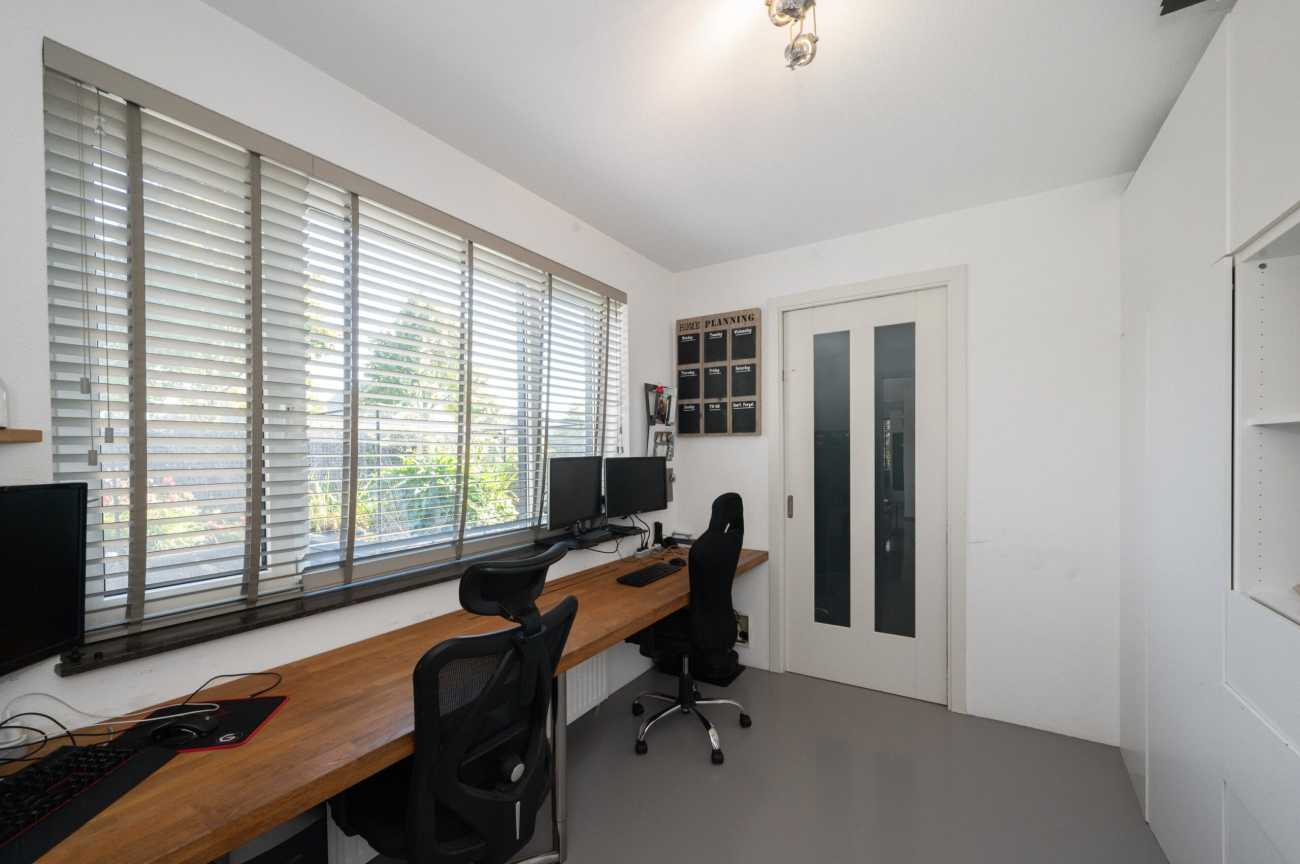 Op de begane grond bevindt zich daarnaast een praktische werkruimte, die u middels schuifdeuren kunt afsluiten. Dit is een ideale ruimte voor thuiswerken of als bv. speelkamer voor de kinderen. Vanuit deze ruimte heeft u tevens toegang tot de bijkeuken/ berging, waar u o.a. u veel spullen kunt opslaan.