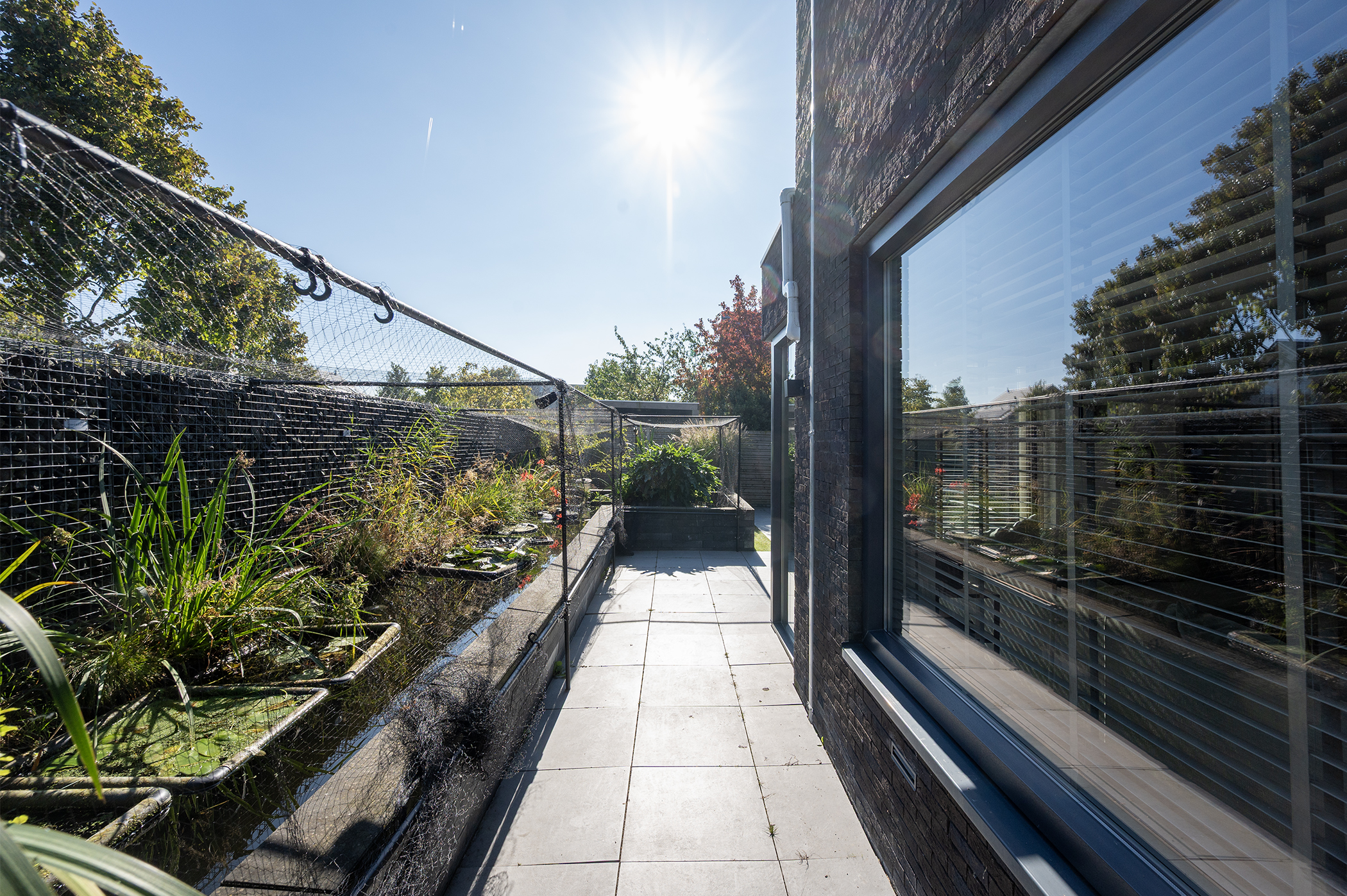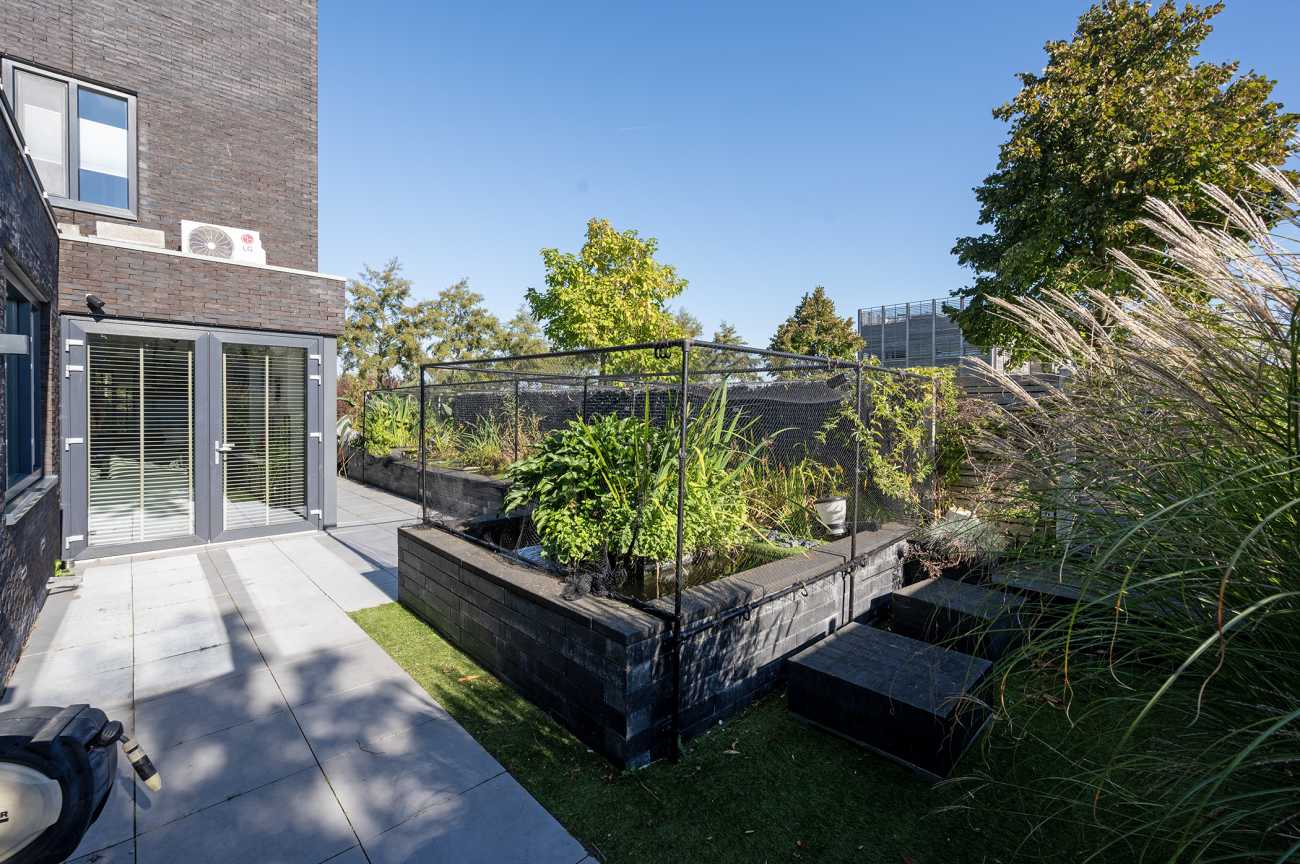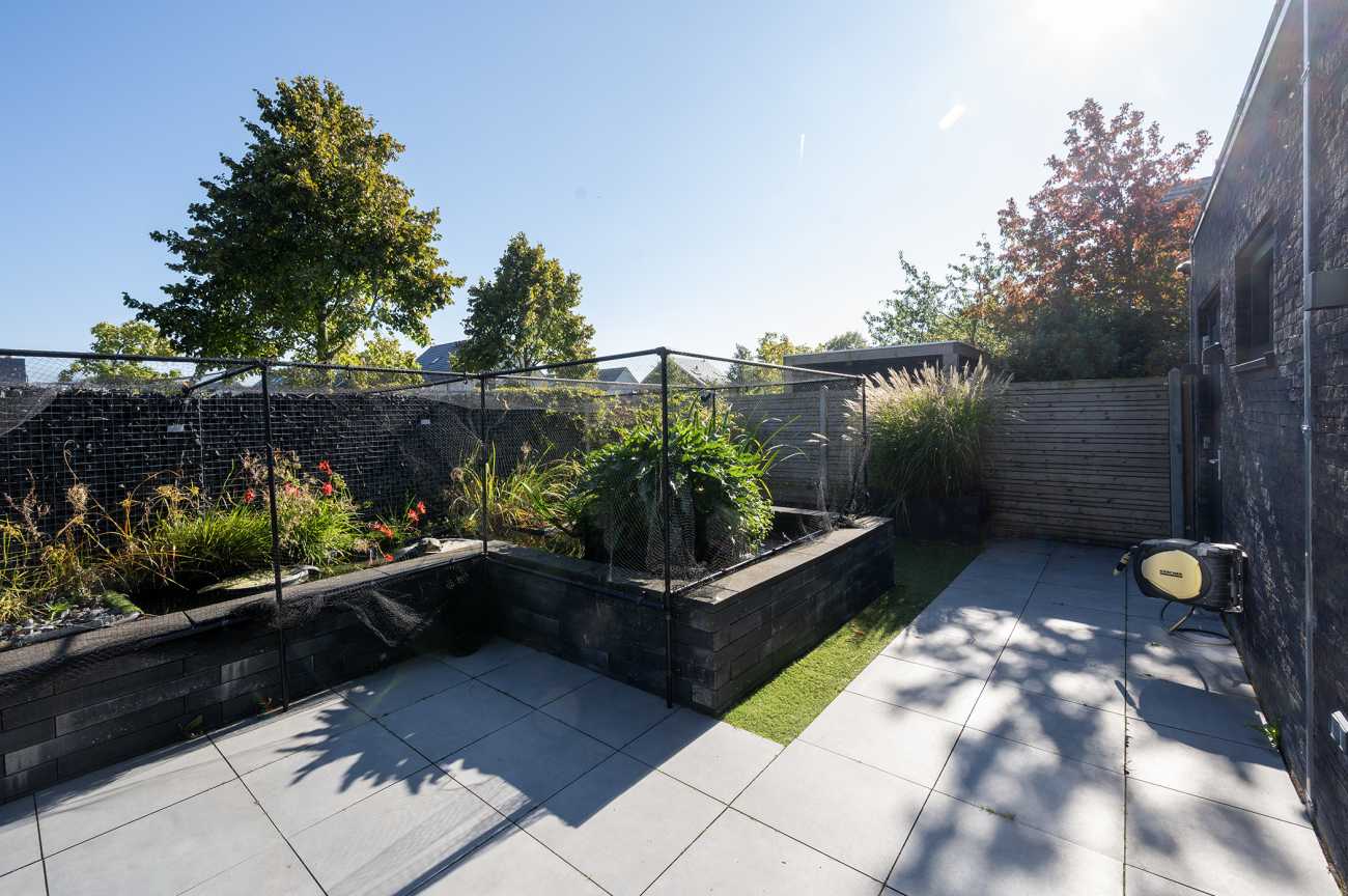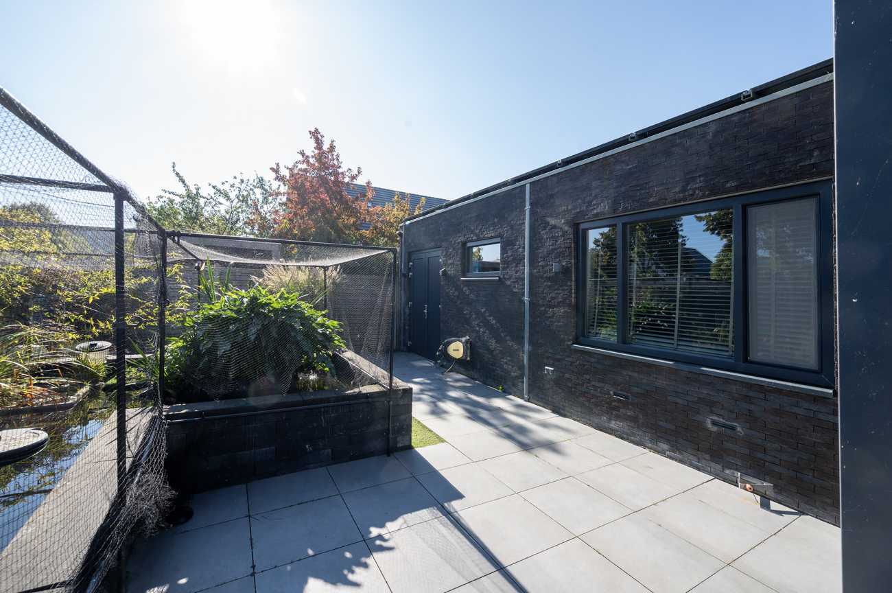 The corner location provides extra space and privacy around the home. The garden is neatly landscaped and features a pond. Here, you have ample room to enjoy outdoor living and experience a great deal of privacy. There is also a storage shed with electricity, ideal for bicycles or garden tools. The shed has double doors and can also be accessed from the inside, making it ideal for use as a utility room.
