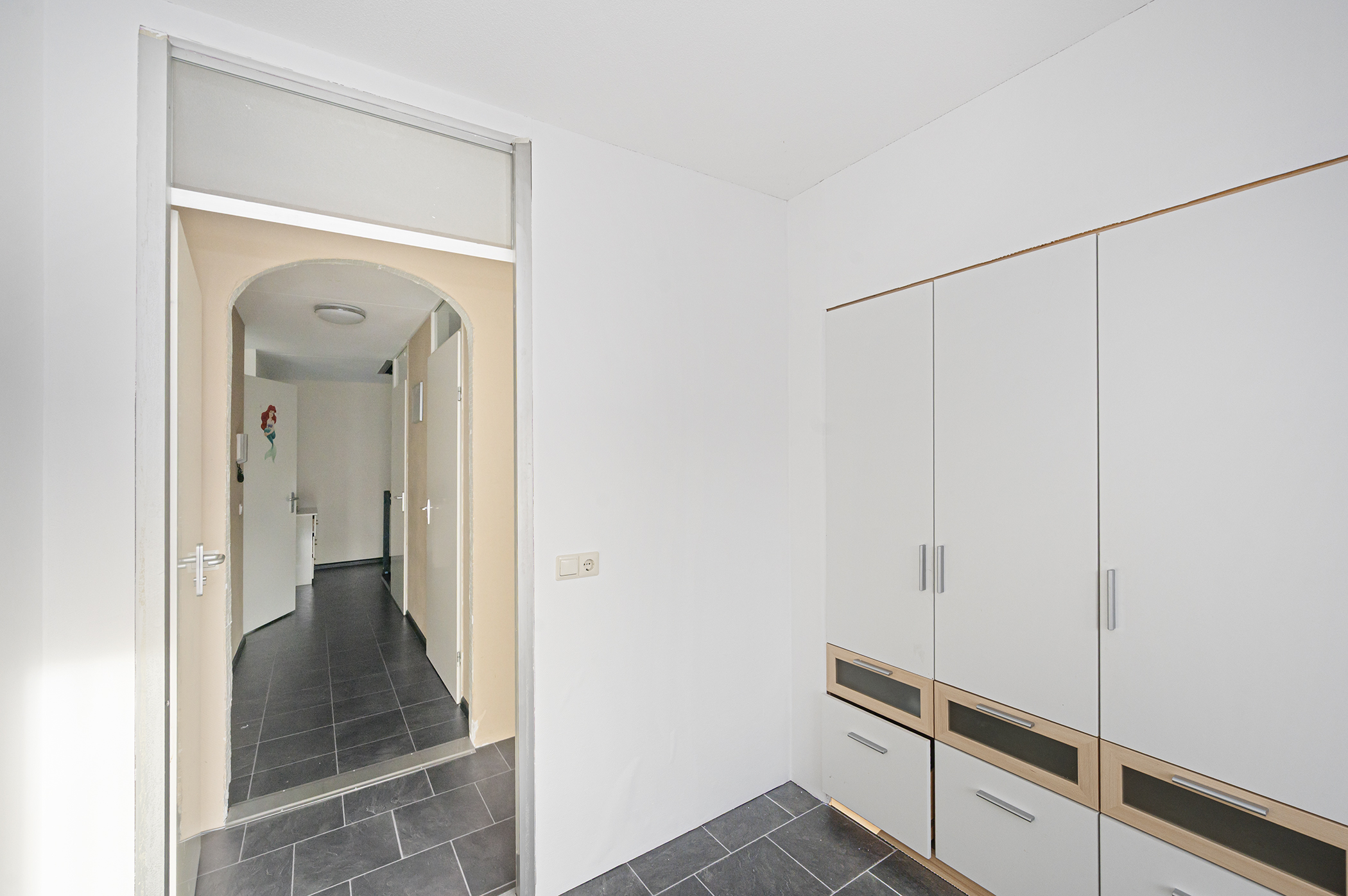 U betreedt de woning de hal, die direct toegang geeft tot de eerste woonruimte en de meterkast. Deze kamer is volledig vrij in te richten, u kunt zelf bepalen hoe u de ruimte gebruikt. Denk bijvoorbeeld aan een gezellige zithoek, een werk- of studeerruimte. In deze ruimte vindt u tevens de trap naar de eerste verdieping. Parallel aan deze kmer bevindt zich een praktische berging, ideaal voor het opbergen van spullen.