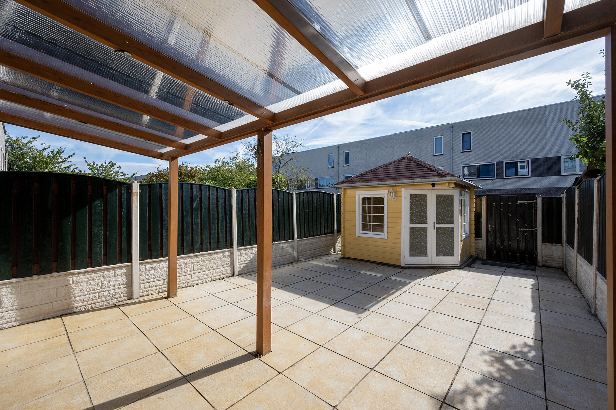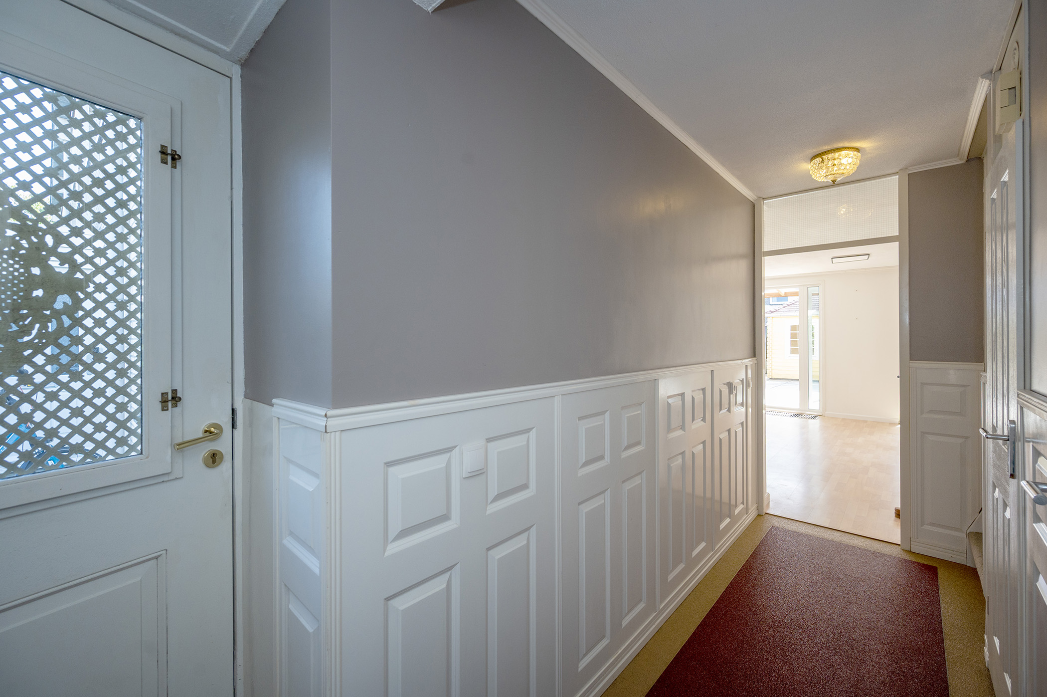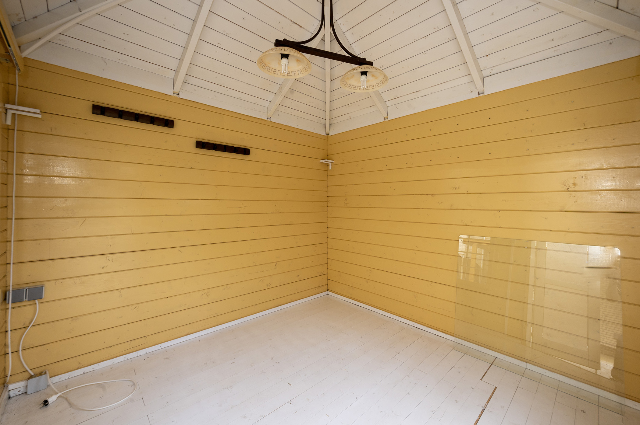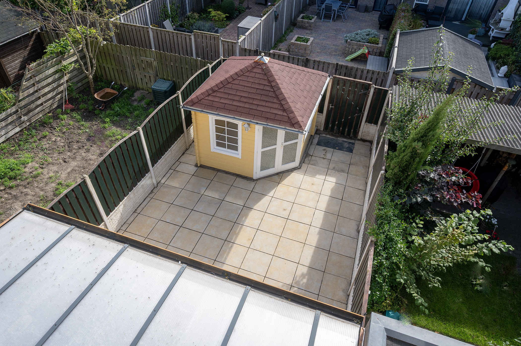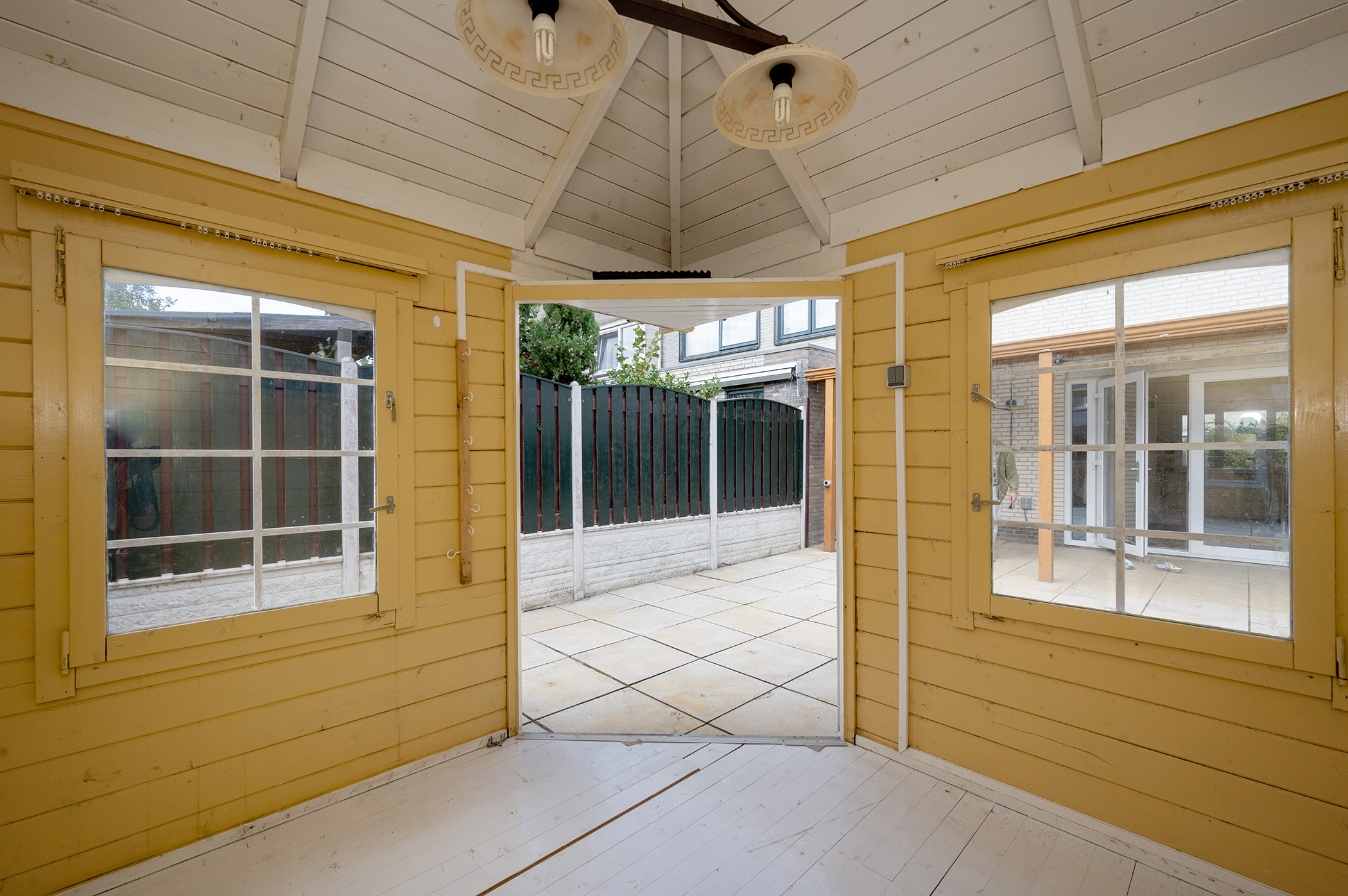 Both the front and back gardens are low-maintenance thanks to their yellow tiled paving. You can also enjoy the sun under the veranda in the back garden. There is also an additional log cabin that can be used as a hobby room (electricity available). At the front of the house is an attached storage shed, accessible from the outside.