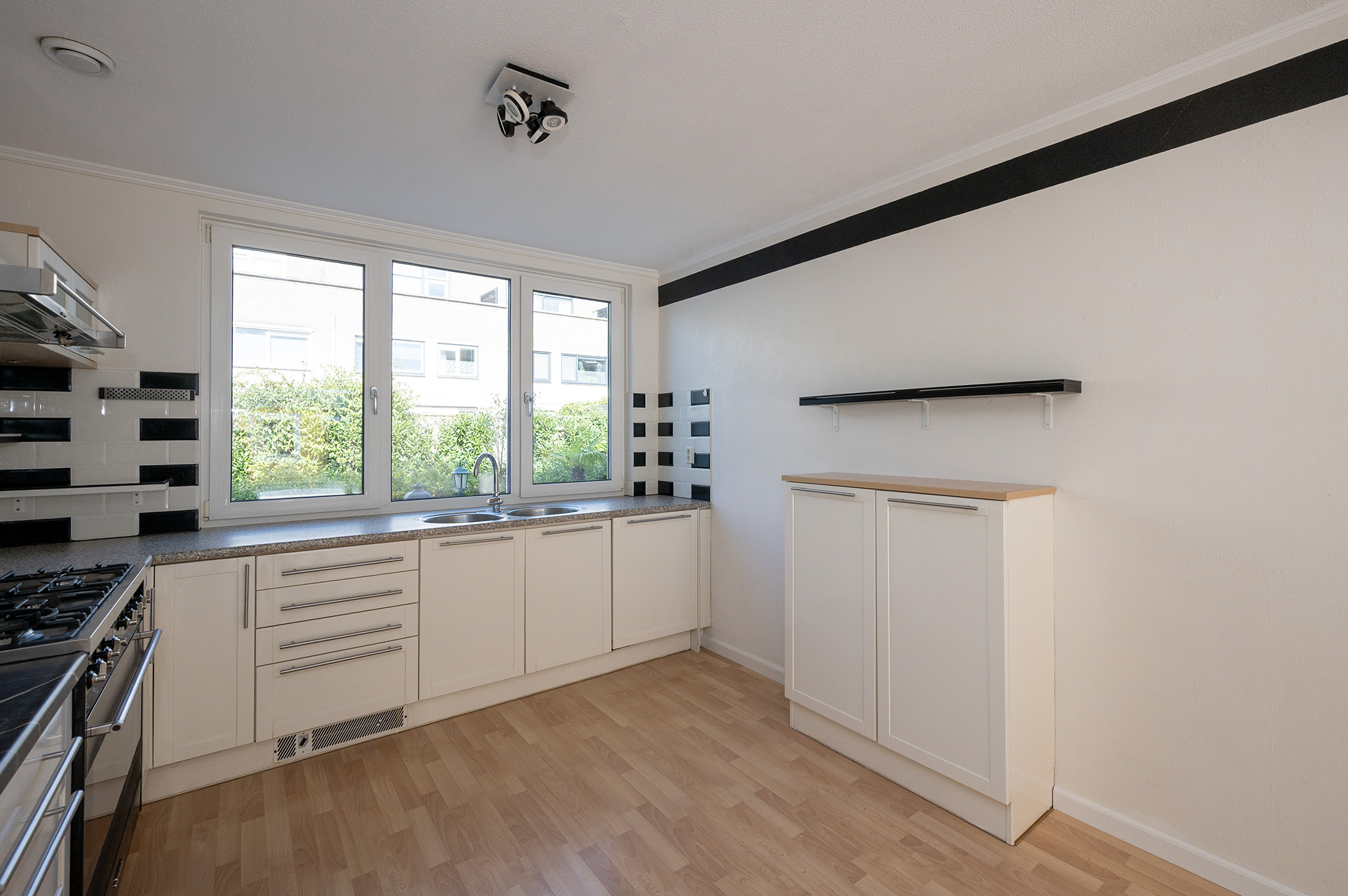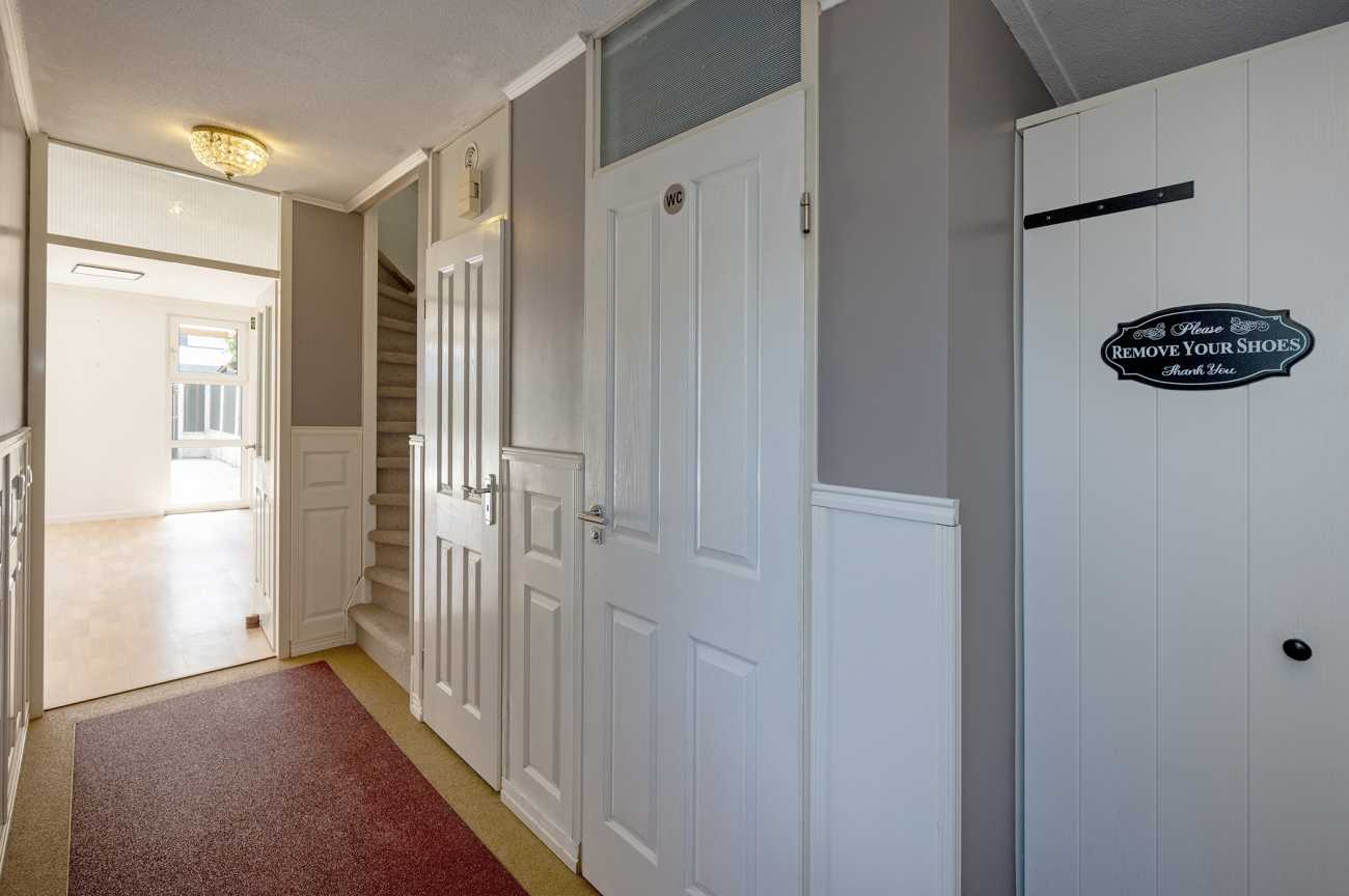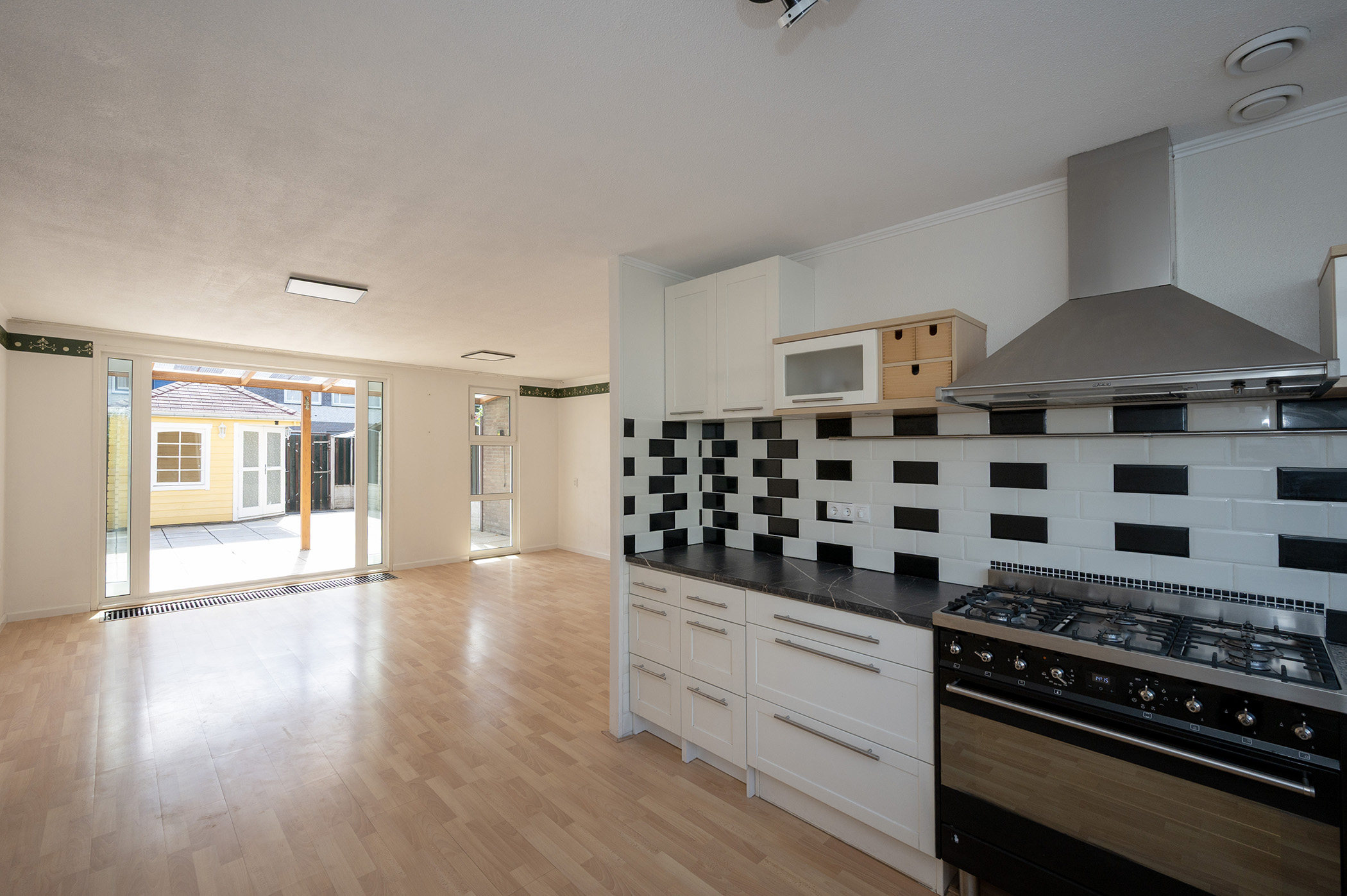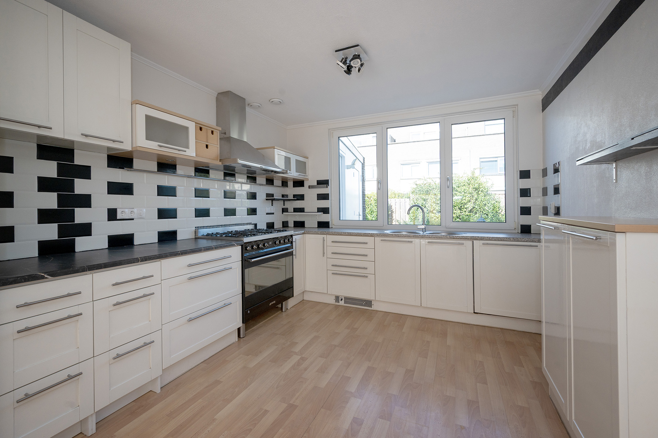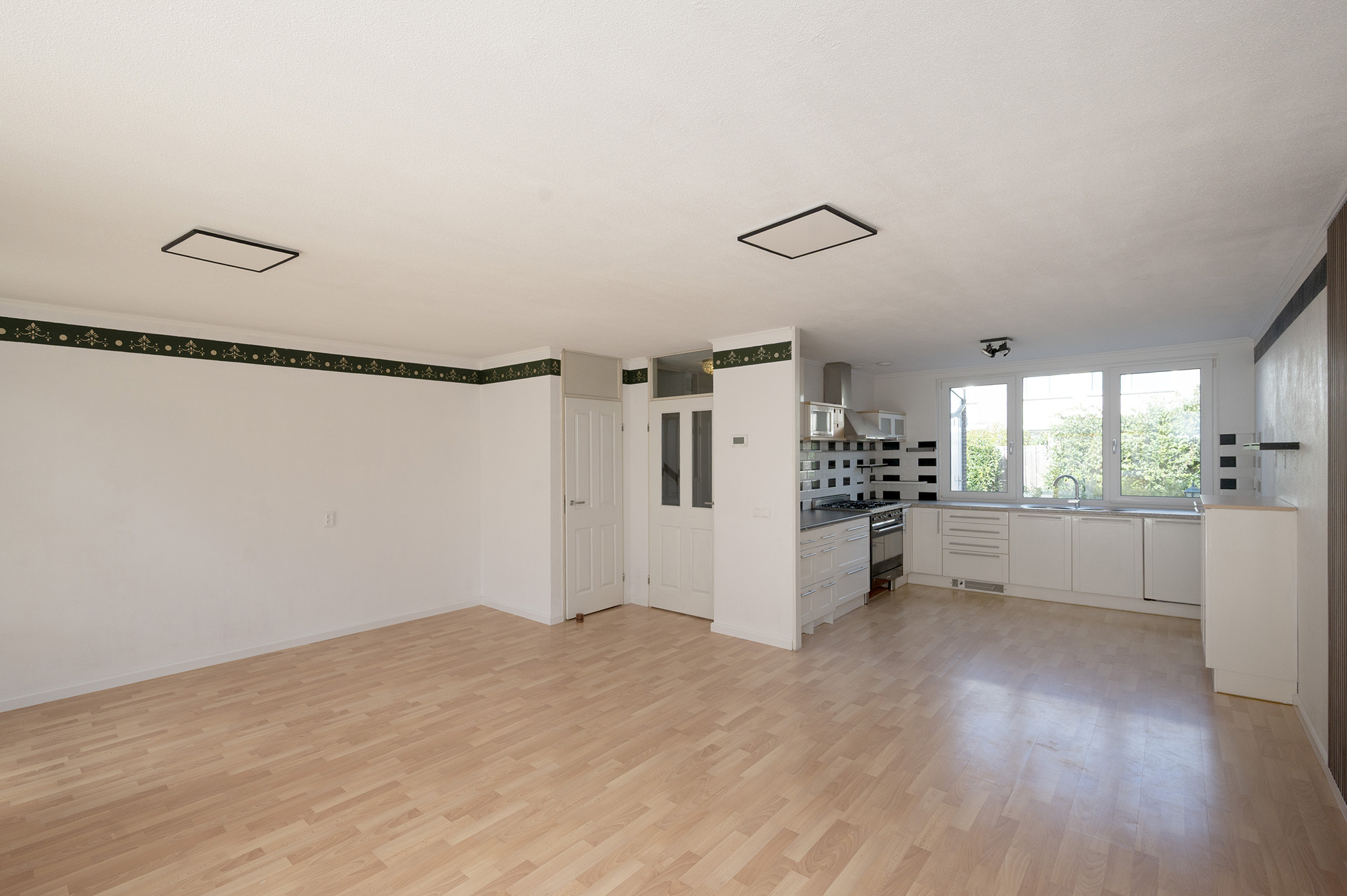 You enter the house on the north side, where a storage room is located next to the front door. The roof of this storage room was recently renovated with new bitumen. The front door has been replaced with a classic gold-wrought iron front door. The hallway provides access to the toilet, the meter cupboard, the staircase to the first floor, and the living room. The living room is very spacious and bright thanks to the large windows and French doors leading to the sunny garden. The open-plan kitchen at the front is equipped with an oven, gas stove, extractor hood, and dishwasher. The kitchen also has two French windows that open.