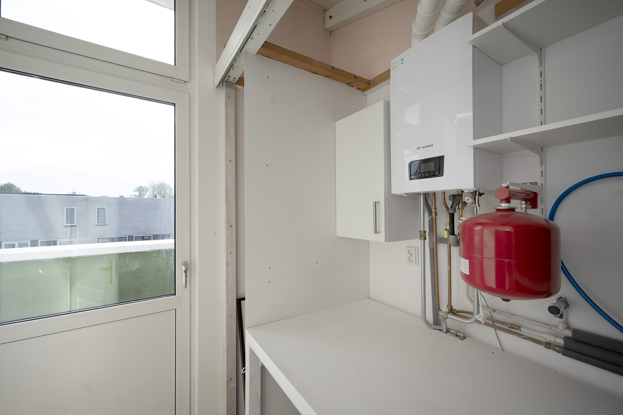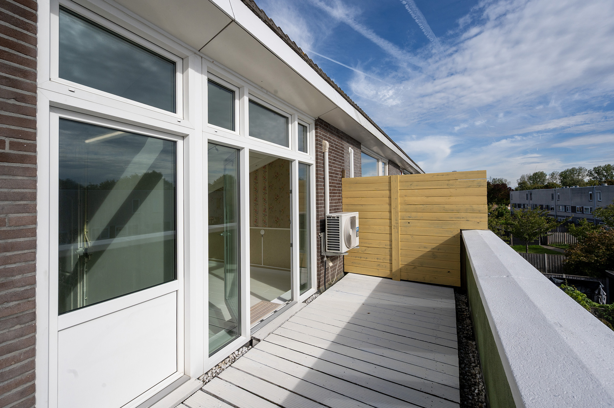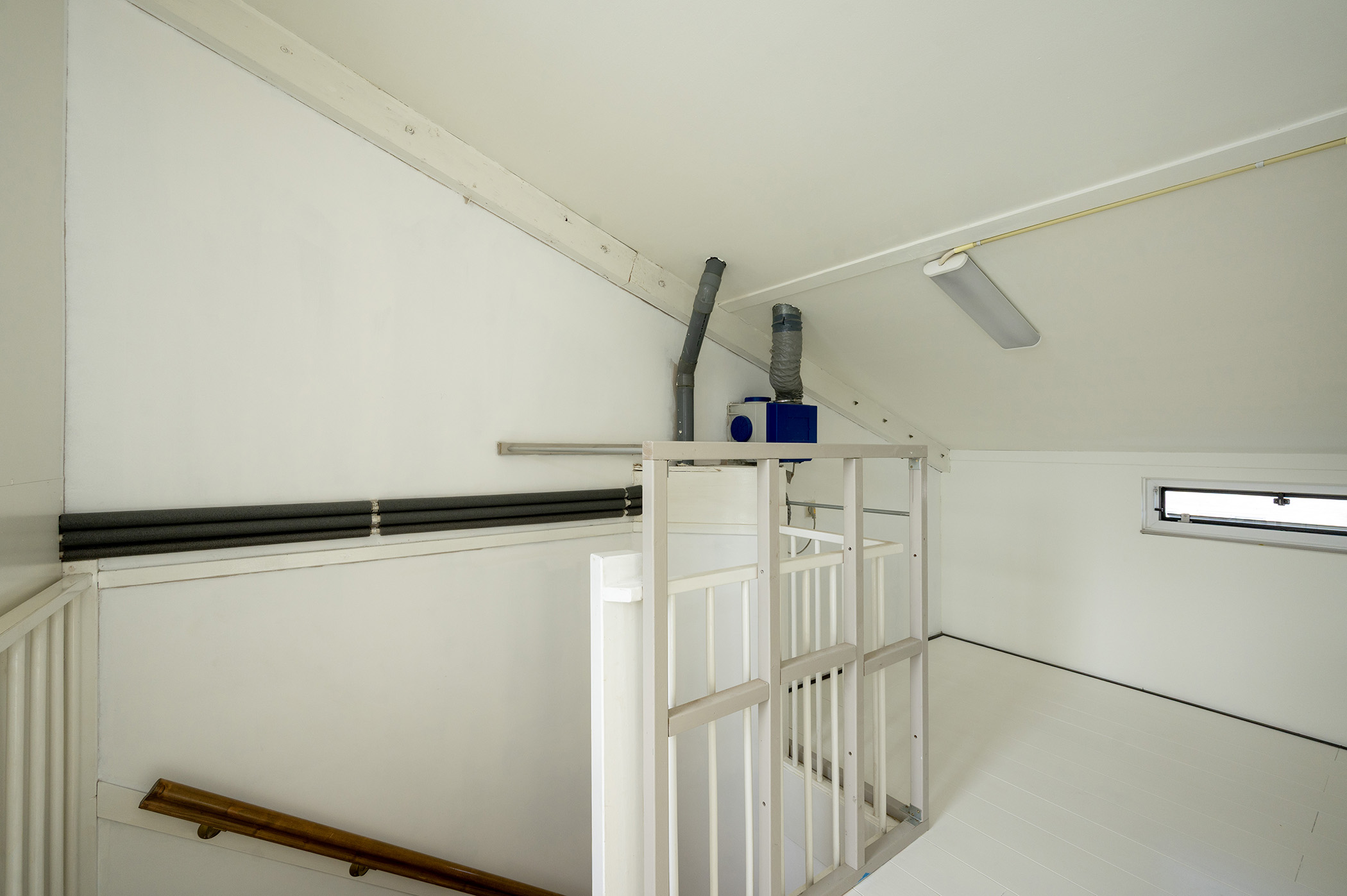 De hoofdslaapkamer bevindt zich op de tweede verdieping, waar u via een eigen deur met ramen direct toegang heeft tot het balkon. De vloer van het dakterras is al gerenoveerd. De hoofdslaapkamer is uitgerust met een Daikin 4,5 kW airconditioning (koelen en verwarmen) en een radiator. Op de zuidhoek van de tweede verdieping bevindt zich een ruime overloop met de nieuwe (2025) Remeha cv-ketel en aansluitingen voor wasmachine en droger, terwijl zich aan de noordkant een extra kleine open ruimte bevindt die kan worden gebruikt als bibliotheek.