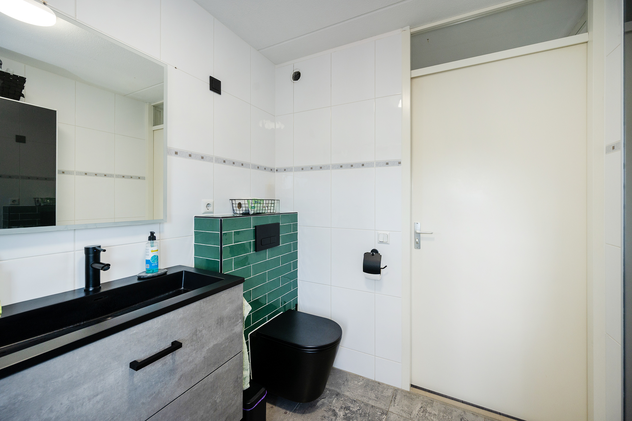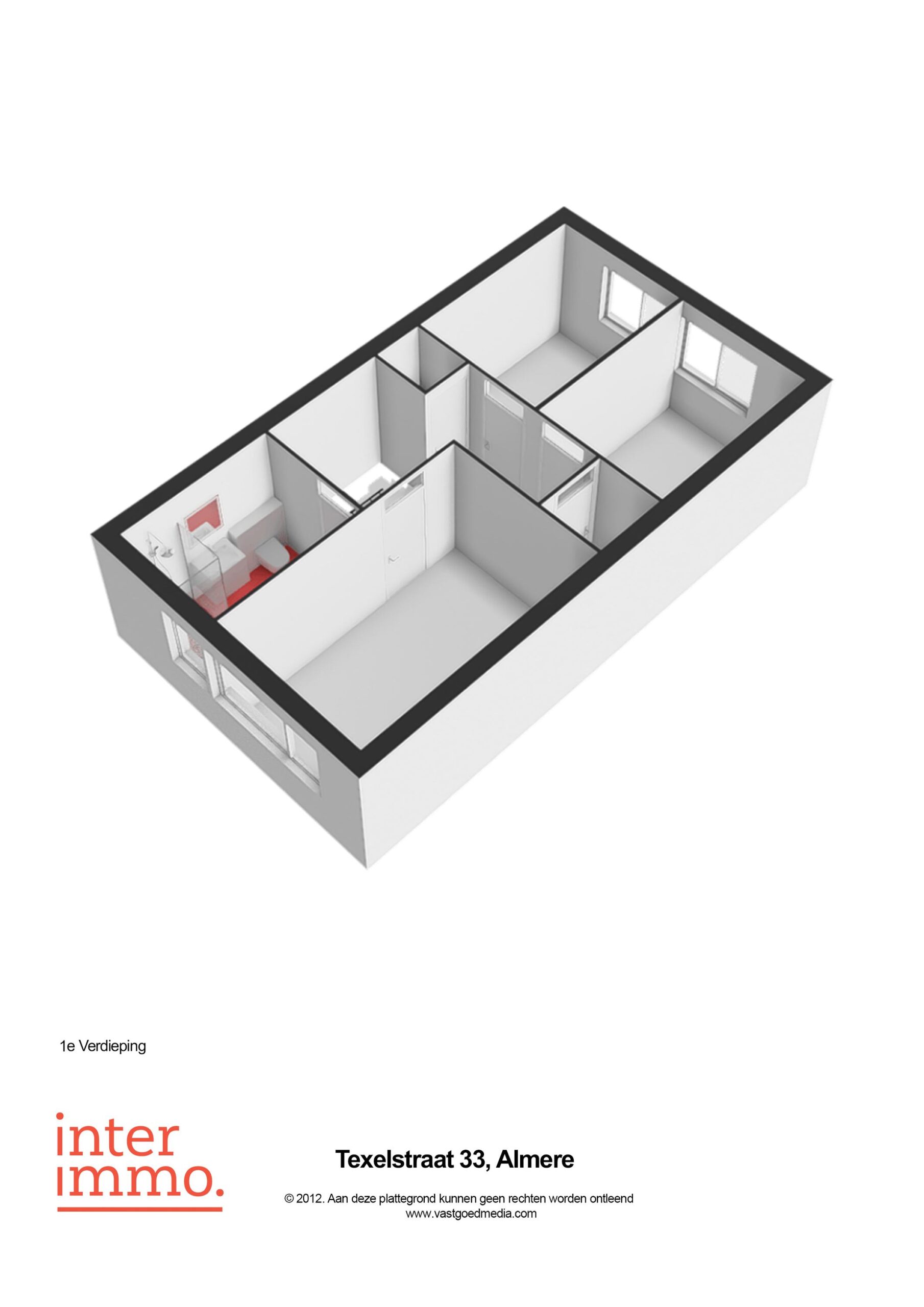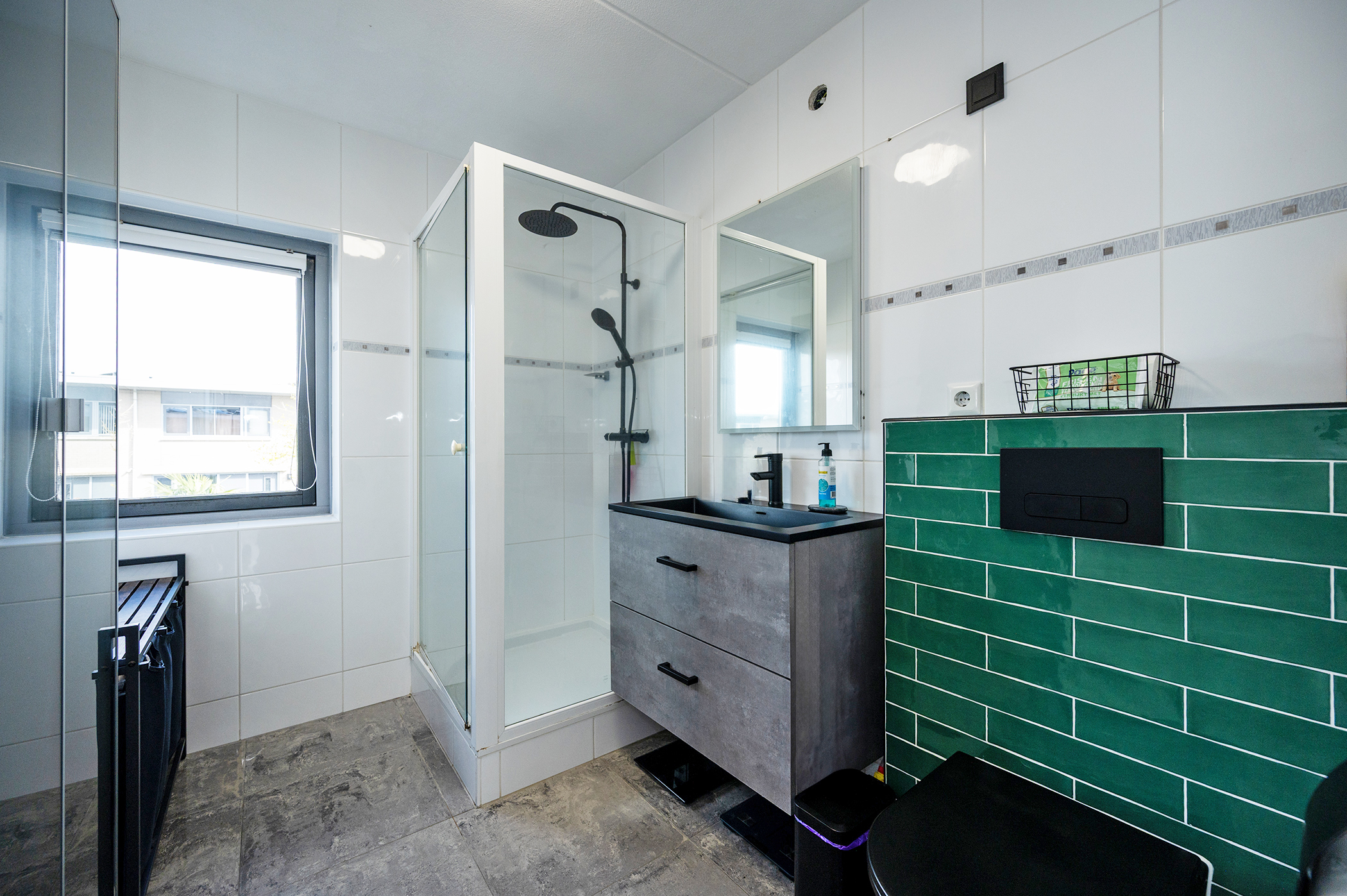 Op de eerste verdieping bevinden zich drie slaapkamers van goed formaat, die elk voldoende ruimte bieden voor een comfortabel gebruik, bijvoorbeeld als hoofdslaapkamer, kinderkamer of werkkamer. Daarnaast is er op deze verdieping een praktische, separate wasruimte aanwezig, evenals een extra opbergruimte waarin de verwarmingsinstallatie is opgesteld. De badkamer is volledig betegeld tot aan het plafond, wat zorgt voor een nette en onderhoudsvriendelijke afwerking. Deze ruimte is compleet ingericht met een douche, een modern wastafelmeubel met opbergruimte en een toilet, waardoor het geheel functioneel en verzorgd oogt. In de afzonderlijke wasruimte bevindt zich de opstelplaats voor een was-droogcombinatie.