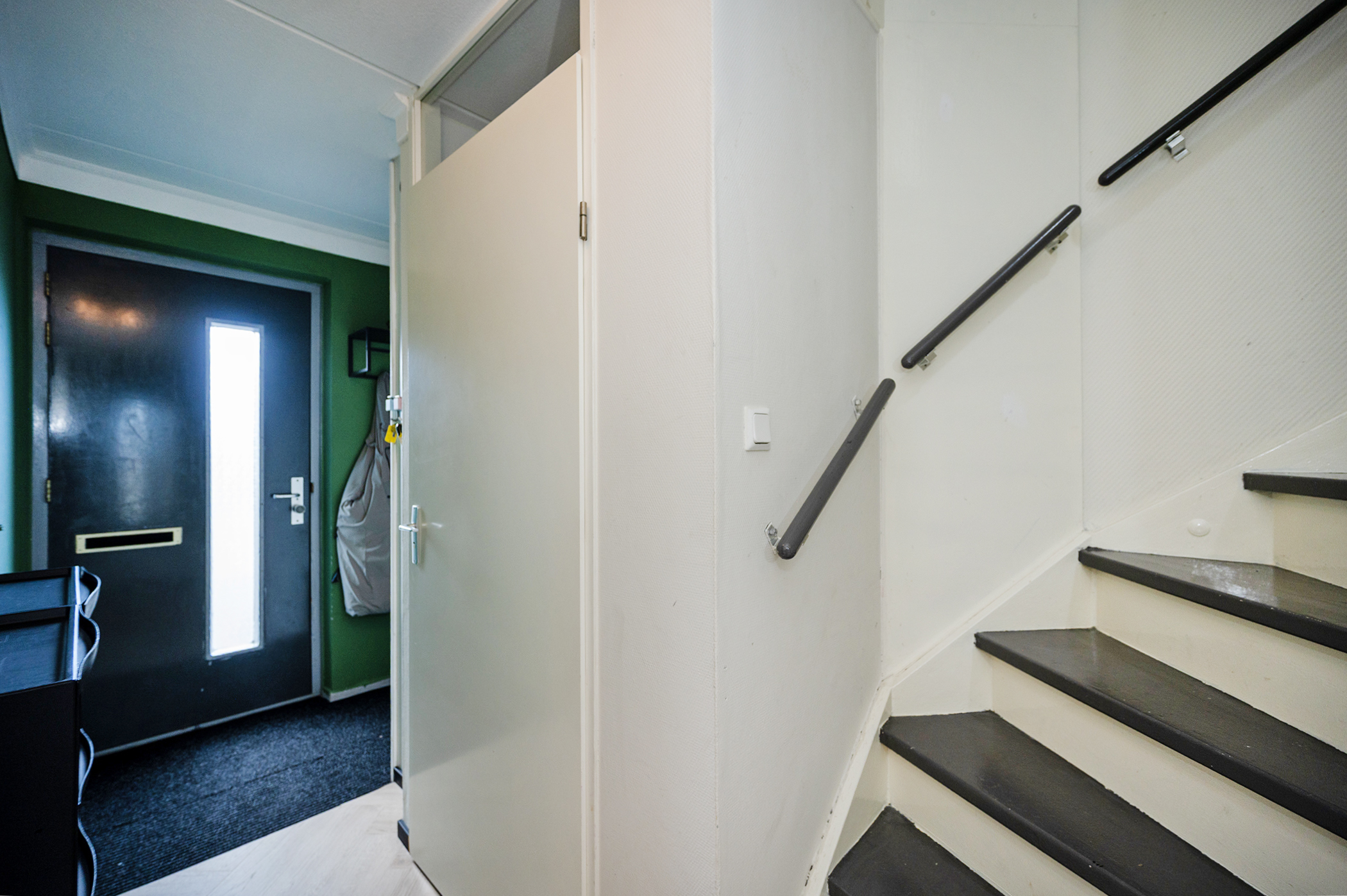 De woning beschikt over een ruime voortuin met toegang tot de entree. In de hal bevinden zich de meterkast, een separaat toilet en de trapopgang naar de eerste verdieping. Het toilet is volledig betegeld en uitgevoerd met een hangend closet en een fonteintje. Bij binnenkomst in de woonkamer valt direct de grote raampartij op, welke zorgt voor een aangename en royale lichtinval. Tevens is de woonkamer voorzien van een recent vernieuwde PVC-visgraatvloer, wat bijdraagt aan de moderne uitstraling.