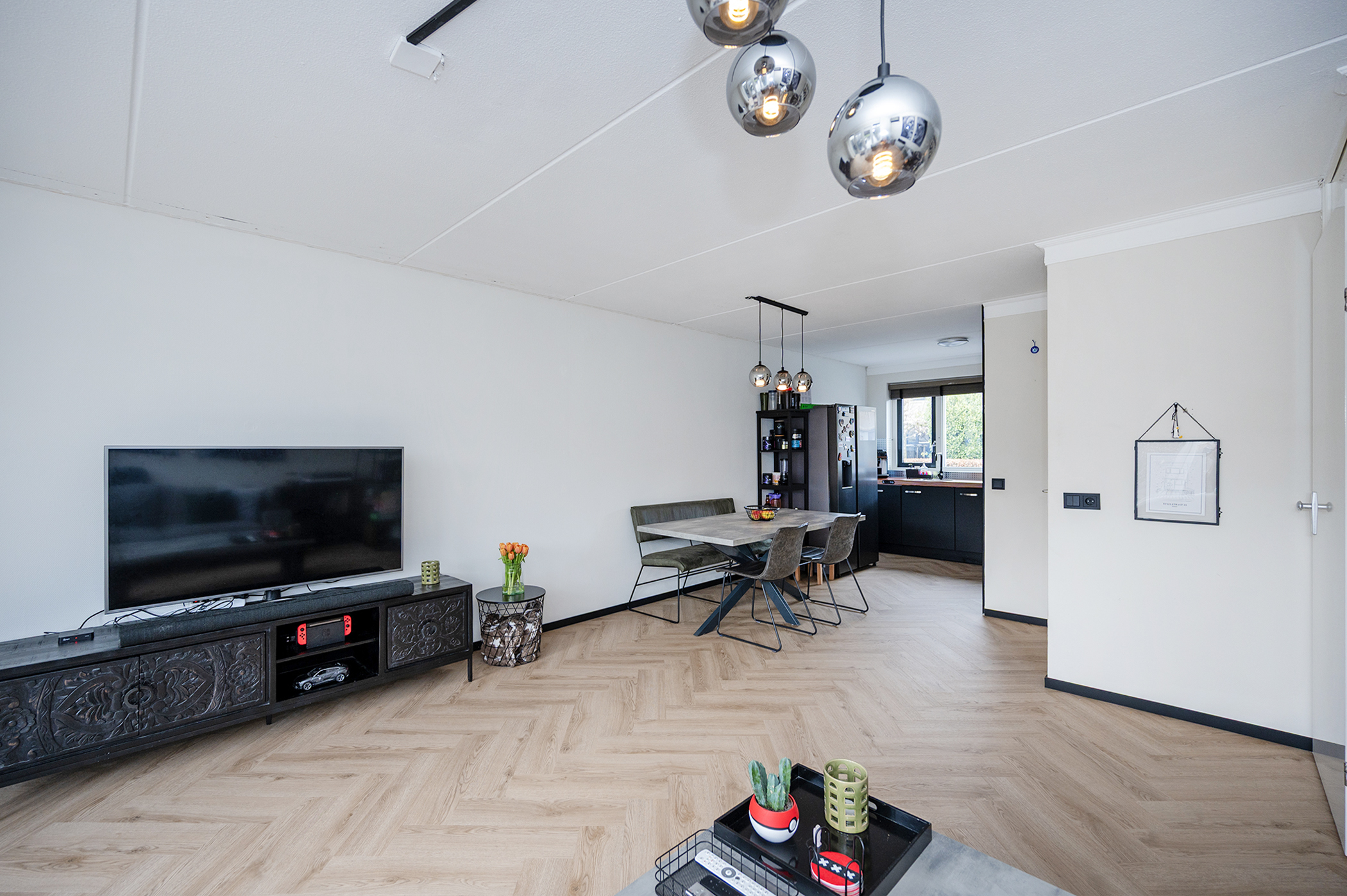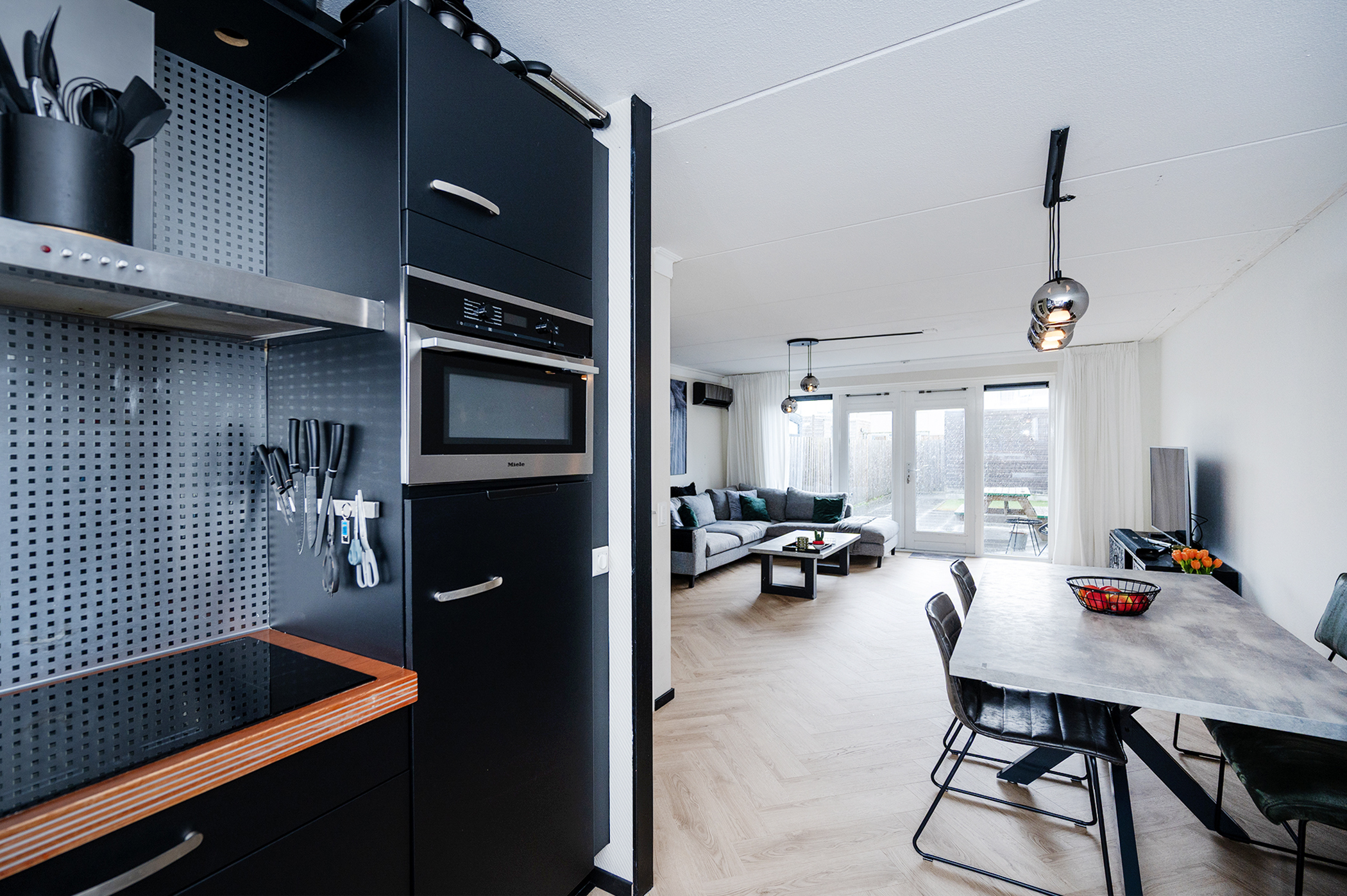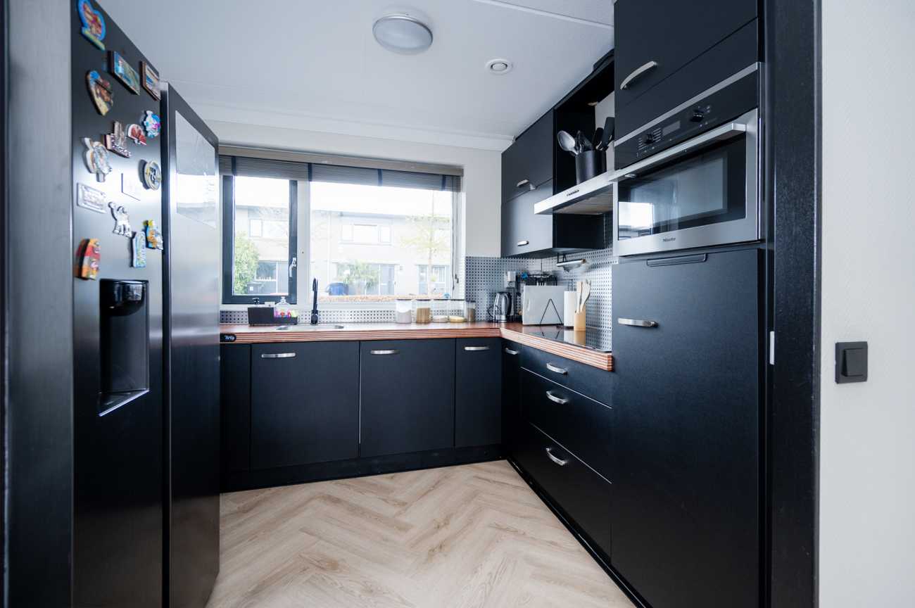 De keuken is gesitueerd aan de voorzijde van de woning en is compleet uitgerust met diverse inbouwapparatuur, waaronder een inductiekookplaat, vaatwasser en een combi oven-magnetron. Daarnaast is er een losse koelkast met vriesvak aanwezig. De keuken kenmerkt zich door een strakke zwarte afwerking, gecombineerd met warme houten accenten.
